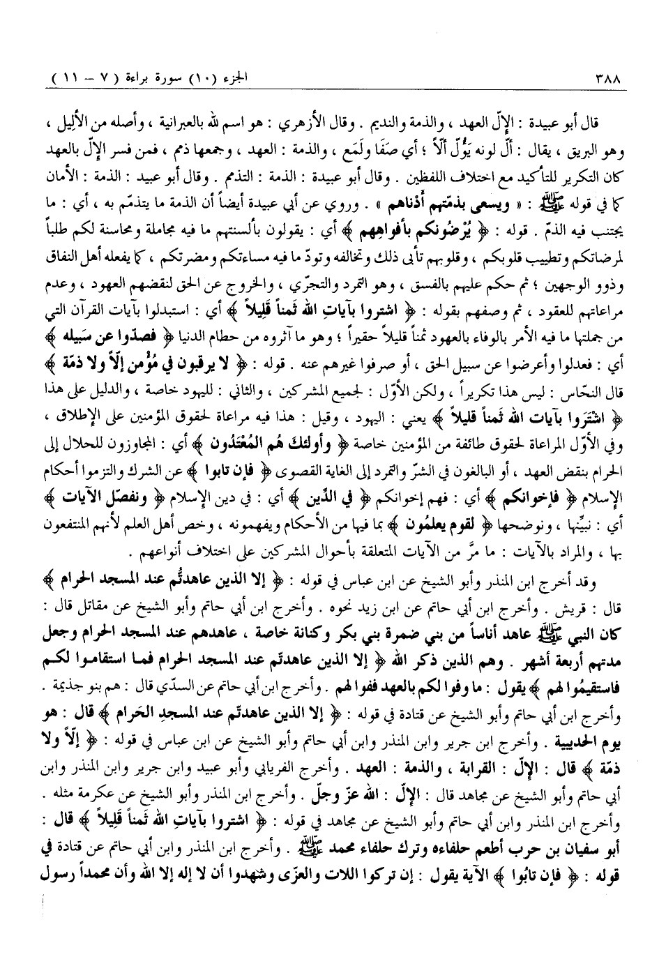 وَأَخْرَجَ ابْنُ أَبِي حَاتِمٍ وَأَبُو الشَّيْخِ عَنْ قَتَادَةَ فِي قَوْلِهِ: إِلَّا الَّذِينَ عاهَدْتُمْ عِنْدَ الْمَسْجِدِ الْحَرامِ قَالَ: هُوَ يَوْمُ الْحُدَيْبِيَةِ. وَأَخْرَجَ ابْنُ جَرِيرٍ وَابْنُ الْمُنْذِرِ وَابْنُ أَبِي حَاتِمٍ وَأَبُو الشَّيْخِ عَنِ ابْنِ عَبَّاسٍ فِي قَوْلِهِ: إِلًّا وَلا ذِمَّةً قَالَ: الْإِلُّ: الْقَرَابَةُ، وَالذِّمَّةُ: الْعَهْدُ. وَأَخْرَجَ الْفِرْيَابِيُّ وَأَبُو عُبَيْدٍ وَابْنُ جَرِيرٍ وَابْنُ الْمُنْذِرِ وَابْنُ أَبِي حَاتِمٍ وَأَبُو الشَّيْخِ عَنْ مُجَاهِدٍ قَالَ: الْإِلُّ: اللَّهُ عَزَّ وَجَلَّ. وَأَخْرَجَ ابْنُ الْمُنْذِرِ وَأَبُو الشَّيْخِ عَنْ عِكْرِمَةَ مِثْلَهُ.