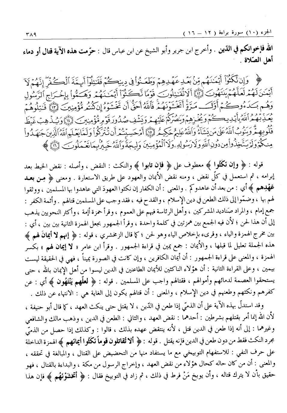 وَقَدِ اسْتُدِلَّ بِهَذِهِ الْآيَةِ عَلَى أَنَّ الذِّمِّيَّ إِذَا طَعَنَ فِي الدِّينِ، لَا يُقْتَلُ حَتَّى يَنْكُثَ الْعَهْدَ، كَمَا قَالَ أَبُو حَنِيفَةَ، لِأَنَّ اللَّهَ إِنَّمَا أَمَرَ بِقَتْلِهِمْ بِشَرْطَيْنِ: أَحَدُهُمَا: نَقْضُ الْعَهْدَ، وَالثَّانِي: الطَّعْنُ فِي الدِّينِ، وَذَهَبَ مَالِكٌ وَالشَّافِعِيُّ وَغَيْرُهُمَا: إِلَى أَنَّهُ إِذَا طَعَنَ فِي الدِّينِ قُتِلَ، لِأَنَّهُ يَنْتَقِضُ عَهْدَهُ بِذَلِكَ، قَالُوا: وَكَذَلِكَ إِذَا حَصَلَ مِنَ الذِّمِّيِّ مُجَرَّدُ النَّكْثِ فَقَطْ مِنْ دُونِ طَعْنٍ فِي الدِّينِ فَإِنَّهُ يُقْتَلُ. قَوْلُهُ: أَلا تُقاتِلُونَ قَوْماً نَكَثُوا أَيْمانَهُمْ الْهَمْزَةُ الدَّاخِلَةُ عَلَى حَرْفِ النَّفْيِ: لِلِاسْتِفْهَامِ التَّوْبِيخِيِّ مَعَ مَا يُسْتَفَادُ مِنْهَا مِنَ التَّحْضِيضِ عَلَى الْقِتَالِ، وَالْمُبَالَغَةِ فِي تَحَقُّقِهِ، وَالْمَعْنَى: أَنَّ مَنْ كَانَ حَالُهُ كَحَالِ هَؤُلَاءِ مِنْ نَقْضِ الْعَهْدِ، وَإِخْرَاجِ الرَّسُولِ مِنْ مَكَّةَ، وَالْبَدَاءَةِ بِالْقِتَالِ، فَهُوَ حَقِيقٌ بِأَنْ لَا يُتْرَكَ قِتَالُهُ، وَأَنْ يُوَبَّخَ مَنْ فَرَّطَ فِي ذَلِكَ، ثُمَّ زَادَ فِي التَّوْبِيخِ فَقَالَ: أَتَخْشَوْنَهُمْ فَإِنَّ هَذَا