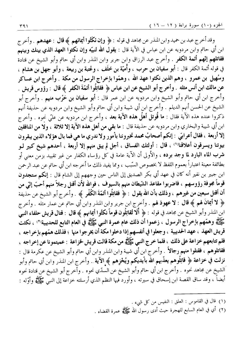 وَقَدْ أَخْرَجَ عَبْدُ بْنُ حُمَيْدٍ وَابْنُ الْمُنْذِرِ عَنْ مُجَاهِدٍ فِي قَوْلِهِ: وَإِنْ نَكَثُوا أَيْمانَهُمْ قَالَ: عَهْدَهُمْ. وَأَخْرَجَ ابْنُ أَبِي حَاتِمٍ وَابْنُ مَرْدَوَيْهِ عَنْ ابْنِ عَبَّاسٍ فِي الْآيَةِ قَالَ: يَقُولُ اللَّهُ لِنَبِيِّهِ وَإِنْ نَكَثُوا الْعَهْدَ الَّذِي بَيْنَكَ وَبَيْنَهُمْ فَقَاتِلْهُمْ إِنَّهُمْ أَئِمَّةُ الْكُفْرِ. وَأَخْرَجَ عَبْدُ الرَّزَّاقِ وَابْنُ جَرِيرٍ وَابْنُ الْمُنْذِرِ وَابْنُ أَبِي حَاتِمٍ وَأَبُو الشَّيْخِ عَنْ قَتَادَةَ فِي قَوْلِهِ أَئِمَّةَ الْكُفْرِ قَالَ: أَبُو سُفْيَانَ بْنُ حَرْبٍ، وَأُمِّيَّةُ بْنُ خَلَفٍ، وَعَتَبَةُ بْنُ رَبِيعَةَ، وَأَبُو جَهِلِ بْنُ هِشَامٍ، وَسُهَيْلُ بْنُ عَمْرٍو، وَهُمُ الَّذِينَ نَكَثُوا عَهْدَ اللَّهِ، وَهَمُّوا بِإِخْرَاجِ الرَّسُولِ مِنْ مَكَّةَ. وَأَخْرَجَ ابْنُ عَسَاكِرَ عَنْ مالك ابن أَنَسٍ مِثْلَهُ. وَأَخْرَجَ أَبُو الشَّيْخِ عَنِ ابْنِ عَبَّاسٍ فَقاتِلُوا أَئِمَّةَ الْكُفْرِ قَالَ: رُؤُوسُ قُرَيْشٍ.