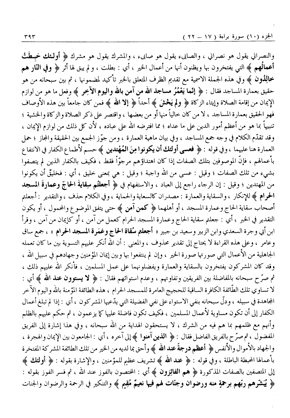 والنصراني يقول هو نصراني، والصابئ، وَالْمُشْرِكُ يَقُولُ هُوَ مُشْرِكٌ أُولئِكَ حَبِطَتْ أَعْمالُهُمْ الَّتِي يَفْتَخِرُونَ بِهَا وَيَظُنُّونَ أَنَّهَا مِنْ أَعْمَالِ الْخَيْرِ، أَيْ: بَطَلَتْ، وَلَمْ يَبْقَ لَهَا أَثَرٌ وَفِي النَّارِ هُمْ خالِدُونَ وَفِي هَذِهِ الْجُمْلَةِ الِاسْمِيَّةِ مَعَ تَقْدِيمِ الظَّرْفِ الْمُتَعَلِّقِ بِالْخَبَرِ تَأْكِيدٌ لِمَضْمُونِهَا، ثُمَّ بَيْنَ سُبْحَانِهِ مَنْ هُوَ حَقِيقٌ بعمارة المساجد فَقَالَ: إِنَّما يَعْمُرُ مَساجِدَ اللَّهِ مَنْ آمَنَ بِاللَّهِ وَالْيَوْمِ الْآخِرِ وَفَعَلَ مَا هُوَ مِنْ لَوَازِمِ الْإِيمَانِ مِنْ إِقَامَةِ الصَّلَاةِ وَإِيتَاءِ الزَّكَاةِ وَلَمْ يَخْشَ أَحَدًا إِلَّا اللَّهَ فَمَنْ كَانَ جَامِعًا بَيْنَ هَذِهِ الْأَوْصَافِ فَهُوَ الْحَقِيقُ بِعِمَارَةِ الْمَسَاجِدِ، لَا مَنْ كَانَ خَالِيًا مِنْهَا أَوْ مِنْ بَعْضِهَا، وَاقْتَصَرَ عَلَى ذِكْرِ الصَّلَاةِ وَالزَّكَاةِ وَالْخَشْيَةِ تَنْبِيهًا بِمَا هُوَ مِنْ أَعْظَمِ أُمُورِ الدِّينِ عَلَى مَا عَدَاهُ مِمَّا افْتَرَضَهُ اللَّهُ عَلَى عِبَادِهِ، لِأَنَّ كُلَّ ذَلِكَ مِنْ لَوَازِمَ الْإِيمَانِ، وَقَدْ تَقَدَّمَ الْكَلَامُ فِي وَجْهِ جَمْعِ الْمَسَاجِدِ، وَفِي بَيَانِ مَاهِيَّةِ الْعِمَارَةِ، وَمَنْ جَوَّزَ الْجَمْعَ بَيْنَ الْحَقِيقَةِ وَالْمَجَازِ حَمَلَ الْعِمَارَةَ هُنَا عَلَيْهِمَا، وَفِي قَوْلِهِ: فَعَسى أُولئِكَ أَنْ يَكُونُوا مِنَ الْمُهْتَدِينَ حَسْمٌ لِأَطْمَاعِ الْكُفَّارِ فِي الِانْتِفَاعِ بِأَعْمَالِهِمْ، فَإِنَّ الْمَوْصُوفِينَ بِتِلْكَ الصِّفَاتِ إِذَا كَانَ اهْتِدَاؤُهُمْ مَرْجُوًّا فَقَطْ، فَكَيْفَ بِالْكُفَّارِ الَّذِينَ لَمْ يَتَّصِفُوا بِشَيْءٍ مِنْ تِلْكَ الصِّفَاتِ وَقِيلَ: عَسَى مِنَ اللَّهِ وَاجِبَةٌ وَقِيلَ: هِيَ بِمَعْنَى خَلِيقٍ، أَيْ: فَخَلِيقٌ أَنْ يَكُونُوا مِنَ الْمُهْتَدِينَ وَقِيلَ: إِنَّ الرَّجَاءَ رَاجِعٌ إِلَى الْعِبَادِ، وَالِاسْتِفْهَامُ فِي أَجَعَلْتُمْ سِقايَةَ الْحاجِّ وَعِمارَةَ الْمَسْجِدِ الْحَرامِ لِلْإِنْكَارِ، وَالسِّقَايَةُ وَالْعِمَارَةُ: مَصْدَرَانِ كَالسِّعَايَةِ وَالْحِمَايَةِ، وَفِي الْكَلَامِ حَذْفٌ، وَالتَّقْدِيرُ: أَجَعَلْتُمْ أَصْحَابَ سِقَايَةِ الْحَاجِّ وَعِمَارَةِ الْمَسْجِدِ، أَوْ أَهْلَهُمَا كَمَنْ آمَنَ حَتَّى يَتَّفِقَ الْمَوْضُوعُ وَالْمَحْمُولَ، أَوْ يَكُونُ التَّقْدِيرُ فِي الْخَبَرِ، أَيْ: جَعَلْتُمْ سِقَايَةَ الْحَاجِّ وَعِمَارَةَ الْمَسْجِدِ الْحَرَامِ كَعَمَلِ مَنْ آمَنَ، أَوْ كَإِيمَانِ مَنْ آمَنَ، وقرأ ابن أبي وجرة السَّعْدِيُّ وَابْنُ الزُّبَيْرِ وَسَعِيدُ بْنُ جُبَيْرٍ «أَجَعَلْتُمْ سُقَاةَ الْحَاجِّ وَعَمَرَةَ الْمَسْجِدِ الْحَرَامِ» ، جَمْعُ سَاقٍ وَعَامِرٍ، وَعَلَى هَذِهِ الْقِرَاءَةِ لَا يُحْتَاجُ إِلَى تَقْدِيرِ مَحْذُوفٍ، وَالْمَعْنَى: أَنَّ اللَّهَ أَنْكَرَ عَلَيْهِمُ التَّسْوِيَةَ بَيْنَ مَا كَانَ تَعْمَلُهُ الْجَاهِلِيَّةُ مِنَ الْأَعْمَالِ الَّتِي صَوَّرَتْهَا صُورَةُ الْخَيْرِ، وَإِنْ لَمْ يَنْتَفِعُوا بِهَا وَبَيْنَ إِيمَانِ الْمُؤْمِنِينَ وَجِهَادِهِمْ فِي سَبِيلِ اللَّهِ، وَقَدْ كَانَ الْمُشْرِكُونَ يَفْتَخِرُونَ بِالسِّقَايَةِ وَالْعِمَارَةِ وَيُفَضِّلُونَهُمَا عَلَى عَمَلِ الْمُسْلِمِينَ، فَأَنْكَرَ اللَّهُ عَلَيْهِمْ ذَلِكَ، ثُمَّ صَرَّحَ سُبْحَانَهُ بِالْمُفَاضَلَةِ بَيْنَ الْفَرِيقَيْنِ وَتَفَاوُتِهِمْ، وَعَدَمِ اسْتِوَائِهِمْ فَقَالَ: لَا يَسْتَوُونَ عِنْدَ اللَّهِ أَيْ: