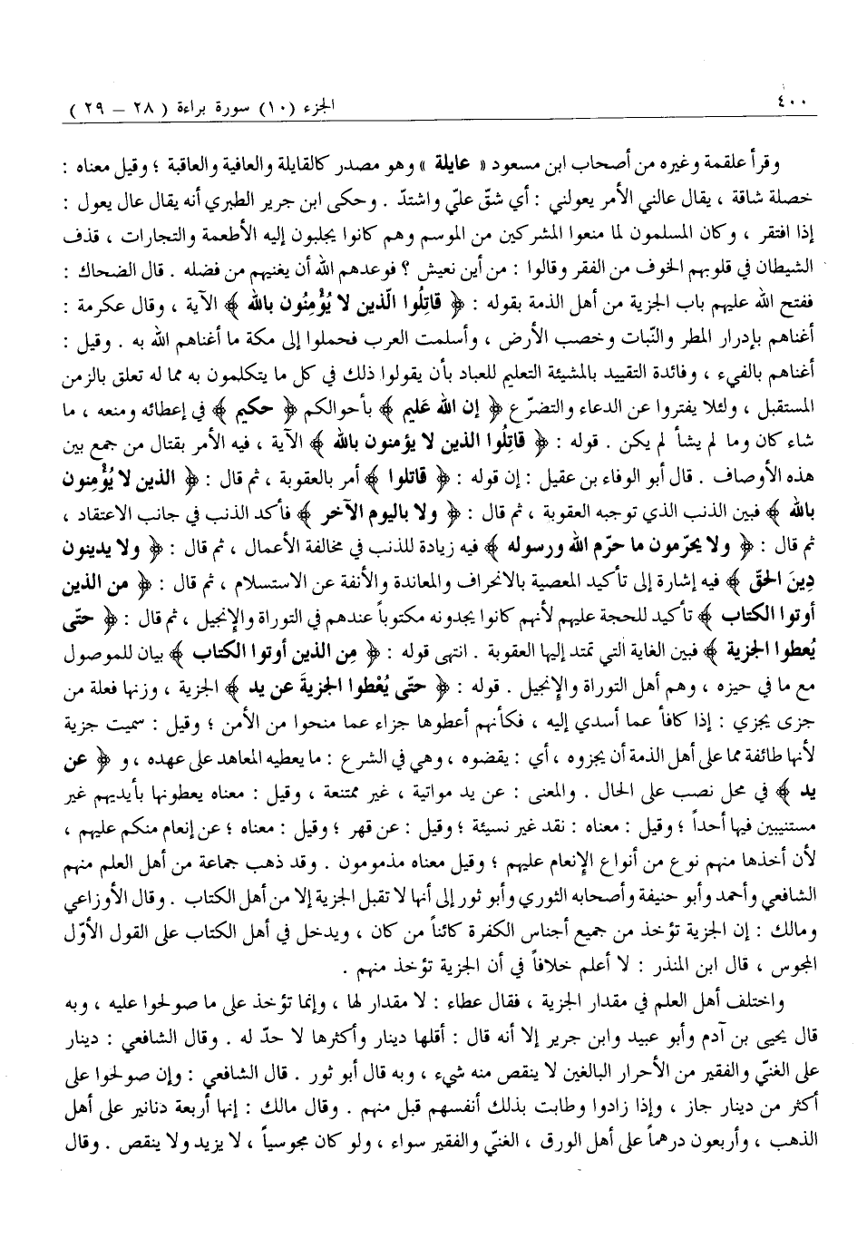 أَغْنَاهُمْ بِالْفَيْءِ، وَفَائِدَةُ التَّقْيِيدِ بِالْمَشِيئَةِ التَّعْلِيمُ لِلْعِبَادِ بِأَنْ يَقُولُوا ذَلِكَ فِي كُلِّ مَا يَتَكَلَّمُونَ بِهِ مِمَّا لَهُ تَعَلُّقٌ بِالزَّمَنِ الْمُسْتَقْبَلِ، وَلِئَلَّا يَفْتُرُوا عَنِ الدُّعَاءِ وَالتَّضَرُّعِ إِنَّ اللَّهَ عَلِيمٌ بِأَحْوَالِكُمْ حَكِيمٌ فِي إِعْطَائِهِ وَمَنْعِهِ، مَا شَاءَ كَانَ وَمَا لَمْ يَشَأْ لَمْ يَكُنْ. قَوْلُهُ: قاتِلُوا الَّذِينَ لَا يُؤْمِنُونَ بِاللَّهِ الْآيَةَ، فِيهِ الْأَمْرُ بِقِتَالِ مَنْ جَمَعَ بَيْنَ هَذِهِ الْأَوْصَافِ. قَالَ أَبُو الْوَفَاءِ بْنُ عَقِيلٍ: إِنَّ قَوْلَهُ: قاتِلُوا أَمْرٌ بِالْعُقُوبَةِ، ثُمَّ قَالَ: الَّذِينَ لَا يُؤْمِنُونَ بِاللَّهِ فَبَيَّنَ الذَّنْبَ الَّذِي تُوجِبُهُ الْعُقُوبَةُ، ثُمَّ قَالَ: وَلا بِالْيَوْمِ الْآخِرِ فَأَكَّدَ الذَّنْبَ فِي جَانِبِ الِاعْتِقَادِ، ثُمَّ قَالَ: وَلا يُحَرِّمُونَ مَا حَرَّمَ اللَّهُ وَرَسُولُهُ فِيهِ زِيَادَةٌ لِلذَّنْبِ فِي مُخَالَفَةِ الْأَعْمَالِ، ثُمَّ قَالَ: وَلا يَدِينُونَ دِينَ الْحَقِّ فِيهِ إِشَارَةٌ إِلَى تَأْكِيدِ الْمَعْصِيَةِ بِالِانْحِرَافِ وَالْمُعَانَدَةِ وَالْأَنَفَةِ عَنِ الِاسْتِسْلَامِ، ثُمَّ قَالَ: مِنَ الَّذِينَ أُوتُوا الْكِتابَ تَأْكِيدٌ لِلْحُجَّةِ عَلَيْهِمْ لِأَنَّهُمْ كَانُوا يَجِدُونَهُ مَكْتُوبًا عِنْدَهُمْ فِي التَّوْرَاةِ وَالْإِنْجِيلِ، ثُمَّ قَالَ: حَتَّى يُعْطُوا الْجِزْيَةَ فَبَيَّنَ الْغَايَةَ الَّتِي تَمْتَدُّ إِلَيْهَا الْعُقُوبَةُ. انْتَهَى قَوْلُهُ: مِنَ الَّذِينَ أُوتُوا الْكِتابَ بَيَانٌ لِلْمَوْصُولِ مَعَ مَا فِي حَيِّزِهِ، وَهُمْ أَهْلُ التَّوْرَاةِ وَالْإِنْجِيلِ. قَوْلُهُ: حَتَّى يُعْطُوا الْجِزْيَةَ عَنْ يَدٍ الْجِزْيَةُ، وَزْنُهَا فِعْلَةٌ مَنْ جَزَى يَجْزِي: إِذَا كَافَأَ عَمَّا أُسْدِيَ إِلَيْهِ، فَكَأَنَّهُمْ أَعْطَوْهَا جَزَاءً عَمَّا مُنِحُوا مِنَ الْأَمْنِ وَقِيلَ: سُمِّيَتْ جِزْيَةً لِأَنَّهَا طَائِفَةٌ مِمَّا عَلَى أَهْلِ الذِّمَّةِ أَنْ يَجْزُوهُ، أَيْ: يَقْضُوهُ، وَهِيَ فِي الشَّرْعِ: مَا يُعْطِيهِ الْمُعَاهِدُ عَلَى عهده، وعَنْ يَدٍ فِي مَحَلِّ نَصْبٍ عَلَى الْحَالِ. وَالْمَعْنَى: عَنْ يَدٍ مُوَاتِيَةٍ، غَيْرِ مُمْتَنِعَةٍ، وَقِيلَ: مَعْنَاهُ يُعْطُونَهَا بِأَيْدِيهِمْ غَيْرُ مُسْتَنِيبِينَ فِيهَا أَحَدًا وَقِيلَ: مَعْنَاهُ: نَقْدٍ غَيْرِ نَسِيئَةٍ وَقِيلَ: عَنْ قَهْرٍ وَقِيلَ: مَعْنَاهُ عَنْ إِنْعَامٍ مِنْكُمْ عَلَيْهِمْ، لِأَنَّ أَخْذَهَا مِنْهُمْ نَوْعٌ مِنْ أَنْوَاعِ الْإِنْعَامِ عَلَيْهِمْ وَقِيلَ مَعْنَاهُ مَذْمُومُونَ. وَقَدْ ذَهَبَ جَمَاعَةٌ مِنْ أَهْلِ الْعِلْمِ مِنْهُمُ الشَّافِعِيُّ وَأَحْمَدُ وَأَبُو حَنِيفَةَ وأصحابه الثوري وَأَبُو ثَوْرٍ إِلَى أَنَّهَا لَا تُقْبَلُ الْجِزْيَةُ إِلَّا مِنْ أَهْلِ الْكِتَابِ. وَقَالَ الْأَوْزَاعِيُّ وَمَالِكٌ: إِنَّ الْجِزْيَةَ تُؤْخَذُ مِنْ جَمِيعِ أَجْنَاسِ الْكَفَرَةِ كَائِنًا مَنْ كَانَ، وَيَدْخُلُ فِي أَهْلِ الْكِتَابِ عَلَى الْقَوْلِ الْأَوَّلِ الْمَجُوسُ، قَالَ ابْنُ الْمُنْذِرِ: لَا أَعْلَمُ خِلَافًا فِي أَنَّ الْجِزْيَةَ تُؤْخَذُ منهم.