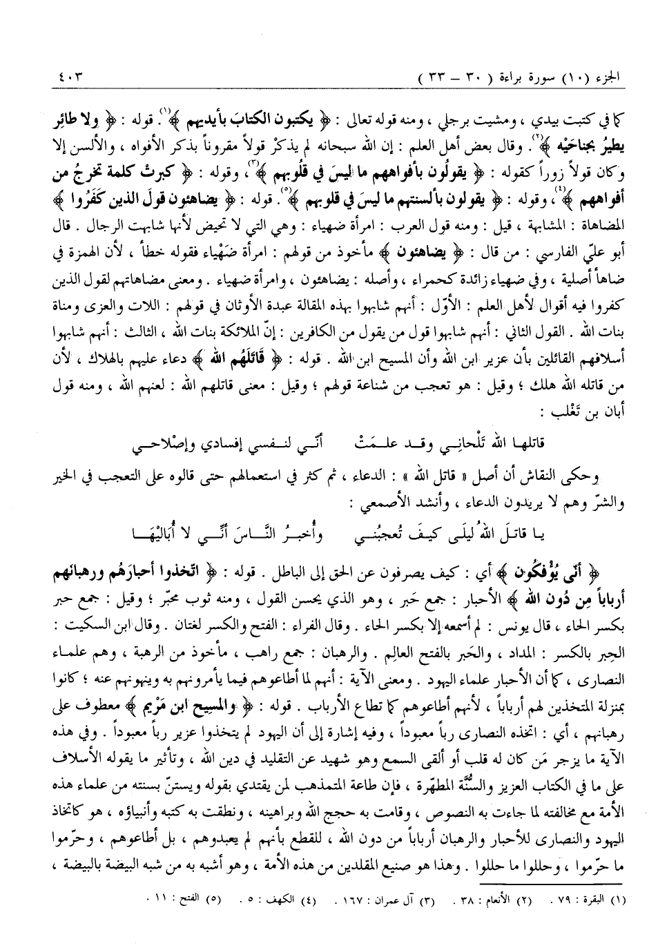 كَمَا فِي كَتَبْتُ بِيَدِي، وَمَشَيْتُ بِرِجْلِي، وَمِنْهُ قوله تعالى: يَكْتُبُونَ الْكِتابَ بِأَيْدِيهِمْ «1» . قوله: وَلا طائِرٍ يَطِيرُ بِجَناحَيْهِ «2» . وَقَالَ بَعْضُ أَهْلِ الْعِلْمِ: إِنَّ اللَّهَ سُبْحَانَهُ لَمْ يَذْكُرْ قَوْلًا مَقْرُونًا بِذِكْرِ الْأَفْوَاهِ، وَالْأَلْسُنِ إِلَّا وَكَانَ قَوْلًا زُورًا كَقَوْلِهِ: يَقُولُونَ بِأَفْواهِهِمْ ما لَيْسَ فِي قُلُوبِهِمْ «3» ، وقوله: كَبُرَتْ كَلِمَةً تَخْرُجُ مِنْ أَفْواهِهِمْ «4» ، وَقَوْلِهِ: يَقُولُونَ بِأَلْسِنَتِهِمْ مَا لَيْسَ فِي قُلُوبِهِمْ «5» . قوله: يُضاهِؤُنَ قَوْلَ الَّذِينَ كَفَرُوا الْمُضَاهَاةُ: الْمُشَابِهَةُ، قِيلَ: وَمِنْهُ قَوْلُ الْعَرَبِ: امْرَأَةٌ ضَهْيَاءُ: وَهِيَ الَّتِي لَا تَحِيضُ لِأَنَّهَا شَابَهَتِ الرِّجَالَ. قَالَ أَبُو عَلِيٍّ الفارسي: من قال: يضاهون مَأْخُوذٌ مِنْ قَوْلِهِمُ: امْرَأَةٌ ضَهْيَاءُ فَقَوْلُهُ خَطَأٌ، لِأَنَّ الْهَمْزَةَ فِي ضَاهَأَ أَصْلِيَّةٌ، وَفِي ضَهْيَاءَ زَائِدَةٌ كَحَمْرَاءَ، وَأَصْلُهُ: يُضَاهِئُونَ، وَامْرَأَةٌ ضَهْيَاءُ. وَمَعْنَى مُضَاهَاتِهِمْ لِقَوْلِ الَّذِينَ كَفَرُوا فِيهِ أَقْوَالٌ لِأَهْلِ الْعِلْمِ: الْأَوَّلُ: أَنَّهُمْ شَابَهُوا بِهَذِهِ الْمَقَالَةِ عَبَدَةَ الأوثان في قولهم: اللات وَالْعُزَّى وَمَنَاةَ بَنَاتُ اللَّهِ. الْقَوْلُ الثَّانِي: أَنَّهُمْ شَابَهُوا قَوْلَ مَنْ يَقُولُ مِنَ الْكَافِرِينَ: إِنَّ الملائكة بنات الله، الثالث: أنهم شابهوا أسلافهم القائلين بأن عزيز ابْنُ اللَّهِ وَأَنَّ الْمَسِيحَ ابْنُ اللَّهِ. قَوْلُهُ: قاتَلَهُمُ اللَّهُ دُعَاءٌ عَلَيْهِمْ بِالْهَلَاكِ، لِأَنَّ مَنْ قَاتَلَهُ اللَّهُ هَلَكَ وَقِيلَ: هُوَ تَعَجُّبٌ مِنْ شَنَاعَةِ قَوْلِهِمْ وَقِيلَ: مَعْنَى قَاتَلَهُمُ اللَّهُ: لَعَنَهُمُ الله، ومنه قول أبان بن تغلب: