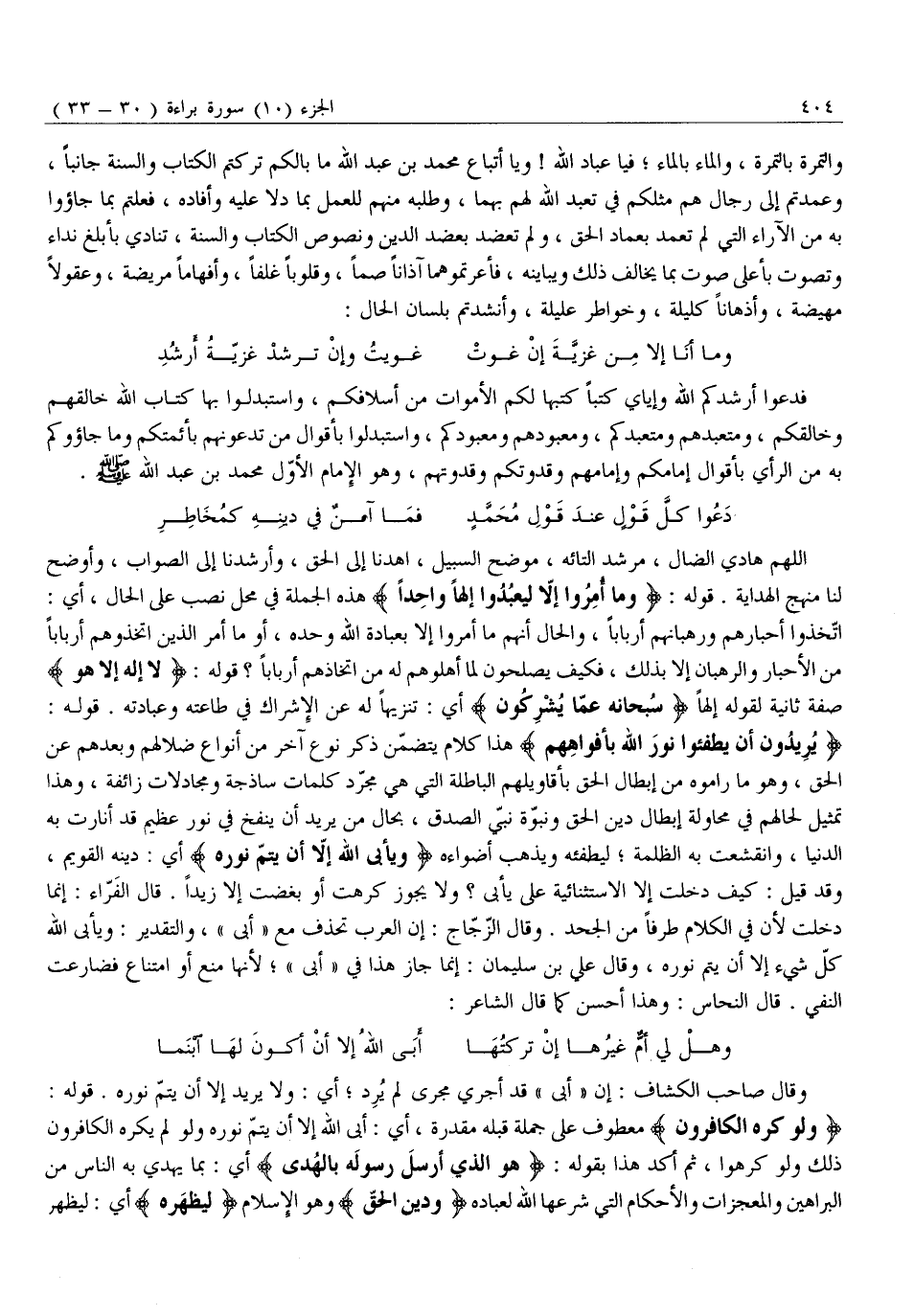 يُرِيدُونَ أَنْ يُطْفِؤُا نُورَ اللَّهِ بِأَفْواهِهِمْ هَذَا كَلَامٌ يَتَضَمَّنُ ذِكْرَ نَوْعٍ آخَرَ مِنْ أَنْوَاعِ ضَلَالِهِمْ وَبُعْدِهِمْ عَنِ الْحَقِّ، وَهُوَ مَا رَامُوهُ مِنْ إِبْطَالِ الْحَقِّ بِأَقَاوِيلِهِمُ الْبَاطِلَةِ الَّتِي هِيَ مُجَرَّدُ كَلِمَاتٍ سَاذَجَةٍ وَمُجَادَلَاتٍ زَائِفَةٍ، وَهَذَا تَمْثِيلٌ لِحَالِهِمْ فِي مُحَاوَلَةِ إِبْطَالِ دِينِ الْحَقِّ وَنُبُوَّةِ نَبِيِّ الصِّدْقِ، بِحَالِ مَنْ يُرِيدُ أَنْ يَنْفُخَ فِي نُورٍ عَظِيمٍ قَدْ أَنَارَتْ بِهِ الدُّنْيَا، وَانْقَشَعَتْ بِهِ الظُّلْمَةُ لِيُطْفِئَهُ وَيُذْهِبَ أَضْوَاءَهُ وَيَأْبَى اللَّهُ إِلَّا أَنْ يُتِمَّ نُورَهُ أَيْ: دِينَهُ الْقَوِيمَ، وَقَدْ قِيلَ: كَيْفَ دَخَلَتْ إِلَّا الِاسْتِثْنَائِيَّةُ عَلَى يَأْبَى؟ وَلَا يَجُوزُ كَرِهْتُ أَوْ بَغَضْتُ إِلَّا زَيْدًا. قَالَ الْفَرَّاءُ: إِنَّمَا دَخَلْتُ لِأَنَّ فِي الْكَلَامِ طَرَفًا مِنَ الْجَحْدِ. وَقَالَ الزَّجَّاجُ: إِنَّ الْعَرَبَ تَحْذِفُ مَعَ «أَبَى» ، وَالتَّقْدِيرُ: وَيَأْبَى اللَّهُ كُلَّ شَيْءٍ إِلَّا أَنْ يُتِمَّ نُورَهُ، وَقَالَ عَلِيُّ بْنُ سُلَيْمَانَ: إِنَّمَا جَازَ هَذَا فِي «أَبَى» لِأَنَّهَا مَنْعٌ أَوِ امْتِنَاعٌ فَضَارَعَتِ النَّفْيَ. قَالَ النَّحَّاسُ: وَهَذَا أَحْسَنُ كَمَا قَالَ الشَّاعِرُ: