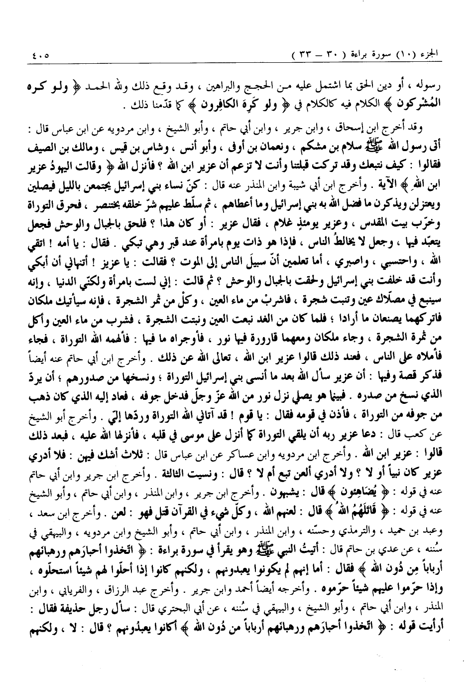 أَتَى رَسُولَ اللَّهِ صَلَّى اللَّهُ عَلَيْهِ وَسَلَّمَ سَلَّامُ بْنُ مِشْكَمٍ، وَنُعْمَانُ بْنُ أَوْفَى، وَأَبُو أَنَسٍ، وَشَاسُ بْنُ قَيْسٍ، وَمَالِكُ بْنُ الصَّيْفِ فَقَالُوا: كَيْفَ نَتَّبِعُكَ وَقَدْ تركت قبلتنا وأنت لا تزعم أن عزير ابْنُ اللَّهِ؟ فَأَنْزَلَ اللَّهُ وَقالَتِ الْيَهُودُ عُزَيْرٌ ابْنُ اللَّهِ الْآيَةَ. وَأَخْرَجَ ابْنُ أَبِي شَيْبَةَ وَابْنُ الْمُنْذِرِ عَنْهُ قَالَ: كُنَّ نِسَاءُ بَنِي إسرائيل يجتمعن بالليل فيصلين ويعتزلن ويذكرن مَا فَضَّلَ اللَّهُ بِهِ بَنِي إِسْرَائِيلَ وَمَا أَعْطَاهُمْ، ثُمَّ سَلَّطَ عَلَيْهِمْ شَرَّ خَلْقِهِ بُخَتُنَصَّرَ، فَحَرَقَ التَّوْرَاةَ وَخَرَّبَ بَيْتَ الْمَقْدِسِ، وَعُزَيْرٌ يَوْمَئِذٍ غلام، فقال عزير: أو كان هَذَا؟ فَلَحِقَ بِالْجِبَالِ وَالْوَحْشِ فَجَعَلَ يَتَعَبَّدُ فِيهَا، وَجَعْلَ لَا يُخَالِطُ النَّاسَ، فَإِذَا هُوَ ذَاتُ يوم بامرأة عند قبر وهي تبكي. فقال: يَا أُمَّهْ! اتَّقِي اللَّهَ، وَاحْتَسِبِي، وَاصْبِرِي، أَمَّا تَعْلَمِينَ أَنَّ سَبِيلَ النَّاسِ إِلَى الْمَوْتِ؟ فَقَالَتْ: يا عزيز! أَتَنْهَانِي أَنْ أَبْكِيَ وَأَنْتَ قَدْ خَلَّفْتَ بَنِي إِسْرَائِيلَ وَلَحِقْتَ بِالْجِبَالِ وَالْوَحْشِ؟ ثُمَّ قَالَتْ: إِنِّي لَسْتُ بِامْرَأَةٍ وَلَكِنِّي الدُّنْيَا، وَإِنَّهُ سَيَنْبُعُ فِي مُصَلَّاكَ عَيْنٌ وَتَنْبُتُ شَجَرَةٌ، فَاشْرَبْ مِنْ مَاءِ الْعَيْنِ، وَكُلْ مِنْ ثَمَرِ الشَّجَرَةِ، فَإِنَّهُ سَيَأْتِيكَ مَلَكَانِ فَاتْرُكْهُمَا يَصْنَعَانِ مَا أَرَادَا فَلَمَّا كَانَ مِنَ الْغَدِ نَبَعَتِ الْعَيْنُ وَنَبَتَتِ الشَّجَرَةُ، فَشَرِبَ مِنْ مَاءِ الْعَيْنِ وَأَكَلَ مِنْ ثَمَرَةِ الشَّجَرَةِ، وَجَاءَ مَلَكَانِ وَمَعَهُمَا قَارُورَةٌ فِيهَا نُورٌ، فَأَوْجَرَاهُ مَا فِيهَا: فَأَلْهَمَهُ اللَّهُ التَّوْرَاةَ، فَجَاءَ فَأَمْلَاهُ عَلَى النَّاسِ، فَعِنْدَ ذَلِكَ قَالُوا عُزَيْرٌ ابْنُ اللَّهِ، تَعَالَى اللَّهُ عَنْ ذَلِكَ. وَأَخْرَجَ ابْنُ أَبِي حَاتِمٍ عَنْهُ أَيْضًا فَذَكَرَ قِصَّةً وَفِيهَا: أن عزير سَأَلَ اللَّهَ بَعْدَ مَا أَنْسَى بَنِي إِسْرَائِيلَ التَّوْرَاةَ وَنَسَخَهَا مِنْ صُدُورِهِمْ أَنْ يَرُدَّ الَّذِي نَسَخَ مِنْ صَدْرِهِ. فَبَيْنَمَا هُوَ يُصَلِّي نَزَلَ نُورٌ مِنَ اللَّهِ عَزَّ وَجَلَّ فَدَخَلَ جَوْفَهُ، فَعَادَ إِلَيْهِ الَّذِي كَانَ ذَهَبَ مِنْ جَوْفِهِ مِنَ التَّوْرَاةِ، فَأَذَّنَ فِي قَوْمِهِ فَقَالَ: يَا قَوْمُ! قَدْ آتَانِي اللَّهُ التَّوْرَاةَ وَرَدَّهَا إِلَيَّ. وأخرج أبو الشيخ عن كعب قال: دعا عُزَيْرٍ رَبَّهُ أَنْ يُلْقِيَ التَّوْرَاةَ كَمَا أَنْزَلَ عَلَى مُوسَى فِي قَلْبِهِ، فَأَنْزَلَهَا اللَّهُ عَلَيْهِ، فَبَعْدَ ذَلِكَ قَالُوا: عُزَيْرٌ ابْنُ اللَّهِ. وَأَخْرَجَ ابْنُ مَرْدَوَيْهِ وَابْنُ عَسَاكِرَ عَنِ ابْنِ عَبَّاسٍ قَالَ: ثَلَاثٌ أَشُكُّ فِيهِنَّ: فَلَا أَدْرِي عُزَيْرٌ كان نبيا أو لَا؟ وَلَا أَدْرِي أَلُعِنَ تُبَّعٌ أَمْ لَا؟ قَالَ: وَنَسِيتُ الثَّالِثَةَ. وَأَخْرَجَ ابْنُ جَرِيرٍ وَابْنُ أَبِي حَاتِمٍ عَنْهُ في قوله: يُضاهِؤُنَ قَالَ: يُشْبِهُونَ. وَأَخْرَجَ ابْنُ جَرِيرٍ، وَابْنُ الْمُنْذِرِ، وَابْنُ أَبِي حَاتِمٍ، وَأَبُو الشَّيْخِ عَنْهُ فِي قَوْلِهِ: قاتَلَهُمُ اللَّهُ قَالَ: لَعَنَهُمُ اللَّهُ، وَكُلُّ شَيْءٍ فِي الْقُرْآنِ قَتْلٌ فَهُوَ: لَعْنٌ. وَأَخْرَجَ ابْنُ سَعْدٍ، وَعَبْدُ بْنُ حُمَيْدٍ، وَالتِّرْمِذِيُّ وَحَسَّنَهُ، وَابْنُ الْمُنْذِرِ، وَابْنُ أَبِي حَاتِمٍ، وَأَبُو الشَّيْخِ وَابْنُ مَرْدَوَيْهِ، وَالْبَيْهَقِيُّ فِي سُنَنِهِ، عَنْ عَدِيِّ بْنِ حَاتِمٍ قَالَ: أَتَيْتُ النَّبِيَّ صَلَّى اللَّهُ عَلَيْهِ وَسَلَّمَ وَهُوَ يَقْرَأُ فِي سُورَةِ بَرَاءَةٍ: اتَّ