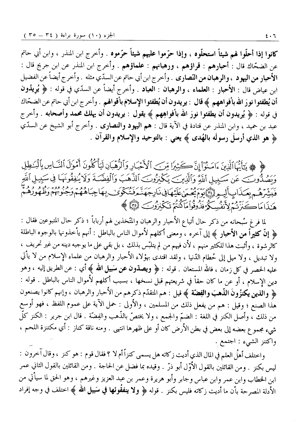 يَا أَيُّهَا الَّذِينَ آمَنُوا إِنَّ كَثِيراً مِنَ الْأَحْبارِ وَالرُّهْبانِ لَيَأْكُلُونَ أَمْوالَ النَّاسِ بِالْباطِلِ وَيَصُدُّونَ عَنْ سَبِيلِ اللَّهِ وَالَّذِينَ يَكْنِزُونَ الذَّهَبَ وَالْفِضَّةَ وَلا يُنْفِقُونَها فِي سَبِيلِ اللَّهِ فَبَشِّرْهُمْ بِعَذابٍ أَلِيمٍ (34) يَوْمَ يُحْمى عَلَيْها فِي نارِ جَهَنَّمَ فَتُكْوى بِها جِباهُهُمْ وَجُنُوبُهُمْ وَظُهُورُهُمْ هَذَا مَا كَنَزْتُمْ لِأَنْفُسِكُمْ فَذُوقُوا مَا كُنْتُمْ تَكْنِزُونَ (35)