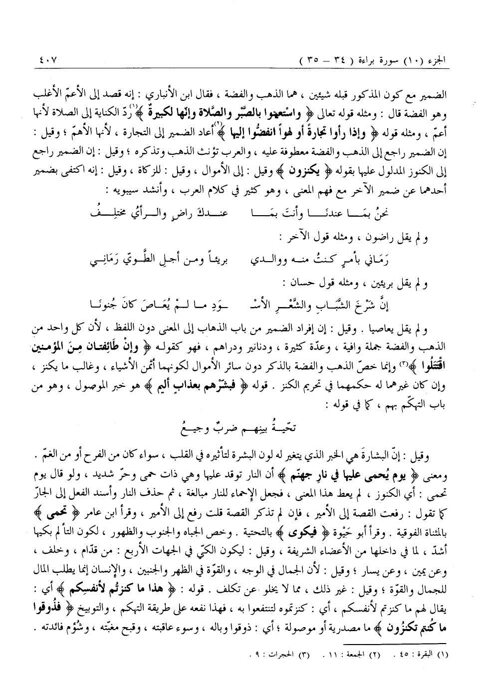 إِنَّ الضَّمِيرَ رَاجِعٌ إِلَى الذَّهَبِ وَالْفِضَّةِ مَعْطُوفَةٌ عَلَيْهِ، وَالْعَرَبُ تُؤَنِّثُ الذَّهَبَ وَتُذَكِّرُهُ وَقِيلَ: إِنَّ الضَّمِيرَ رَاجِعٌ إِلَى الْكُنُوزِ الْمَدْلُولِ عَلَيْهَا بِقَوْلِهِ يَكْنِزُونَ وَقِيلَ: إِلَى الْأَمْوَالِ، وَقِيلَ: لِلزَّكَاةِ، وَقِيلَ: إِنَّهُ اكْتَفَى بِضَمِيرِ أَحَدِهِمَا عَنْ ضَمِيرِ الْآخَرِ مَعَ فَهْمِ الْمَعْنَى، وَهُوَ كَثِيرٌ فِي كَلَامِ الْعَرَبِ، وَأَنْشَدَ سِيبَوَيْهِ:
