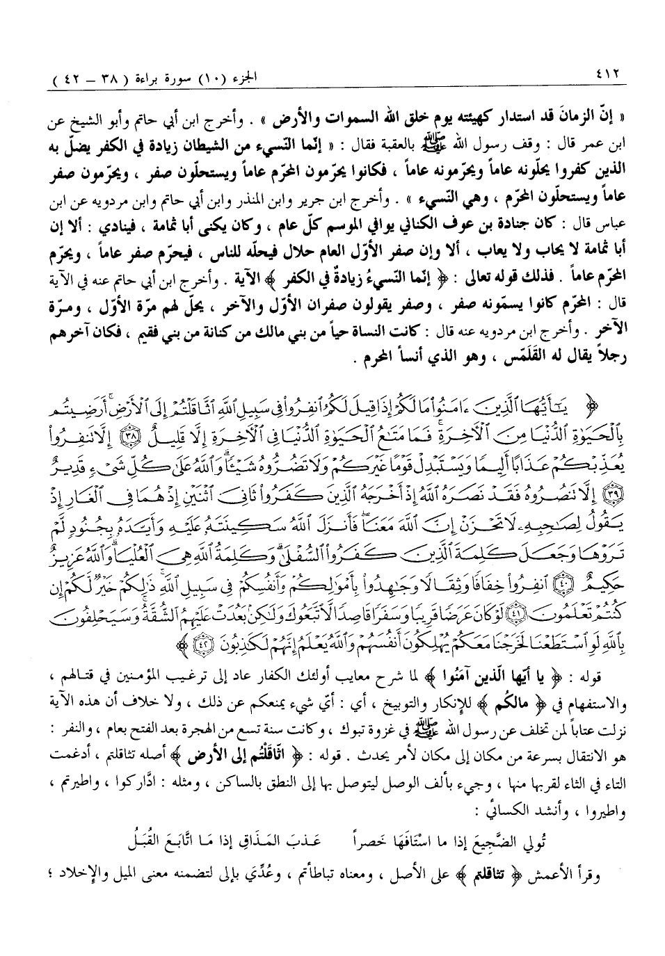 يَا أَيُّهَا الَّذِينَ آمَنُوا مَا لَكُمْ إِذا قِيلَ لَكُمُ انْفِرُوا فِي سَبِيلِ اللَّهِ اثَّاقَلْتُمْ إِلَى الْأَرْضِ أَرَضِيتُمْ بِالْحَياةِ الدُّنْيا مِنَ الْآخِرَةِ فَما مَتاعُ الْحَياةِ الدُّنْيا فِي الْآخِرَةِ إِلاَّ قَلِيلٌ (38) إِلاَّ تَنْفِرُوا يُعَذِّبْكُمْ عَذاباً أَلِيماً وَيَسْتَبْدِلْ قَوْماً غَيْرَكُمْ وَلا تَضُرُّوهُ شَيْئاً وَاللَّهُ عَلى كُلِّ شَيْءٍ قَدِيرٌ (39) إِلاَّ تَنْصُرُوهُ فَقَدْ نَصَرَهُ اللَّهُ إِذْ أَخْرَجَهُ الَّذِينَ كَفَرُوا ثانِيَ اثْنَيْنِ إِذْ هُما فِي الْغارِ إِذْ يَقُولُ لِصاحِبِهِ لَا تَحْزَنْ إِنَّ اللَّهَ مَعَنا فَأَنْزَلَ اللَّهُ سَكِينَتَهُ عَلَيْهِ وَأَيَّدَهُ بِجُنُودٍ لَمْ تَرَوْها وَجَعَلَ كَلِمَةَ الَّذِينَ كَفَرُوا السُّفْلى وَكَلِمَةُ اللَّهِ هِيَ الْعُلْيا وَاللَّهُ عَزِيزٌ حَكِيمٌ (40) انْفِرُوا خِفافاً وَثِقالاً وَجاهِدُوا بِأَمْوالِكُمْ وَأَنْفُسِكُمْ فِي سَبِيلِ اللَّهِ ذلِكُمْ خَيْرٌ لَكُمْ إِنْ كُنْتُمْ تَعْلَمُونَ (41) لَوْ كانَ عَرَضاً قَرِيباً وَسَفَراً قاصِداً لاتَّبَعُوكَ وَلكِنْ بَعُدَتْ عَلَيْهِمُ الشُّقَّةُ وَسَيَحْلِفُونَ بِاللَّهِ لَوِ اسْتَطَعْنا لَخَرَجْنا مَعَكُمْ يُهْلِكُونَ أَنْفُسَهُمْ وَاللَّهُ يَعْلَمُ إِنَّهُمْ لَكاذِبُونَ (42)
