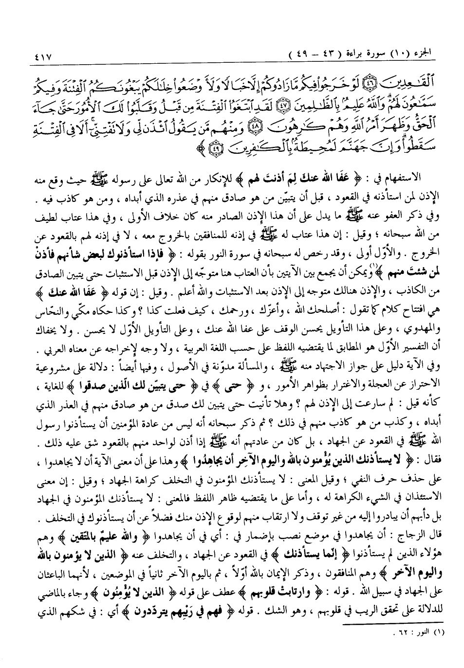 فَقَالَ: لَا يَسْتَأْذِنُكَ الَّذِينَ يُؤْمِنُونَ بِاللَّهِ وَالْيَوْمِ الْآخِرِ أَنْ يُجاهِدُوا وَهَذَا عَلَى أَنَّ مَعْنَى الْآيَةِ أَنْ لَا يُجَاهِدُوا، عَلَى حَذْفِ حَرْفِ النَّفْيِ وَقِيلَ الْمَعْنَى: لَا يَسْتَأْذِنُكَ الْمُؤْمِنُونَ فِي التَّخَلُّفِ كَرَاهَةَ الْجِهَادِ وَقِيلَ: إِنَّ مَعْنَى الِاسْتِئْذَانِ فِي الشَّيْءِ الْكَرَاهَةُ لَهُ، وَأَمَّا عَلَى مَا يَقْتَضِيهِ ظَاهِرُ اللَّفْظِ فَالْمَعْنَى: لَا يَسْتَأْذِنُكَ الْمُؤْمِنُونَ فِي الْجِهَادِ بَلْ دَأْبُهُمْ أَنْ يُبَادِرُوا إِلَيْهِ مِنْ غَيْرِ تَوَقُّفٍ وَلَا ارْتِقَابٍ مِنْهُمْ لِوُقُوعِ الْإِذْنِ مِنْكَ فَضْلًا عَنْ أَنْ يَسْتَأْذِنُوكَ فِي التَّخَلُّفِ.