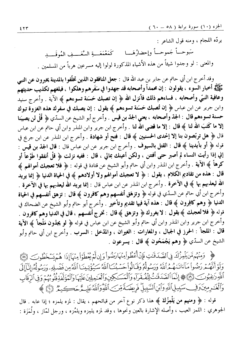 وَمِنْهُمْ مَنْ يَلْمِزُكَ فِي الصَّدَقاتِ فَإِنْ أُعْطُوا مِنْها رَضُوا وَإِنْ لَمْ يُعْطَوْا مِنْها إِذا هُمْ يَسْخَطُونَ (58) وَلَوْ أَنَّهُمْ رَضُوا مَا آتاهُمُ اللَّهُ وَرَسُولُهُ وَقالُوا حَسْبُنَا اللَّهُ سَيُؤْتِينَا اللَّهُ مِنْ فَضْلِهِ وَرَسُولُهُ إِنَّا إِلَى اللَّهِ راغِبُونَ (59) إِنَّمَا الصَّدَقاتُ لِلْفُقَراءِ وَالْمَساكِينِ وَالْعامِلِينَ عَلَيْها وَالْمُؤَلَّفَةِ قُلُوبُهُمْ وَفِي الرِّقابِ وَالْغارِمِينَ وَفِي سَبِيلِ اللَّهِ وَابْنِ السَّبِيلِ فَرِيضَةً مِنَ اللَّهِ وَاللَّهُ عَلِيمٌ حَكِيمٌ (60)