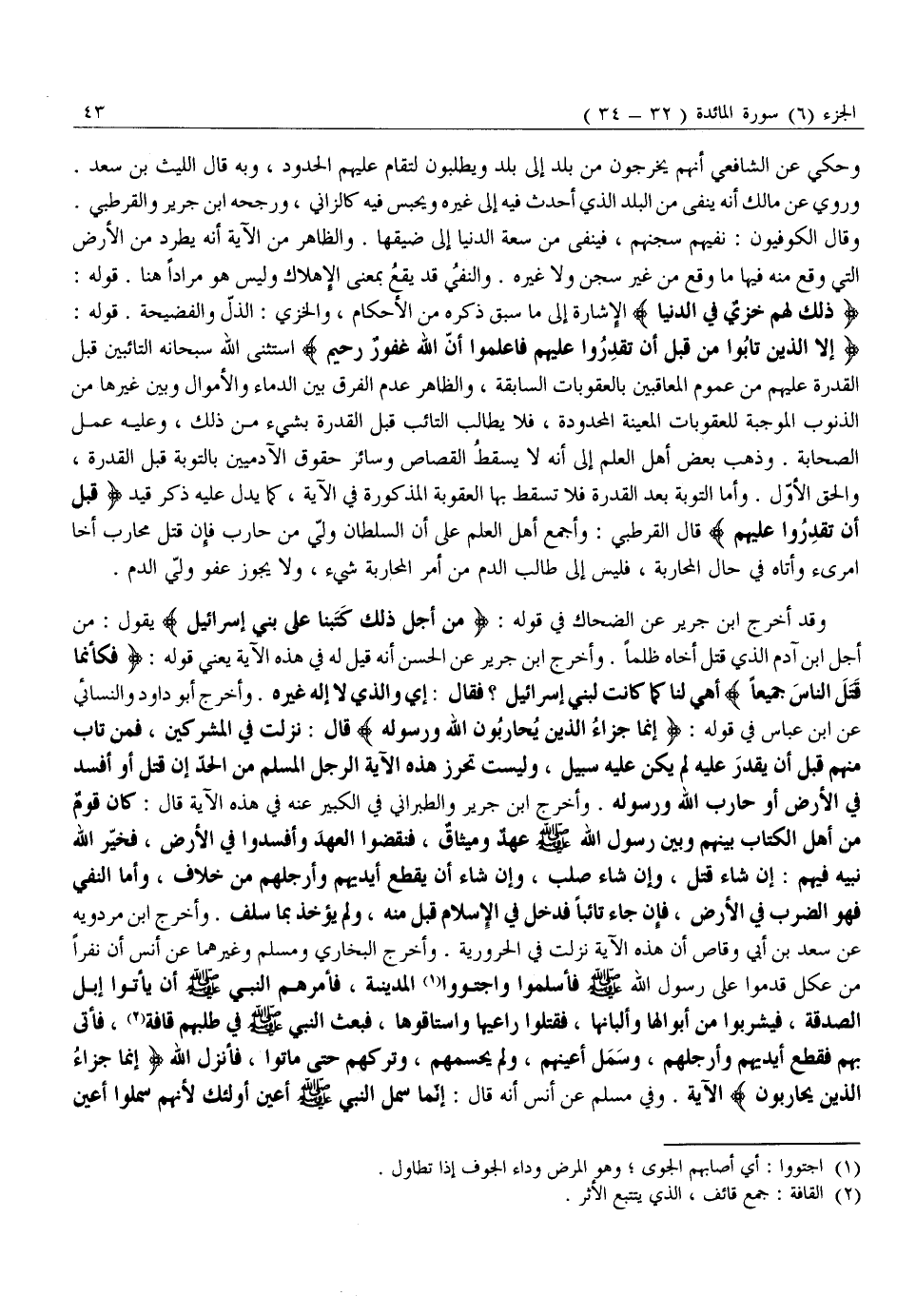 إِلَّا الَّذِينَ تابُوا مِنْ قَبْلِ أَنْ تَقْدِرُوا عَلَيْهِمْ فَاعْلَمُوا أَنَّ اللَّهَ غَفُورٌ رَحِيمٌ اسْتَثْنَى اللَّهُ سُبْحَانَهُ التَّائِبِينَ قَبْلَ الْقُدْرَةِ عَلَيْهِمْ مِنْ عُمُومِ الْمُعَاقِبِينَ بِالْعُقُوبَاتِ السَّابِقَةِ، وَالظَّاهِرُ عَدَمُ الْفَرْقِ بَيْنَ الدِّمَاءِ وَالْأَمْوَالِ وَبَيْنَ غَيْرِهَا مِنَ الذُّنُوبِ الْمُوجِبَةِ لِلْعُقُوبَاتِ الْمُعَيَّنَةِ الْمَحْدُودَةِ، فَلَا يُطَالَبُ التَّائِبُ قَبْلَ الْقُدْرَةِ بِشَيْءٍ مِنْ ذَلِكَ، وَعَلَيْهِ عَمَلُ الصَّحَابَةِ. وَذَهَبَ بَعْضُ أَهْلِ الْعِلْمِ إِلَى أَنَّهُ لَا يَسْقُطُ الْقِصَاصُ وَسَائِرُ حُقُوقِ الْآدَمِيِّينَ بِالتَّوْبَةِ قَبْلَ الْقُدْرَةِ، وَالْحَقُّ الْأَوَّلُ. وَأَمَّا التَّوْبَةُ بَعْدَ الْقُدْرَةِ فَلَا تَسْقُطُ بِهَا الْعُقُوبَةَ الْمَذْكُورَةَ فِي الْآيَةِ، كَمَا يَدُلُّ عَلَيْهِ ذِكْرُ قَيْدِ قَبْلِ أَنْ تَقْدِرُوا عَلَيْهِمْ قَالَ الْقُرْطُبِيُّ: وَأَجْمَعَ أَهْلُ الْعِلْمِ عَلَى أَنَّ السُّلْطَانَ وَلِيُّ مَنْ حَارَبَ فَإِنْ قَتَلَ مُحَارِبٌ أَخَا امْرِئٍ وَأَتَاهُ فِي حَالِ الْمُحَارَبَةِ، فَلَيْسَ إِلَى طَالِبِ الدَّمِ مِنْ أَمْرِ الْمُحَارَبَةِ شَيْءٌ، وَلَا يَجُوزُ عَفْوُ وَلِيِّ الدَّمِ.