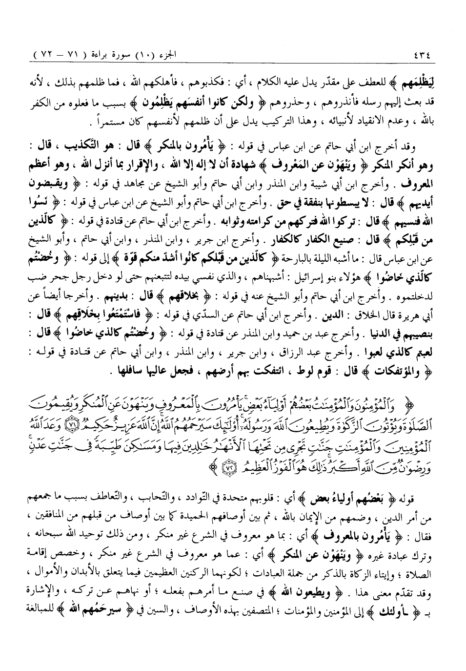 وَالْمُؤْمِنُونَ وَالْمُؤْمِناتُ بَعْضُهُمْ أَوْلِياءُ بَعْضٍ يَأْمُرُونَ بِالْمَعْرُوفِ وَيَنْهَوْنَ عَنِ الْمُنْكَرِ وَيُقِيمُونَ الصَّلاةَ وَيُؤْتُونَ الزَّكاةَ وَيُطِيعُونَ اللَّهَ وَرَسُولَهُ أُولئِكَ سَيَرْحَمُهُمُ اللَّهُ إِنَّ اللَّهَ عَزِيزٌ حَكِيمٌ (71) وَعَدَ اللَّهُ الْمُؤْمِنِينَ وَالْمُؤْمِناتِ جَنَّاتٍ تَجْرِي مِنْ تَحْتِهَا الْأَنْهارُ خالِدِينَ فِيها وَمَساكِنَ طَيِّبَةً فِي جَنَّاتِ عَدْنٍ وَرِضْوانٌ مِنَ اللَّهِ أَكْبَرُ ذلِكَ هُوَ الْفَوْزُ الْعَظِيمُ (72)
