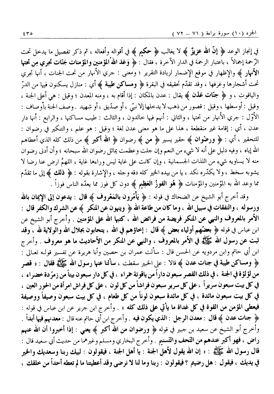 فِي إِنْجَازِ الْوَعْدِ إِنَّ اللَّهَ عَزِيزٌ لَا يُغَالَبُ حَكِيمٌ فِي أَقْوَالِهِ وَأَفْعَالِهِ، ثُمَّ ذَكَرَ تَفْصِيلَ مَا يَدْخُلُ تَحْتَ الرَّحْمَةِ إِجْمَالًا، بِاعْتِبَارِ الرَّحْمَةِ فِي الدَّارِ الْآخِرَةِ، فَقَالَ: وَعَدَ اللَّهُ الْمُؤْمِنِينَ وَالْمُؤْمِناتِ جَنَّاتٍ تَجْرِي مِنْ تَحْتِهَا الْأَنْهارُ وَالْإِظْهَارُ فِي مَوْقِعِ الْإِضْمَارِ لِزِيَادَةِ التَّقْرِيرِ وَمَعْنَى: جَرْيِ الْأَنْهَارِ مِنْ تَحْتِ الْجَنَّاتِ، أَنَّهَا تَجْرِي تَحْتَ أَشْجَارِهَا وَغُرَفِهَا، وَقَدْ تَقَدَّمَ تَحْقِيقُهُ فِي الْبَقَرَةِ وَمَساكِنَ طَيِّبَةً أَيْ: مَنَازِلَ يَسْكُنُونَ فِيهَا من الدرّ والياقوت، وجَنَّاتِ عَدْنٍ يُقَالُ: عَدَنَ بِالْمَكَانِ: إِذَا أَقَامَ بِهِ، ومنه المعدن وقيل: هِيَ أَعْلَى الْجَنَّةِ، وَقِيلَ: أَوْسَطُهَا، وَقِيلَ: قُصُورٌ مِنْ ذَهَبٍ لَا يَدْخُلُهَا إِلَّا نَبِيٌّ، أَوْ صِدِّيقٌ، أَوْ شَهِيدٌ. وَصَفَ الْجَنَّةَ بِأَوْصَافٍ:
