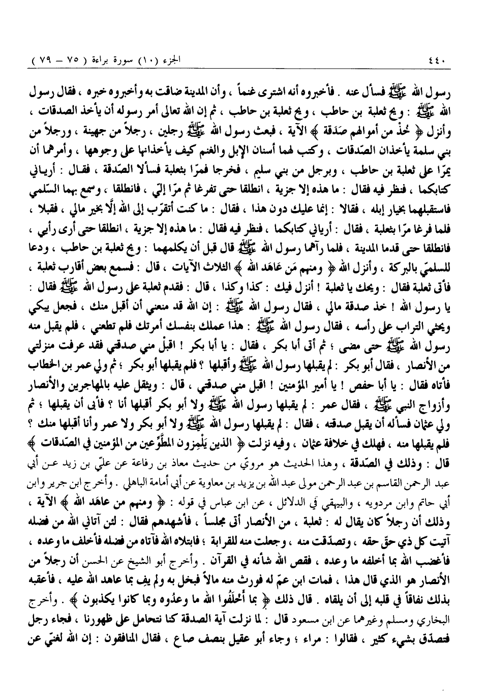 فَلَمْ يَقْبَلْهَا مِنْهُ، فَهَلَكَ فِي خِلَافَةِ عُثْمَانَ، وَفِيهِ نَزَلَتْ الَّذِينَ يَلْمِزُونَ الْمُطَّوِّعِينَ مِنَ الْمُؤْمِنِينَ فِي الصَّدَقاتِ قَالَ: وَذَلِكَ فِي الصَّدَقَةِ، وَهَذَا الْحَدِيثُ هُوَ مَرْوِيٌّ مِنْ حَدِيثِ مُعَاذِ بْنِ رَفَاعَةَ عَنْ عَلِيِّ بْنِ زَيْدٍ عَنْ أَبِي عَبْدِ الرَّحْمَنِ الْقَاسِمِ بْنِ عَبْدِ الرَّحْمَنِ مَوْلَى عَبْدِ اللَّهِ بْنِ يَزِيدَ بْنِ مُعَاوِيَةَ عَنْ أَبِي أُمَامَةَ الْبَاهِلِيِّ. وَأَخْرَجَ ابْنُ جَرِيرٍ وَابْنُ أَبِي حَاتِمٍ وَابْنُ مَرْدَوَيْهِ، وَالْبَيْهَقِيُّ فِي الدَّلَائِلِ، عَنِ ابْنِ عَبَّاسٍ فِي قَوْلِهِ: وَمِنْهُمْ مَنْ عاهَدَ اللَّهَ الْآيَةَ، وَذَلِكَ أَنَّ رَجُلًا كَانَ يُقَالُ لَهُ: ثَعْلَبَةُ، مِنَ الْأَنْصَارِ أَتَى مَجْلِسًا، فَأَشْهَدَهُمْ فَقَالَ: لَئِنْ آتَانِي اللَّهُ مِنْ فَضْلِهِ آتَيْتُ كُلَّ ذِي حَقِّ حَقَّهُ، وَتَصَدَّقْتُ مِنْهُ، وَجَعَلْتُ مِنْهُ لِلْقَرَابَةِ فَابْتَلَاهُ اللَّهُ فَآتَاهُ مِنْ فَضْلِهِ فَأَخْلَفَ مَا وَعَدَهُ، فَأَغْضَبَ اللَّهَ بِمَا أَخْلَفَهُ مَا وَعَدَهُ، فَقَصَّ اللَّهُ شَأْنَهُ فِي الْقُرْآنِ. وَأَخْرَجَ أَبُو الشَّيْخِ عَنِ الْحَسَنِ أَنَّ رَجُلًا مِنَ الْأَنْصَارِ هُوَ الَّذِي قَالَ هَذَا، فَمَاتَ ابْنُ عَمٍّ لَهُ فَوَرِثَ مِنْهُ مَالًا فَبَخِلَ بِهِ وَلَمْ يَفِ بِمَا عَاهَدَ اللَّهَ عَلَيْهِ، فَأَعْقَبَهُ بِذَلِكَ نِفَاقًا فِي قَلْبِهِ إِلَى أَنْ يَلْقَاهُ. قَالَ ذَلِكَ بِما أَخْلَفُوا اللَّهَ مَا وَعَدُوهُ وَبِما كانُوا يَكْذِبُونَ. وَأَخْرَجَ الْبُخَارِيُّ وَمُسْلِمٌ وَغَيْرُهُمَا عَنِ ابْنِ مَسْعُودٍ قَالَ: لَمَّا نَزَلَتْ آيَةُ الصَّدَقَةِ كُنَّا نَتَحَامَلُ عَلَى ظُهُورِنَا، فَجَاءَ رَجُلٌ فَتَصَدَّقَ بِشَيْءٍ كَثِيرٍ، فَقَالُوا: مُرَاءٍ وَجَاءَ أَبُو عَقِيلٍ بِنِصْفِ صَاعٍ، فَقَالَ الْمُنَافِقُونَ: إِنَّ اللَّهَ لَغَنِيٌّ عَنْ