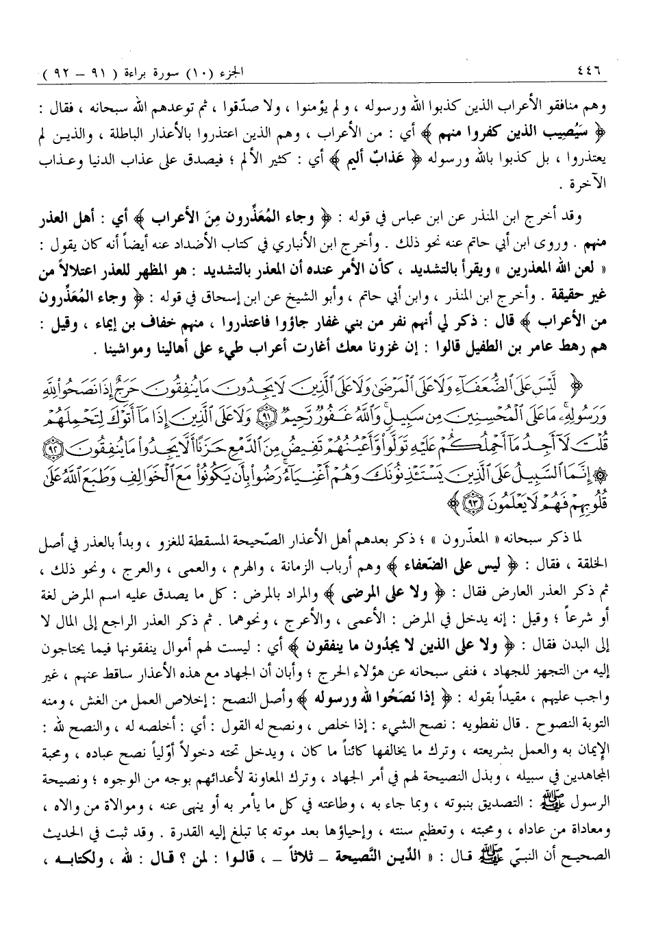 لَمَّا ذَكَرَ سبحانه «المعذّرون» ذَكَرَ بَعْدَهُمْ أَهْلَ الْأَعْذَارِ الصَّحِيحَةِ الْمُسْقِطَةِ لِلْغَزْوِ، وَبَدَأَ بِالْعُذْرِ فِي أَصْلِ الْخِلْقَةِ، فَقَالَ: لَيْسَ عَلَى الضُّعَفاءِ وَهُمْ أَرْبَابُ الزَّمَانَةِ، وَالْهَرَمِ، وَالْعَمَى، وَالْعَرَجِ، وَنَحْوِ ذَلِكَ، ثُمَّ ذَكَرَ الْعُذْرَ الْعَارِضَ فَقَالَ: وَلا عَلَى الْمَرْضى وَالْمُرَادُ بِالْمَرَضِ: كُلُّ مَا يَصْدُقُ عَلَيْهِ اسْمُ الْمَرَضِ لُغَةً أَوْ شَرْعًا وَقِيلَ: إِنَّهُ يَدْخُلُ فِي الْمَرَضِ: الْأَعْمَى، وَالْأَعْرَجِ، وَنَحْوُهُمَا. ثُمَّ ذَكَرَ الْعُذْرَ الرَّاجِعَ إِلَى الْمَالِ لَا إِلَى الْبَدَنِ فَقَالَ: وَلا عَلَى الَّذِينَ لَا يَجِدُونَ مَا يُنْفِقُونَ أَيْ: لَيْسَتْ لَهُمْ أَمْوَالٌ يُنْفِقُونَهَا فِيمَا يَحْتَاجُونَ إِلَيْهِ مِنَ التَّجَهُّزِ لِلْجِهَادِ، فَنَفَى سُبْحَانَهُ عَنْ هَؤُلَاءِ الْحَرَجَ وَأَبَانَ أَنَّ الْجِهَادَ مَعَ هَذِهِ الْأَعْذَارِ سَاقِطٌ عَنْهُمْ، غَيْرُ وَاجِبٍ عَلَيْهِمْ، مُقَيَّدًا بِقَوْلِهِ: إِذا نَصَحُوا لِلَّهِ وَرَسُولِهِ وَأَصْلُ النُّصْحِ: إِخْلَاصُ الْعَمَلِ مِنَ الْغِشِّ، وَمِنْهُ التَّوْبَةُ النَّصُوحُ. قَالَ نَفْطَوَيْهِ: نَصَحَ الشَّيْءُ: إِذَا خَلُصَ، وَنَصَحَ لَهُ الْقَوْلَ: أَيْ: أَخْلَصَهُ لَهُ، وَالنُّصْحُ لِلَّهِ: