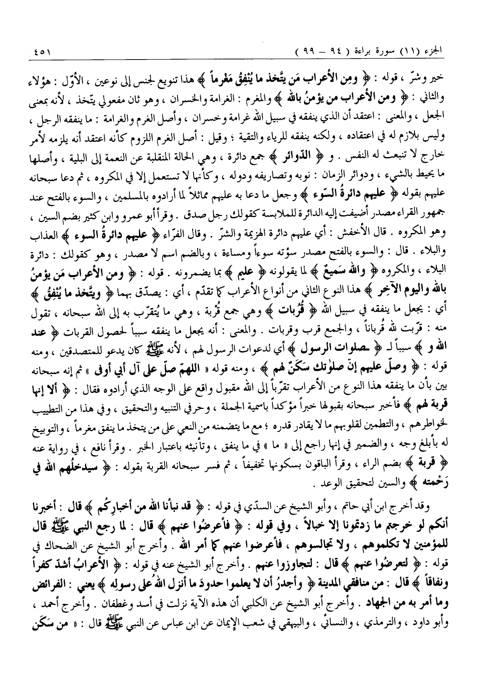 خَيْرٍ وَشَرٍّ، قَوْلُهُ: وَمِنَ الْأَعْرابِ مَنْ يَتَّخِذُ ما يُنْفِقُ مَغْرَماً هذا تنويع لجنس إلى نَوْعَيْنِ، الْأَوَّلُ: هَؤُلَاءِ وَالثَّانِي: وَمِنَ الْأَعْرابِ مَنْ يُؤْمِنُ بِاللَّهِ والمغرم: الغرامة والخسران، وهو ثان مفعولي يتّخذ، لأنه بمعنى الجعل، والمعنى: اعتقد أن الذي ينفقه في سبيل الله غرامة وخسران، وَأَصْلُ الْغُرْمِ وَالْغَرَامَةِ: مَا يُنْفِقُهُ الرَّجُلُ، وَلَيْسَ بِلَازِمٍ لَهُ فِي اعْتِقَادِهِ، وَلَكِنَّهُ يُنْفِقُهُ لِلرِّيَاءِ وَالتَّقِيَّةِ وَقِيلَ: أَصْلُ الْغُرْمِ اللُّزُومُ كَأَنَّهُ اعْتَقَدَ أَنَّهُ يَلْزَمُهُ لِأَمْرٍ خَارِجٍ لَا تَنْبَعِثُ لَهُ النفس. والدَّوائِرَ جُمَعُ دَائِرَةٍ، وَهِيَ الْحَالَةُ الْمُنْقَلِبَةُ عَنِ النِّعْمَةِ إِلَى الْبَلِيَّةِ، وَأَصْلُهَا مَا يُحِيطُ بِالشَّيْءِ، وَدَوَائِرُ الزَّمَانِ: نُوَبُهُ وَتَصَارِيفُهُ وَدُوَلُهُ، وَكَأَنَّهَا لَا تُسْتَعْمَلُ إِلَّا فِي الْمَكْرُوهِ، ثُمَّ دَعَا سُبْحَانَهُ عَلَيْهِمْ بِقَوْلِهِ عَلَيْهِمْ دائِرَةُ السَّوْءِ وَجَعَلَ مَا دَعَا بِهِ عَلَيْهِمْ مُمَاثِلًا لِمَا أَرَادُوهُ بِالْمُسْلِمِينَ، وَالسَّوْءُ بِالْفَتْحِ عِنْدَ جُمْهُورِ الْقُرَّاءِ مَصْدَرٌ أُضِيفَتْ إِلَيْهِ الدَّائِرَةُ لِلْمُلَابَسَةِ كَقَوْلِكَ رَجُلُ صِدْقٍ. وَقَرَأَ أَبُو عَمْرٍو وَابْنُ كَثِيرٍ بِضَمِّ السِّينِ، وَهُوَ الْمَكْرُوهُ. قَالَ الْأَخْفَشُ: أَيْ عَلَيْهِمْ دَائِرَةُ الْهَزِيمَةِ وَالشَّرِّ. وَقَالَ الْفَرَّاءُ عَلَيْهِمْ دائِرَةُ السَّوْءِ الْعَذَابُ وَالْبَلَاءُ. قَالَ: وَالسَّوْءُ بِالْفَتْحِ مَصْدَرُ سُؤْتُهُ سَوْءًا وَمَسَاءَةً، وَبِالضَّمِّ اسْمٌ لَا مَصْدَرَ، وَهُوَ كَقَوْلِكَ: دَائِرَةُ الْبَلَاءِ، وَالْمَكْرُوهِ وَاللَّهُ سَمِيعٌ لِمَا يَقُولُونَهُ عَلِيمٌ بِمَا يُضْمِرُونَهُ. قَوْلُهُ: وَمِنَ الْأَعْرابِ مَنْ يُؤْمِنُ بِاللَّهِ وَالْيَوْمِ الْآخِرِ هَذَا النَّوْعُ الثَّانِي مِنْ أَنْوَاعِ الْأَعْرَابِ كَمَا تَقَدَّمَ، أَيْ: يُصَدِّقُ بِهِمَا وَيَتَّخِذُ مَا يُنْفِقُ أَيْ: يَجْعَلُ مَا يُنْفِقُهُ فِي سَبِيلِ اللَّهِ قُرُباتٍ وَهِيَ جَمْعُ قُرْبَةٍ، وَهِيَ مَا يُتَقَرَّبُ بِهِ إِلَى اللَّهِ سُبْحَانَهُ، تَقُولُ مِنْهُ: قَرَّبْتُ لِلَّهِ قُرْبَانًا، وَالْجَمْعُ قُرَبٌ وَقُرُبَاتٌ. وَالْمَعْنَى: أَنَّهُ يَجْعَلُ مَا يُنْفِقُهُ سَبَبًا لِحُصُولِ الْقُرُبَاتِ عِنْدَ اللَّهِ وَسببا لِ صَلَواتِ الرَّسُولِ أَيْ لِدَعَوَاتِ الرَّسُولِ لَهُمْ، لِأَنَّهُ صَلَّى الله عليه وَسَلَّمَ كَانَ يَدْعُو لِلْمُتَصَدِّقِينَ، وَمِنْهُ قَوْلُهُ: وَصَلِّ عَلَيْهِمْ إِنَّ صَلاتَكَ سَكَنٌ لَهُمْ، ومنه قوله «اللَّهُمَّ صَلِّ عَلَى آلِ أَبِي أَوْفَى» ثُمَّ إِنَّهُ سُبْحَانَهُ بَيَّنَ بِأَنَّ مَا يُنْفِقُهُ هَذَا النَّوْعُ مِنَ الْأَعْرَابِ تَقَرُّبًا إِلَى اللَّهِ مَقْبُولٌ وَاقِعٌ عَلَى الْوَجْهِ الَّذِي أَرَادُوهُ فَقَالَ: أَلا إِنَّها قُرْبَةٌ لَهُمْ فَأَخْبَرَ سُبْحَانَهُ بِقَبُولِهَا خَبَرًا مُؤَكَّدًا بِأِسْمِيَّةِ الْجُمْلَةِ، وَحَرْفَيِ التَّنْبِيهِ وَالتَّحْقِيقِ، وَفِي هَذَا مِنَ التَّطْيِيبِ لِخَوَاطِرِهِمْ، وَالتَّطْمِينِ لِقُلُوبِهِمْ مَا لَا يُقَادَرُ قَدْرُهُ مَعَ مَا يَتَضَمَّنُهُ مِنَ النَّعْيِ عَلَى مَنْ يَتَّخِذُ مَا يُنْفِقُ مَغْرَمًا، وَالتَّوْبِيخِ لَهُ بِأَبْلَغِ وَجْهٍ، وَالضَّمِيرُ فِي إِنَّهَا رَاجِعٌ إِلَى «مَا» فِي مَا يُنْفِقُ، وَتَأْنِيثُهُ بِاعْتِبَارِ الْخَبَرِ. وَقَرَأَ نَافِعٌ، فِي رِوَايَةٍ عَنْهُ قُرْبَةٌ بِضَمِّ الرَّاءِ، وَقَرَأَ الْبَاقُونَ بِسُكُونِهَا تَخْفِيفًا، ثُمَّ فَسَّرَ سُبْحَانَهُ الْقُرْبَةَ بِقَوْلِهِ: سَيُدْخِلُهُمُ اللَّهُ فِي رَحْ