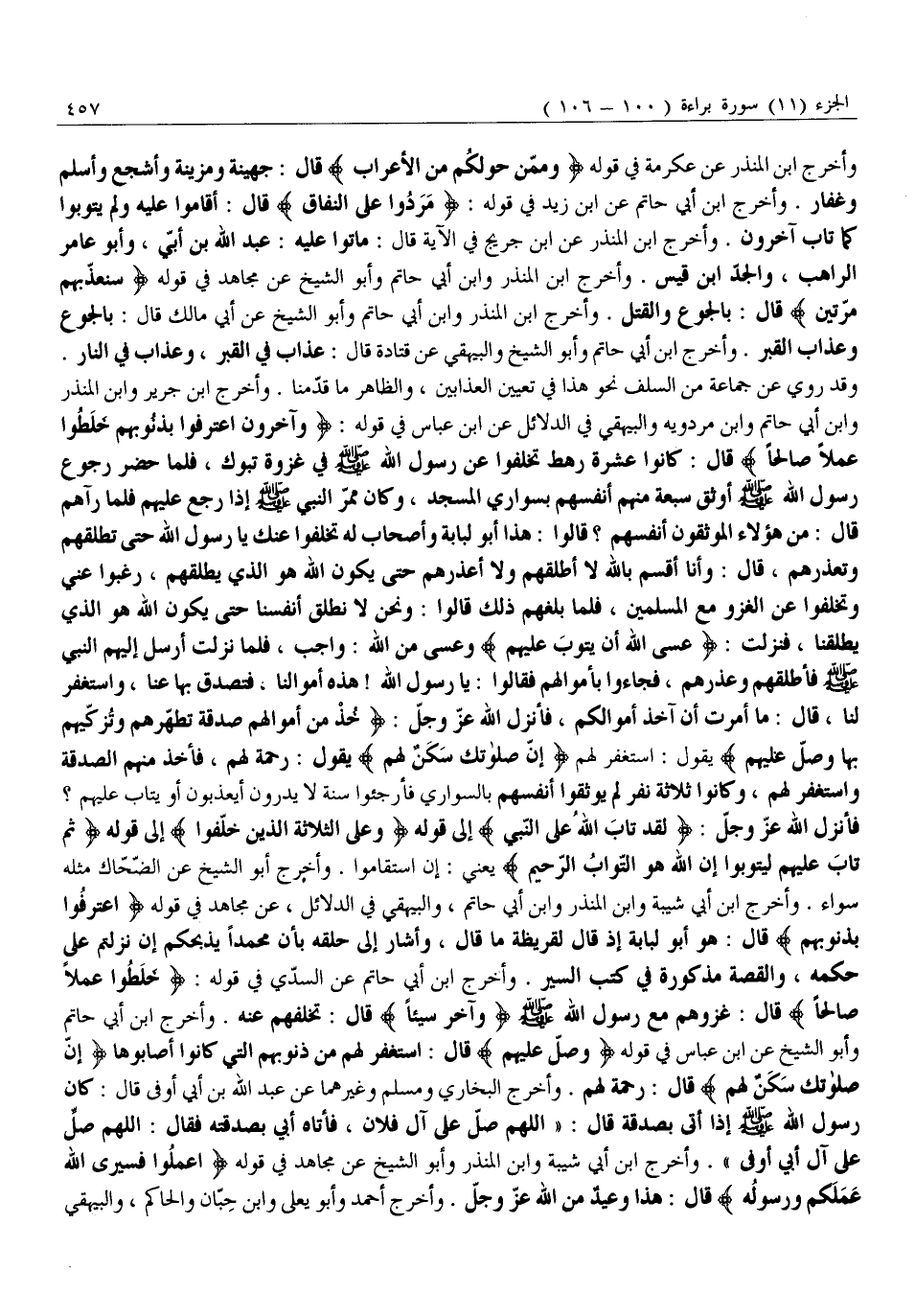 فَأَنْزَلَ اللَّهُ عَزَّ وَجَلَّ: لَقَدْ تابَ اللَّهُ عَلَى النَّبِيِّ إِلَى قَوْلِهِ وَعَلَى الثَّلاثَةِ الَّذِينَ خُلِّفُوا إِلَى قَوْلِهِ ثُمَّ تابَ عَلَيْهِمْ لِيَتُوبُوا إِنَّ اللَّهَ هُوَ التَّوَّابُ الرَّحِيمُ يَعْنِي: إِنِ اسْتَقَامُوا. وَأَخْرَجَ أَبُو الشَّيْخِ عَنِ الضَّحَّاكِ مِثْلَهُ سَوَاءً. وَأَخْرَجَ ابْنُ أَبِي شَيْبَةَ وَابْنُ الْمُنْذِرِ وَابْنُ أَبِي حَاتِمٍ، وَالْبَيْهَقِيُّ فِي الدَّلَائِلِ، عَنْ مُجَاهِدٍ فِي قَوْلِهِ اعْتَرَفُوا بِذُنُوبِهِمْ قَالَ: هُوَ أَبُو لُبَابَةَ إِذْ قَالَ لِقُرَيْظَةَ مَا قَالَ، وَأَشَارَ إِلَى حَلْقِهِ بِأَنَّ مُحَمَّدًا يَذْبَحُكُمْ إِنْ نَزَلْتُمْ عَلَى حُكْمِهِ، وَالْقِصَّةُ مَذْكُورَةٌ فِي كُتُبِ السِّيَرِ. وَأَخْرَجَ ابْنُ أَبِي حَاتِمٍ عَنِ السُّدِّيِّ فِي قَوْلِهِ: خَلَطُوا عَمَلًا صالِحاً قَالَ: غَزْوُهُمْ مَعَ رَسُولِ اللَّهِ صَلَّى اللَّهُ عَلَيْهِ وَسَلَّمَ وَآخَرَ سَيِّئاً قَالَ: تَخَلُّفُهُمْ عَنْهُ. وَأَخْرَجَ ابْنُ أَبِي حَاتِمٍ وَأَبُو الشَّيْخِ عَنْ ابن عَبَّاسٍ فِي قَوْلِهِ وَصَلِّ عَلَيْهِمْ قَالَ: اسْتَغْفِرْ لَهُمْ مِنْ ذُنُوبِهِمُ الَّتِي كَانُوا أَصَابُوهَا إِنَّ صَلاتَكَ سَكَنٌ لَهُمْ قَالَ: رَحْمَةٌ لَهُمْ. وَأَخْرَجَ الْبُخَارِيُّ وَمُسْلِمٌ وَغَيْرُهُمَا عَنْ عَبْدِ اللَّهِ بْنِ أَبِي أَوْفَى قَالَ: كَانَ رَسُولُ اللَّهِ صَلَّى اللَّهُ عَلَيْهِ وَسَلَّمَ إِذَا أُتِيَ بِصَدَقَةٍ قَالَ: «اللَّهُمَّ صَلِّ عَلَى آلِ فُلَانٍ، فَأَتَاهُ أَبِي بِصَدَقَتِهِ فَقَالَ: اللَّهُمَّ صَلِّ عَلَى آلِ أَبِي أَوْفَى» . وَأَخْرَجَ ابْنُ أَبِي شَيْبَةَ وَابْنُ الْمُنْذِرِ وَأَبُو الشَّيْخِ عَنْ مُجَاهِدٍ فِي قَوْلِهِ اعْمَلُوا فَسَيَرَى اللَّهُ عَمَلَكُمْ وَرَسُولُهُ قَالَ: هَذَا وَعِيدٌ مِنَ اللَّهِ عَزَّ وَجَلَّ. وَأَخْرَجَ أَحْمَدُ وَأَبُو يَعْلَى وَابْنُ حِبَّانَ وَالْحَاكِمُ، وَالْبَيْهَقِيُّ