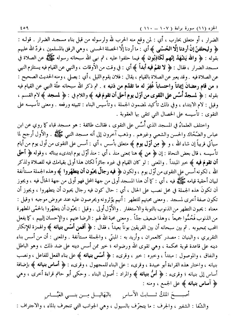 وَاخْتَلَفَ الْعُلَمَاءُ فِي الْمَسْجِدِ الَّذِي أُسِّسَ عَلَى التَّقْوَى، فَقَالَتْ طَائِفَةٌ: هُوَ مَسْجِدُ قُبَاءٍ كَمَا رُوِيَ عَنِ ابْنِ عَبَّاسٍ وَالضَّحَّاكِ وَالْحَسَنِ وَالشَّعْبِيِّ وَغَيْرِهِمْ. وَذَهَبَ آخَرُونَ إِلَى أَنَّهُ مَسْجِدُ النَّبِيِّ صلّى الله عليه وَسَلَّمَ. وَالْأَوَّلُ أَرْجَحُ لِمَا سَيَأْتِي قَرِيبًا إِنْ شاء الله، ومِنْ أَوَّلِ يَوْمٍ متعلق بأسس، أَيْ: أُسِّسَ عَلَى التَّقْوَى مِنْ أَوَّلِ يَوْمٍ مِنْ أَيَّامِ تَأْسِيسِهِ، قَالَ بَعْضُ النُّحَاةِ: إِنَّ مِنْ هُنَا بِمَعْنَى مُنْذُ، أَيْ: مُنْذُ أَوَّلِ يَوْمٍ ابْتُدِئَ بِبِنَائِهِ، وَقَوْلُهُ أَحَقُّ أَنْ تَقُومَ فِيهِ خَبَرُ الْمُبْتَدَأِ. وَالْمَعْنَى: لَوْ كَانَ الْقِيَامُ فِي غَيْرِهِ جَائِزًا لَكَانَ هَذَا أَوْلَى بِقِيَامِكَ فِيهِ لِلصَّلَاةِ وَلِذِكْرِ اللَّهِ، لِكَوْنِهِ أُسِّسَ عَلَى التَّقْوَى مِنْ أَوَّلِ يَوْمٍ، وَلِكَوْنِ فِيهِ رِجالٌ يُحِبُّونَ أَنْ يَتَطَهَّرُوا وَهَذِهِ الْجُمْلَةُ مُسْتَأْنَفَةٌ لِبَيَانِ أحقية قيامه صلّى الله عليه وَسَلَّمَ فِيهِ، أَيْ: كَمَا أَنَّ هَذَا الْمَسْجِدَ أَوْلَى مِنْ جِهَةِ الْمَحَلِّ فَهُوَ أَوْلَى مِنْ جِهَةِ الْحَالِ فِيهِ، وَيَجُوزُ أَنَّ تَكُونَ هَذِهِ الْجُمْلَةُ فِي مَحَلِّ نَصْبٍ عَلَى الْحَالِ، أَيْ: حَالَ كَوْنِ فِيهِ رِجَالٌ يُحِبُّونَ أَنْ يَتَطَهَّرُوا، ويجوز أن تكون صفة أخرى لمسجد. وَمَعْنَى مَحَبَّتِهِمْ لِلتَّطَهُّرِ: أَنَّهُمْ يُؤْثِرُونَهُ وَيَحْرِصُونَ عَلَيْهِ عِنْدَ عُرُوضِ مُوجِبِهِ وَقِيلَ: