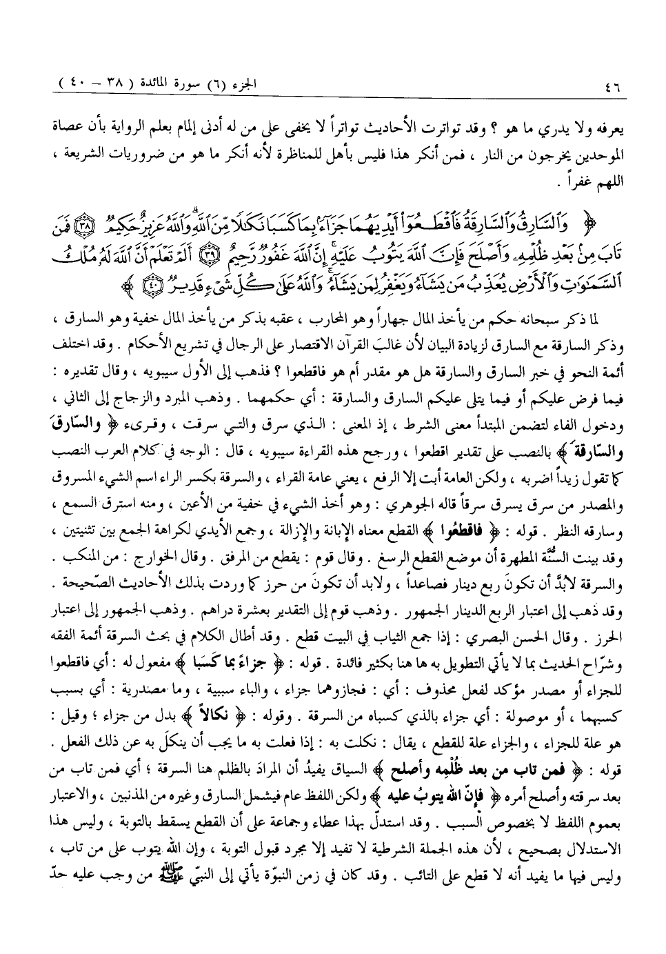 وَالسَّارِقُ وَالسَّارِقَةُ فَاقْطَعُوا أَيْدِيَهُما جَزاءً بِما كَسَبا نَكالاً مِنَ اللَّهِ وَاللَّهُ عَزِيزٌ حَكِيمٌ (38) فَمَنْ تابَ مِنْ بَعْدِ ظُلْمِهِ وَأَصْلَحَ فَإِنَّ اللَّهَ يَتُوبُ عَلَيْهِ إِنَّ اللَّهَ غَفُورٌ رَحِيمٌ (39) أَلَمْ تَعْلَمْ أَنَّ اللَّهَ لَهُ مُلْكُ السَّماواتِ وَالْأَرْضِ يُعَذِّبُ مَنْ يَشاءُ وَيَغْفِرُ لِمَنْ يَشاءُ وَاللَّهُ عَلى كُلِّ شَيْءٍ قَدِيرٌ (40)
