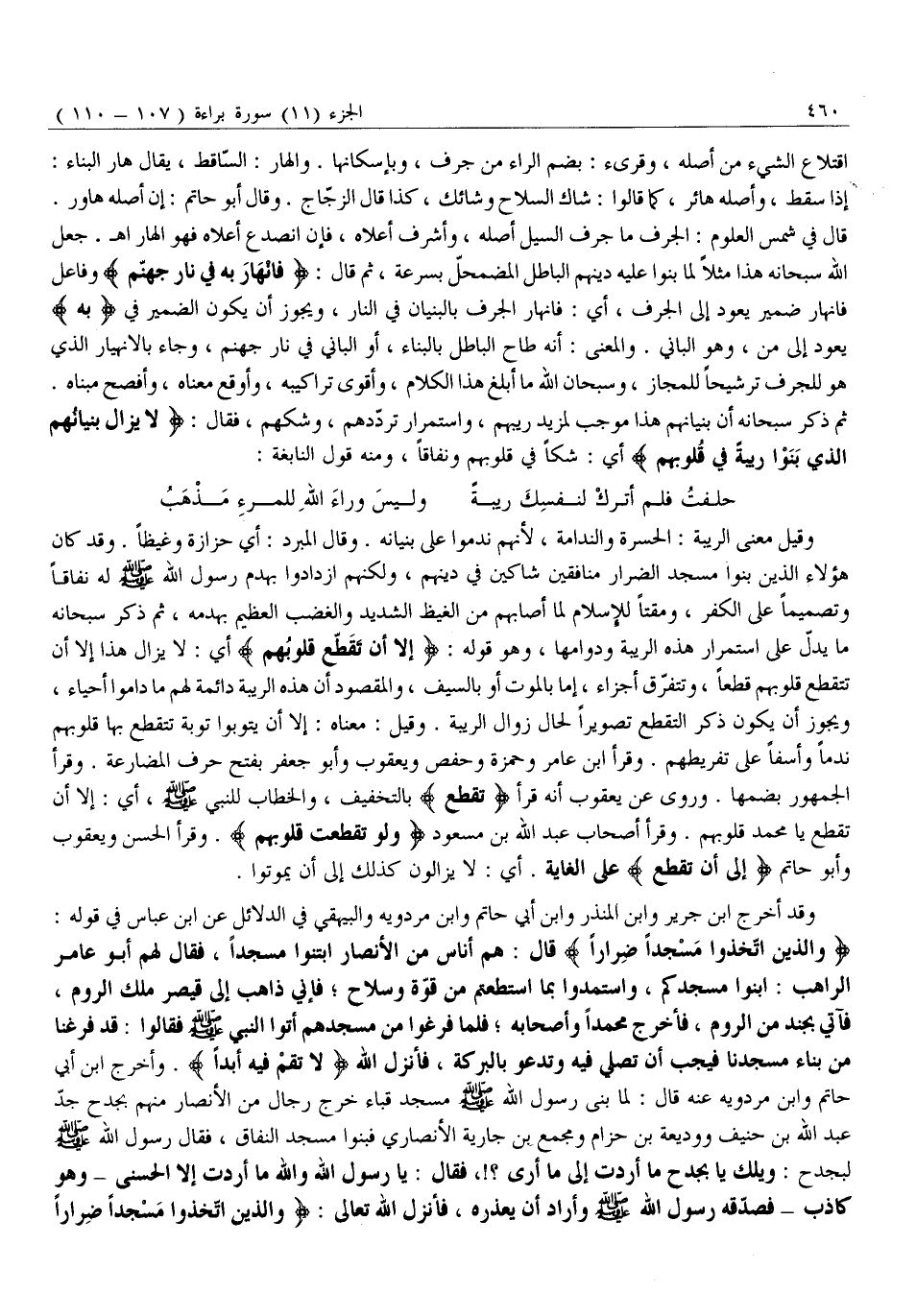 وَقِيلَ معنى الريبة: الْحَسْرَةُ وَالنَّدَامَةُ، لِأَنَّهُمْ نَدِمُوا عَلَى بُنْيَانِهِ. وَقَالَ المبرد: أي حزازة وَغَيْظًا. وَقَدْ كَانَ هَؤُلَاءِ الَّذِينَ بَنَوْا مَسْجِدَ الضِّرَارِ مُنَافِقِينَ شَاكِّينَ فِي دِينِهِمْ، وَلَكِنَّهُمُ ازْدَادُوا بهدم رسول الله صلّى الله عليه وسلّم له نِفَاقًا وَتَصْمِيمًا عَلَى الْكُفْرِ، وَمَقْتًا لِلْإِسْلَامِ لِمَا أَصَابَهُمْ مِنَ الْغَيْظِ الشَّدِيدِ وَالْغَضَبِ الْعَظِيمِ بِهَدْمِهِ، ثُمَّ ذَكَرَ سُبْحَانَهُ مَا يَدُلُّ عَلَى اسْتِمْرَارِ هَذِهِ الرِّيبَةِ وَدَوَامِهَا، وَهُوَ قَوْلُهُ: إِلَّا أَنْ تَقَطَّعَ قُلُوبُهُمْ أَيْ: لَا يَزَالُ هَذَا إِلَّا أَنْ تَتَقَطَّعَ قُلُوبُهُمْ قِطَعًا، وَتَتَفَرَّقَ أَجْزَاءً، إِمَّا بِالْمَوْتِ أَوْ بِالسَّيْفِ، وَالْمَقْصُودُ أَنَّ هَذِهِ الرِّيبَةَ دَائِمَةٌ لَهُمْ مَا دَامُوا أَحْيَاءً، وَيَجُوزُ أَنْ يَكُونَ ذِكْرُ التَّقَطُّعِ تَصْوِيرًا لِحَالِ زَوَالِ الرِّيبَةِ. وَقِيلَ: مَعْنَاهُ: إِلَّا أَنْ يَتُوبُوا تَوْبَةً تَتَقَطَّعُ بِهَا قُلُوبُهُمْ نَدَمًا وَأَسَفًا عَلَى تَفْرِيطِهِمْ. وَقَرَأَ ابْنُ عَامِرٍ وَحَمْزَةُ وَحَفَصٌ وَيَعْقُوبُ وَأَبُو جَعْفَرٍ بِفَتْحِ حَرْفِ الْمُضَارَعَةِ. وَقَرَأَ الْجُمْهُورُ بِضَمِّهَا. وَرُوِيَ عَنْ يَعْقُوبَ أَنَّهُ قَرَأَ تَقْطَعَ بِالتَّخْفِيفِ، وَالْخِطَابُ للنبي صلّى الله عليه وَسَلَّمَ، أَيْ: إِلَّا أَنْ تَقْطَعَ يَا مُحَمَّدُ قُلُوبَهُمْ. وَقَرَأَ أَصْحَابُ عَبْدِ اللَّهِ بْنِ مَسْعُودٍ وَلَوْ تَقَطَّعَتْ قُلُوبُهُمْ. وَقَرَأَ الْحَسَنُ وَيَعْقُوبُ وَأَبُو حَاتِمٍ إِلَى أَنْ تُقْطَعَ عَلَى الْغَايَةَ. أَيْ: لَا يَزَالُونَ كَذَلِكَ إِلَى أَنْ يَمُوتُوا.
