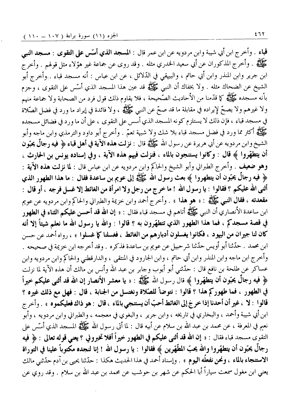 قُبَاءٍ. وَأَخْرَجَ ابْنُ أَبِي شَيْبَةَ وَابْنُ مَرْدَوَيْهِ عَنِ ابْنِ عُمَرَ قَالَ: الْمَسْجِدُ الَّذِي أُسِّسَ عَلَى التَّقْوَى: مَسْجِدُ النَّبِيِّ صَلَّى اللَّهُ عَلَيْهِ وَسَلَّمَ. وَأَخْرَجَ الْمَذْكُورَانِ عَنْ أَبِي سَعِيدٍ الْخُدْرِيِّ مِثْلَهُ. وَقَدْ رُوِيَ عَنْ جَمَاعَةٍ غَيْرِ هَؤُلَاءِ مِثْلُ قَوْلِهِمْ. وَأَخْرَجَ ابْنُ جَرِيرٍ وَابْنُ الْمُنْذِرِ وَابْنُ أَبِي حَاتِمٍ، وَالْبَيْهَقِيُّ فِي الدَّلَائِلِ، عَنِ ابْنِ عَبَّاسٍ: أَنَّهُ مَسْجِدُ قُبَاءٍ. وَأَخْرَجَ أَبُو الشيخ عن الضحاك مثله. وَلَا يَخْفَاكَ أَنَّ النَّبِيَّ صَلَّى اللَّهُ عَلَيْهِ وَسَلَّمَ قَدْ عَيَّنَ هَذَا الْمَسْجِدَ الَّذِي أُسِّسَ عَلَى التَّقْوَى، وَجَزَمَ بِأَنَّهُ مَسْجِدُهُ صَلَّى اللَّهُ عليه وَسَلَّمَ كَمَا قَدَّمْنَا مِنَ الْأَحَادِيثِ الصَّحِيحَةِ، فَلَا يُقَاوِمُ ذَلِكَ قَوْلُ فَرْدٍ مِنَ الصَّحَابَةِ وَلَا جَمَاعَةٍ مِنْهُمْ وَلَا غَيْرِهِمْ وَلَا يَصِحُّ لِإِيرَادِهِ فِي مُقَابَلَةِ مَا قَدْ صَحَّ عَنِ النَّبِيِّ صَلَّى اللَّهُ عَلَيْهِ وَسَلَّمَ، وَلَا فَائِدَةَ فِي إِيرَادِ مَا وَرَدَ فِي فَضْلِ الصَّلَاةِ فِي مَسْجِدِ قُبَاءٍ، فَإِنَّ ذَلِكَ لَا يَسْتَلْزِمُ كَوْنَهُ الْمَسْجِدَ الَّذِي أُسِّسَ عَلَى التَّقْوَى، عَلَى أَنَّ مَا وَرَدَ فِي فضائل مسجده صلّى الله عليه وَسَلَّمَ أَكْثَرُ مِمَّا وَرَدَ فِي فَضْلِ مَسْجِدِ قُبَاءٍ بِلَا شَكٍّ وَلَا شُبْهَةٍ تَعُمُّ. وَأَخْرَجَ أَبُو دَاوُدَ وَالتِّرْمِذِيُّ وَابْنُ مَاجَهْ وَأَبُو الشَّيْخِ وَابْنُ مَرْدَوَيْهِ عَنْ أَبِي هُرَيْرَةَ عَنْ رَسُولِ اللَّهِ صَلَّى اللَّهُ عَلَيْهِ وَسَلَّمَ قَالَ: نَزَلَتْ هَذِهِ الْآيَةُ فِي أَهْلِ قُبَاءٍ فِيهِ رِجالٌ يُحِبُّونَ أَنْ يَتَطَهَّرُوا قَالَ: وَكَانُوا يَسْتَنْجُونَ بِالْمَاءِ، فَنَزَلَتْ فِيهِمْ هَذِهِ الْآيَةُ، وَفِي إِسْنَادِهِ يُونُسُ بْنُ الْحَارِثِ، وَهُوَ ضَعِيفٌ. وَأَخْرَجَ الطَّبَرَانِيُّ وَأَبُو الشَّيْخِ وَالْحَاكِمُ وَابْنُ مَرْدَوَيْهِ عَنِ ابْنِ عَبَّاسٍ قَالَ: لَمَّا نَزَلَتْ هَذِهِ الْآيَةُ: