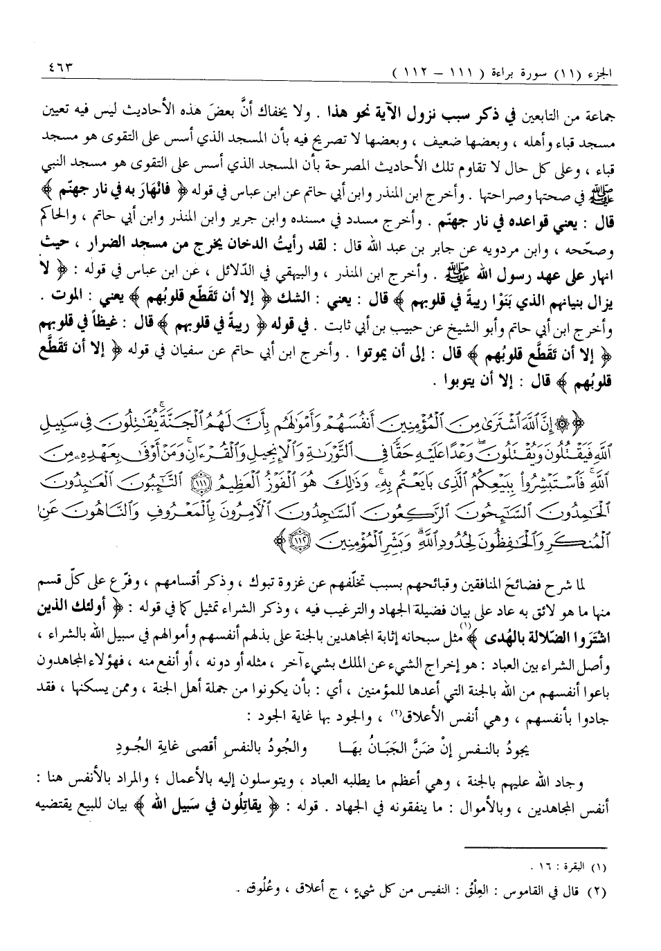 إِنَّ اللَّهَ اشْتَرى مِنَ الْمُؤْمِنِينَ أَنْفُسَهُمْ وَأَمْوالَهُمْ بِأَنَّ لَهُمُ الْجَنَّةَ يُقاتِلُونَ فِي سَبِيلِ اللَّهِ فَيَقْتُلُونَ وَيُقْتَلُونَ وَعْداً عَلَيْهِ حَقًّا فِي التَّوْراةِ وَالْإِنْجِيلِ وَالْقُرْآنِ وَمَنْ أَوْفى بِعَهْدِهِ مِنَ اللَّهِ فَاسْتَبْشِرُوا بِبَيْعِكُمُ الَّذِي بايَعْتُمْ بِهِ وَذلِكَ هُوَ الْفَوْزُ الْعَظِيمُ (111) التَّائِبُونَ الْعابِدُونَ الْحامِدُونَ السَّائِحُونَ الرَّاكِعُونَ السَّاجِدُونَ الْآمِرُونَ بِالْمَعْرُوفِ وَالنَّاهُونَ عَنِ الْمُنْكَرِ وَالْحافِظُونَ لِحُدُودِ اللَّهِ وَبَشِّرِ الْمُؤْمِنِينَ (112)