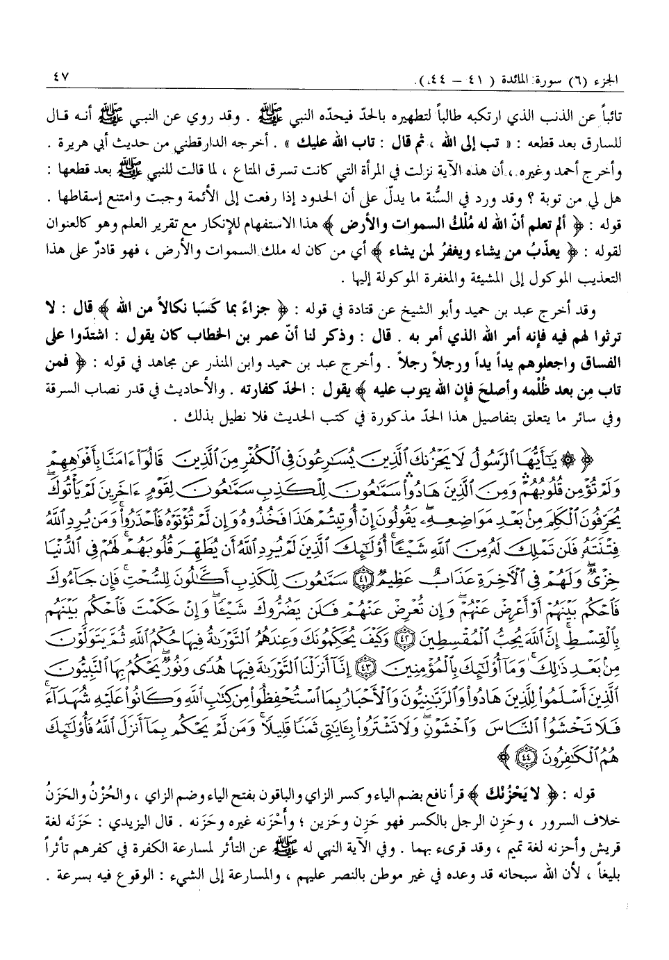 يَا أَيُّهَا الرَّسُولُ لَا يَحْزُنْكَ الَّذِينَ يُسارِعُونَ فِي الْكُفْرِ مِنَ الَّذِينَ قالُوا آمَنَّا بِأَفْواهِهِمْ وَلَمْ تُؤْمِنْ قُلُوبُهُمْ وَمِنَ الَّذِينَ هادُوا سَمَّاعُونَ لِلْكَذِبِ سَمَّاعُونَ لِقَوْمٍ آخَرِينَ لَمْ يَأْتُوكَ يُحَرِّفُونَ الْكَلِمَ مِنْ بَعْدِ مَواضِعِهِ يَقُولُونَ إِنْ أُوتِيتُمْ هَذَا فَخُذُوهُ وَإِنْ لَمْ تُؤْتَوْهُ فَاحْذَرُوا وَمَنْ يُرِدِ اللَّهُ فِتْنَتَهُ فَلَنْ تَمْلِكَ لَهُ مِنَ اللَّهِ شَيْئاً أُولئِكَ الَّذِينَ لَمْ يُرِدِ اللَّهُ أَنْ يُطَهِّرَ قُلُوبَهُمْ لَهُمْ فِي الدُّنْيا خِزْيٌ وَلَهُمْ فِي الْآخِرَةِ عَذابٌ عَظِيمٌ (41) سَمَّاعُونَ لِلْكَذِبِ أَكَّالُونَ لِلسُّحْتِ فَإِنْ جاؤُكَ فَاحْكُمْ بَيْنَهُمْ أَوْ أَعْرِضْ عَنْهُمْ وَإِنْ تُعْرِضْ عَنْهُمْ فَلَنْ يَضُرُّوكَ شَيْئاً وَإِنْ حَكَمْتَ فَاحْكُمْ بَيْنَهُمْ بِالْقِسْطِ إِنَّ اللَّهَ يُحِبُّ الْمُقْسِطِينَ (42) وَكَيْفَ يُحَكِّمُونَكَ وَعِنْدَهُمُ التَّوْراةُ فِيها حُكْمُ اللَّهِ ثُمَّ يَتَوَلَّوْنَ مِنْ بَعْدِ ذلِكَ وَما أُولئِكَ بِالْمُؤْمِنِينَ (43) إِنَّا أَنْزَلْنَا التَّوْراةَ فِيها هُدىً وَنُورٌ يَحْكُمُ بِهَا النَّبِيُّونَ الَّذِينَ أَسْلَمُوا لِلَّذِينَ هادُوا وَالرَّبَّانِيُّونَ وَالْأَحْبارُ بِمَا اسْتُحْفِظُوا مِنْ كِتابِ اللَّهِ وَكانُوا عَلَيْهِ شُهَداءَ فَلا تَخْشَوُا النَّاسَ وَاخْشَوْنِ وَلا تَشْتَرُوا بِآياتِي ثَمَناً قَلِيلاً وَمَنْ لَمْ يَحْكُمْ بِما أَنْزَلَ اللَّهُ فَأُولئِكَ هُمُ الْكافِرُونَ (44)