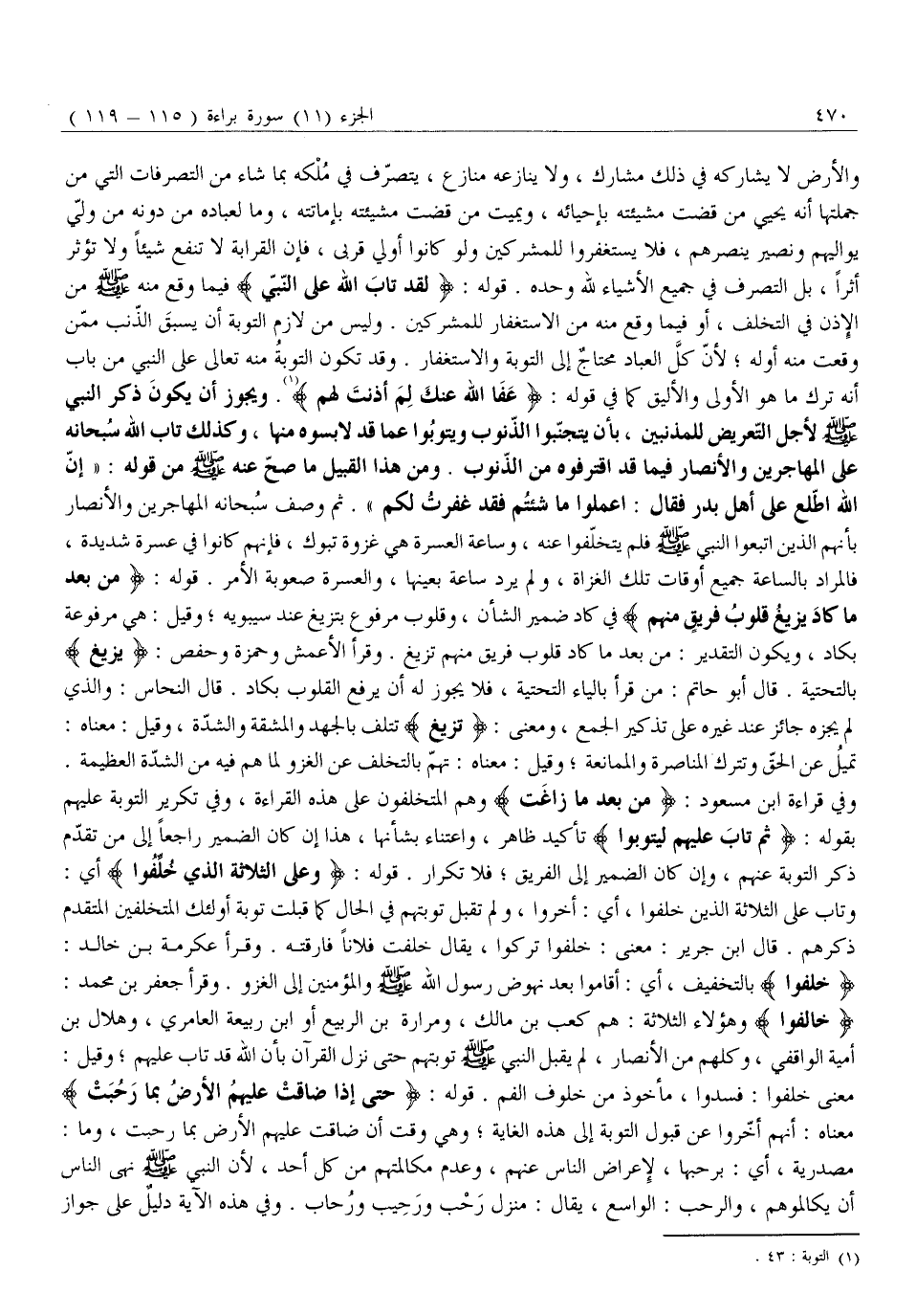 وَفِي قِرَاءَةِ ابْنِ مَسْعُودٍ: مِنْ بَعْدِ مَا زَاغَتْ وَهُمُ الْمُتَخَلِّفُونَ عَلَى هَذِهِ الْقِرَاءَةِ، وَفِي تَكْرِيرِ التَّوْبَةِ عَلَيْهِمْ بِقَوْلِهِ: ثُمَّ تابَ عَلَيْهِمْ لِيَتُوبُوا تَأْكِيدٌ ظَاهِرٌ، وَاعْتِنَاءٌ بِشَأْنِهَا، هَذَا إِنْ كَانَ الضَّمِيرُ رَاجِعًا إِلَى مَنْ تَقَدَّمَ ذِكْرُ التَّوْبَةِ عَنْهُمْ، وَإِنْ كَانَ الضَّمِيرُ إِلَى الْفَرِيقِ فَلَا تَكْرَارَ. قَوْلُهُ: وَعَلَى الثَّلاثَةِ الَّذِينَ خُلِّفُوا أَيْ: