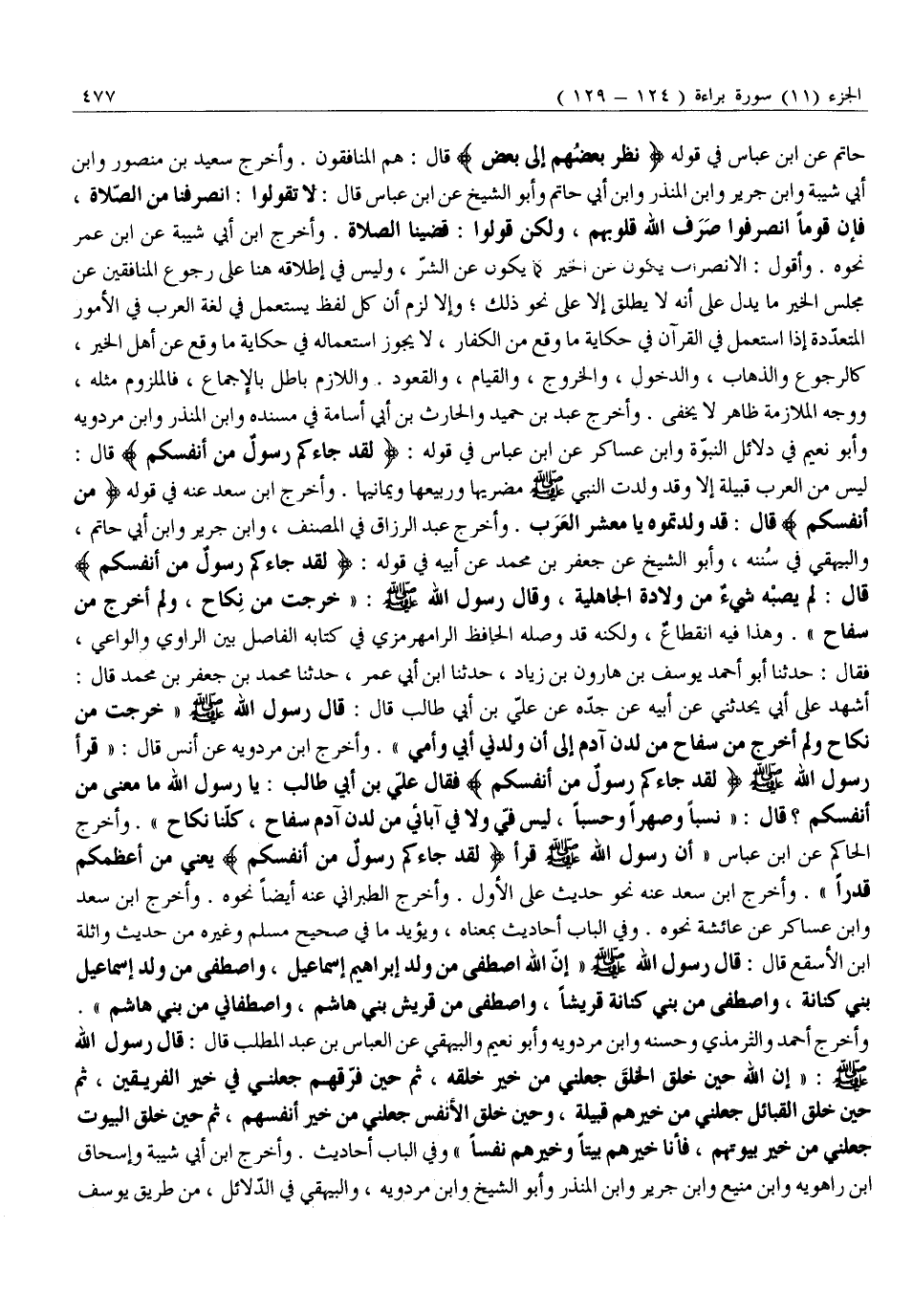 لَيْسَ مِنَ الْعَرَبِ قَبِيلَةٌ إِلَّا وَقَدْ وَلَدَتِ النَّبِيَّ صَلَّى اللَّهُ عليه وَسَلَّمَ مُضَرِيُّهَا وَرَبِيعُهَا وَيَمَانِيُّهَا. وَأَخْرَجَ ابْنُ سَعْدٍ عَنْهُ فِي قَوْلِهِ مِنْ أَنْفُسِكُمْ قَالَ: قَدْ وَلَدْتُمُوهُ يَا مَعْشَرَ الْعَرَبِ. وَأَخْرَجَ عَبْدُ الرَّزَّاقِ فِي الْمُصَنَّفِ، وَابْنُ جَرِيرٍ وَابْنُ أَبِي حَاتِمٍ، وَالْبَيْهَقِيُّ فِي سُنَنِهِ، وَأَبُو الشَّيْخِ عَنْ جَعْفَرِ بْنِ مُحَمَّدٍ عَنْ أَبِيهِ فِي قَوْلِهِ: لَقَدْ جاءَكُمْ رَسُولٌ مِنْ أَنْفُسِكُمْ قَالَ: لَمْ يُصِبْهُ شَيْءٌ مِنْ وِلَادَةِ الْجَاهِلِيَّةِ، وَقَالَ رَسُولُ اللَّهِ صَلَّى اللَّهُ عَلَيْهِ وَسَلَّمَ: «خَرَجْتُ مِنْ نِكَاحٍ، وَلَمْ أَخْرُجْ مِنْ سِفَاحٍ» . وَهَذَا فِيهِ انْقِطَاعٌ، وَلَكِنَّهُ قَدْ وَصَلَهُ الْحَافِظُ الرَّامَهُرْمُزِيُّ فِي كِتَابِهِ الْفَاصِلِ بَيْنَ الرَّاوِي وَالْوَاعِي، فَقَالَ: حَدَّثَنَا أَبُو أَحْمَدَ يُوسُفُ بْنُ هَارُونَ بْنِ زِيَادٍ، حَدَّثَنَا ابْنُ أَبِي عُمَرَ، حَدَّثَنَا مُحَمَّدُ بْنُ جَعْفَرِ بْنِ مُحَمَّدٍ قَالَ: