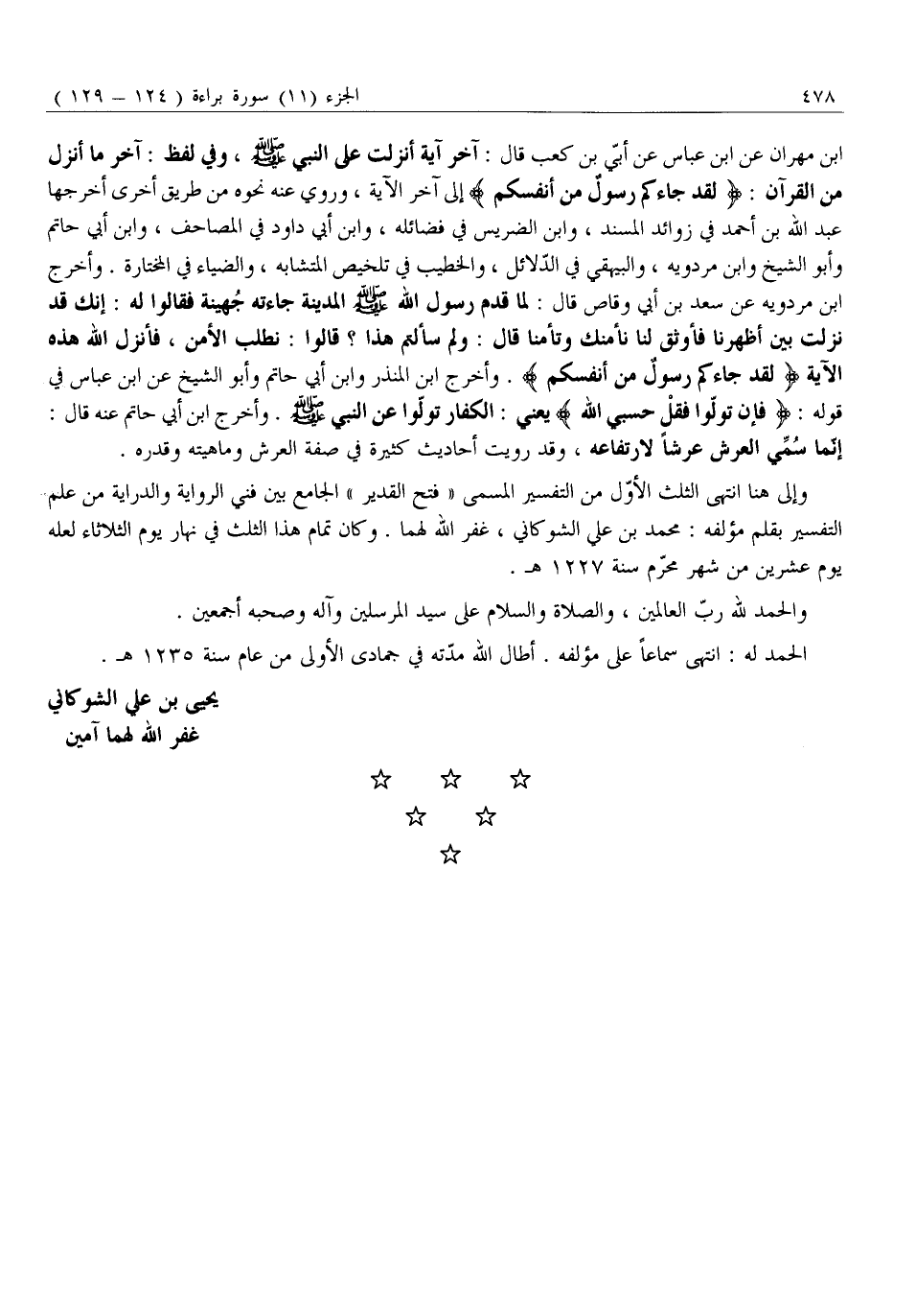 وَإِلَى هُنَا انْتَهَى الثُّلُثُ الْأَوَّلُ مِنَ التَّفْسِيرِ الْمُسَمَّى «فَتْحُ الْقَدِيرِ» الْجَامِعُ بَيْنَ فَنَّيِ الرِّوَايَةِ وَالدِّرَايَةِ مِنْ عِلْمِ التَّفْسِيرِ بِقَلَمِ مُؤَلِّفِهِ: مُحَمَّدِ بْنِ عَلِيٍّ الشَّوْكَانِيِّ، غَفَرَ اللَّهُ لَهُمَا. وَكَانَ تَمَامُ هَذَا الثُّلُثِ فِي نَهَارِ يَوْمِ الثُّلَاثَاءِ لَعَلَّهُ يَوْمُ عِشْرِينَ مِنْ شَهْرِ مُحَرَّمٍ سَنَةَ 1227 هـ.