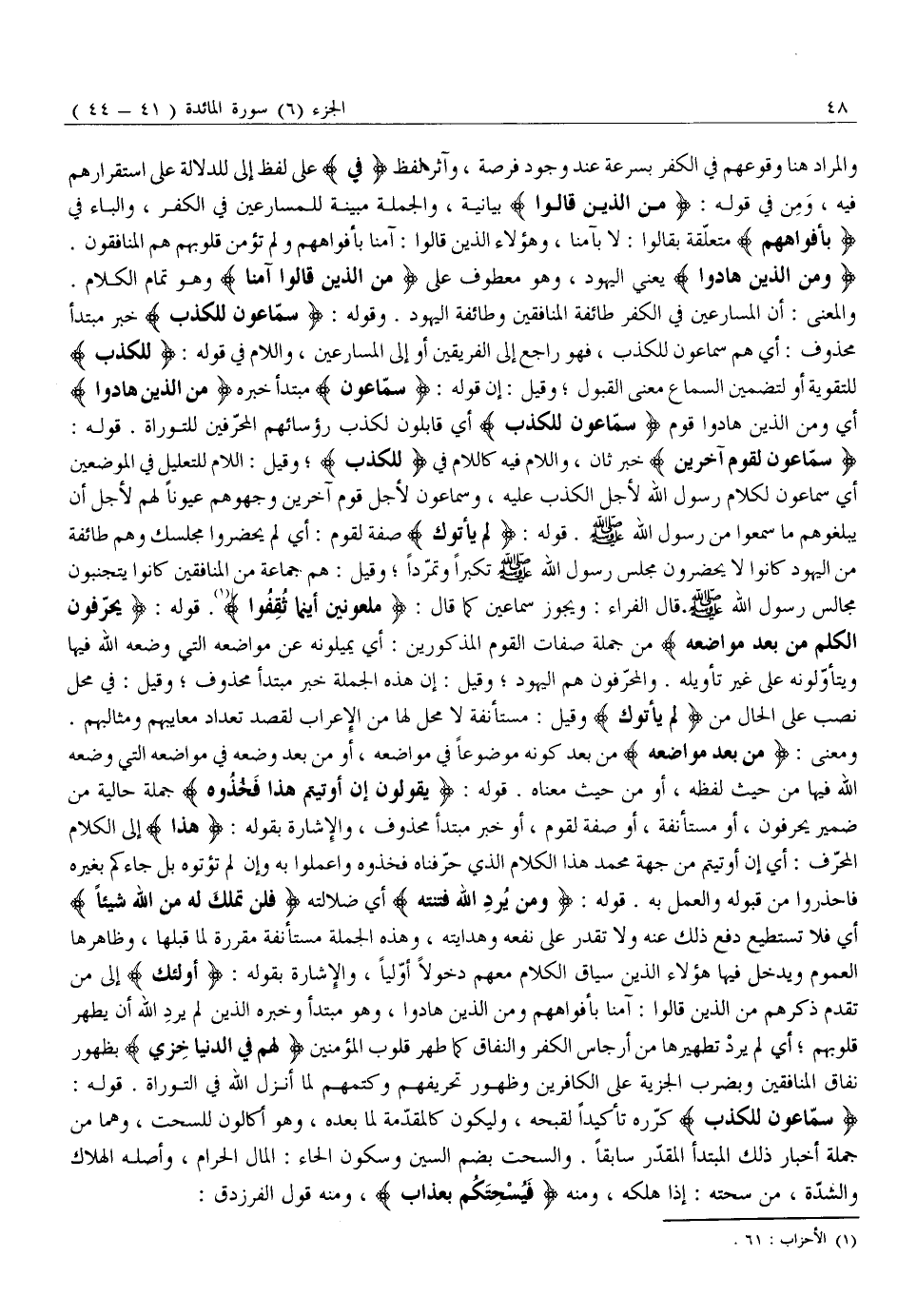 وَالْمَعْنَى: أَنَّ الْمُسَارِعِينَ فِي الْكُفْرِ طَائِفَةُ الْمُنَافِقِينَ وَطَائِفَةُ الْيَهُودِ. وَقَوْلُهُ: سَمَّاعُونَ لِلْكَذِبِ خَبَرُ مُبْتَدَأٍ مَحْذُوفٍ: أَيْ هُمْ سَمَّاعُونَ لِلْكَذِبِ، فَهُوَ رَاجِعٌ إِلَى الْفَرِيقَيْنِ أَوْ إِلَى الْمُسَارِعِينَ، وَاللَّامُ فِي قَوْلِهِ: لِلْكَذِبِ لِلتَّقْوِيَةِ أَوْ لِتَضْمِينِ السَّمَاعِ مَعْنَى الْقَبُولِ وَقِيلَ: إِنَّ قَوْلَهَ: سَمَّاعُونَ مُبْتَدَأٌ خَبَرُهُ مِنَ الَّذِينَ هادُوا أَيْ وَمِنَ الَّذِينَ هَادُوا قَوْمٌ سَمَّاعُونَ لِلْكَذِبِ أَيْ قَابَلُونِ لِكَذِبِ رُؤَسَائِهِمُ الْمُحَرِّفِينَ لِلتَّوْرَاةِ. قَوْلُهُ: