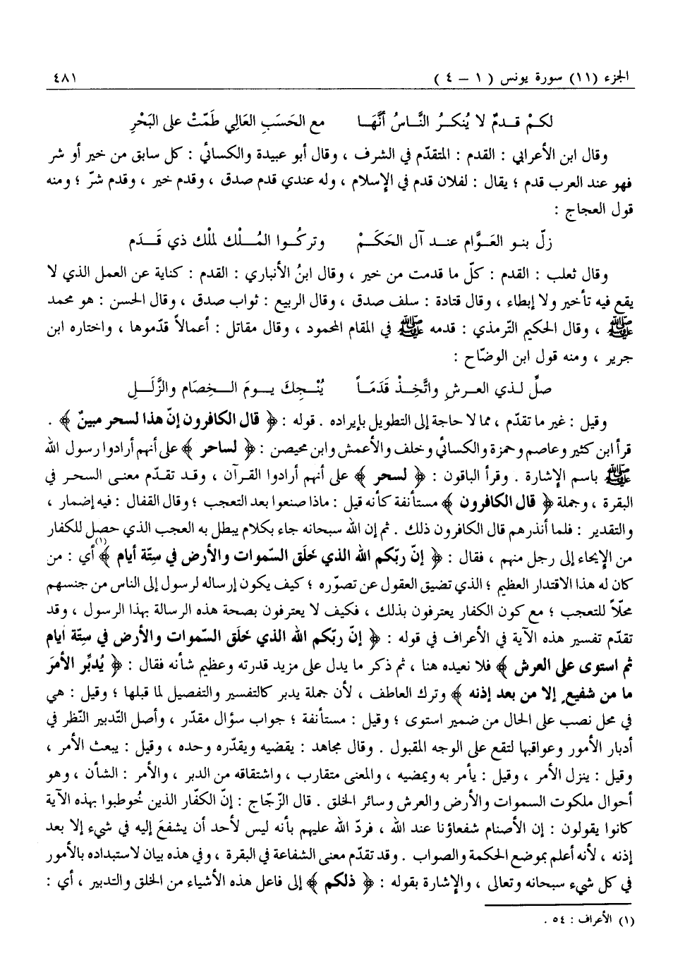 قَرَأَ ابْنُ كَثِيرٍ وَعَاصِمٌ وَحَمْزَةُ وَالْكِسَائِيُّ وَخَلَفٌ وَالْأَعْمَشُ وَابْنُ مُحَيْصِنٍ: لَساحِرٌ عَلَى أَنَّهُمْ أَرَادُوا رَسُولَ الله صلّى الله عليه وَسَلَّمَ بِاسْمِ الْإِشَارَةِ. وَقَرَأَ الْبَاقُونَ: لَسِحْرٌ عَلَى أَنَّهُمْ أَرَادُوا الْقُرْآنَ، وَقَدْ تَقَدَّمَ مَعْنَى السِّحْرِ فِي الْبَقَرَةِ، وَجُمْلَةُ قالَ الْكافِرُونَ مُسْتَأْنَفَةٌ كَأَنَّهُ قِيلَ: مَاذَا صَنَعُوا بَعْدَ التَّعَجُّبِ وَقَالَ الْقَفَّالُ: فِيهِ إِضْمَارٌ، وَالتَّقْدِيرُ: فَلَمَّا أَنْذَرَهُمْ قَالَ الْكَافِرُونَ ذَلِكَ. ثُمَّ إِنَّ اللَّهَ سُبْحَانَهُ جَاءَ بِكَلَامٍ يُبْطِلُ بِهِ الْعَجَبَ الَّذِي حَصَلَ لِلْكُفَّارِ مِنَ الْإِيحَاءِ إِلَى رَجُلٍ مِنْهُمْ، فَقَالَ: إِنَّ رَبَّكُمُ اللَّهُ الَّذِي خَلَقَ السَّماواتِ وَالْأَرْضَ فِي سِتَّةِ أَيَّامٍ «1» أَيْ: مَنْ كَانَ لَهُ هَذَا الِاقْتِدَارُ الْعَظِيمُ الَّذِي تَضِيقُ الْعُقُولُ عَنْ تَصَوُّرِهِ كَيْفَ يَكُونُ إِرْسَالُهُ لِرَسُولٍ إِلَى النَّاسِ مِنْ جِنْسِهِمْ مَحَلًّا لِلتَّعَجُّبِ مَعَ كَوْنِ الْكُفَّارِ يَعْتَرِفُونَ بِذَلِكَ، فَكَيْفَ لَا يَعْتَرِفُونَ بِصِحَّةِ هَذِهِ الرِّسَالَةِ بِهَذَا الرَّسُولِ، وَقَدْ تَقَدَّمَ تَفْسِيرُ هَذِهِ الْآيَةِ فِي الْأَعْرَافِ فِي قَوْلُهُ: إِنَّ رَبَّكُمُ اللَّهُ الَّذِي خَلَقَ السَّماواتِ وَالْأَرْضَ فِي سِتَّةِ أَيَّامٍ ثُمَّ اسْتَوى عَلَى الْعَرْشِ فَلَا نُعِيدُهُ هُنَا، ثُمَّ ذَكَرَ مَا يَدُلُّ عَلَى مَزِيدِ قُدْرَتِهِ وَعَظِيمِ شَأْنِهِ فَقَالَ: يُدَبِّرُ الْأَمْرَ مَا مِنْ شَفِيعٍ إِلَّا مِنْ بَعْدِ إِذْنِهِ وَتَرَكَ الْعَاطِفَ، لِأَنَّ جُمْلَةَ يُدَبِّرُ كَالتَّفْسِيرِ وَالتَّفْصِيلِ لِمَا قَبْلَهَا وَقِيلَ: هِيَ فِي مَحَلِّ نَصْبٍ عَلَى الْحَالِ مِنْ ضَمِيرِ اسْتَوَى وَقِيلَ: مُسْتَأْنَفَةٌ جَوَابُ سُؤَالٍ مُقَدَّرٍ، وَأَصْلُ التَّدْبِيرِ النَّظَرُ فِي أَدْبَارِ الْأُمُورِ وَعَوَاقِبِهَا لِتَقَعَ عَلَى الْوَجْهِ الْمَقْبُولِ. وَقَالَ مُجَاهِدٌ: يَقْضِيهِ وَيُقَدِّرُهُ وَحْدَهُ، وَقِيلَ: يَبْعَثُ الْأَمْرَ، وَقِيلَ: يُنَزِّلُ الْأَمْرَ، وَقِيلَ: يَأْمُرُ بِهِ وَيُمْضِيهِ، وَالْمَعْنَى مُتَقَارِبٌ، وَاشْتِقَاقُهُ مِنَ الدُّبُرِ، وَالْأَمْرُ: الشَّأْنُ، وَهُوَ أَحْوَالُ ملكوت السموات وَالْأَرْضِ وَالْعَرْشِ وَسَائِرِ الْخَلْقِ. قَالَ الزَّجَّاجُ: إِنَّ الْكُفَّارَ الَّذِينَ خُوطِبُوا بِهَذِهِ الْآيَةِ كَانُوا يَقُولُونَ: إِنَّ الْأَصْنَامَ شُفَعَاؤُنَا عِنْدَ اللَّهِ، فَرَدَّ اللَّهُ عَلَيْهِمْ بِأَنَّهُ لَيْسَ لِأَحَدٍ أَنْ يَشْفَعَ إِلَيْهِ فِي شَيْءٍ إِلَّا بَعْدَ إِذْنِهِ، لِأَنَّهُ أَعْلَمُ بِمَوْضِعِ الْحِكْمَةِ وَالصَّوَابِ. وَقَدْ تَقَدَّمَ مَعْنَى الشَّفَاعَةِ في البقرة، وفي هذه بَيَانٌ لِاسْتِبْدَادِهِ بِالْأُمُورِ فِي كُلِّ شَيْءٍ سُبْحَانَهُ وَتَعَالَى، وَالْإِشَارَةُ بِقَوْلِهِ: ذلِكُمُ إِلَى فَاعِلِ هَذِهِ الأشياء من الخلق والتدبير، أي: