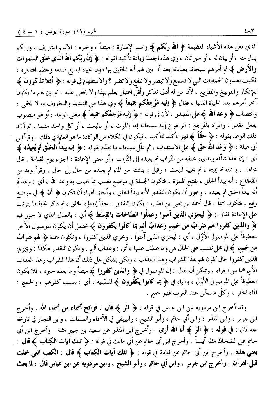 الَّذِي فَعَلَ هَذِهِ الْأَشْيَاءَ الْعَظِيمَةَ اللَّهُ رَبُّكُمْ وَاسْمُ الْإِشَارَةِ: مُبْتَدَأٌ، وَخَبَرُهُ: الِاسْمُ الشَّرِيفُ، وَرَبُّكُمْ بَدَلٌ مِنْهُ، أَوْ بَيَانٌ لَهُ، أَوْ خَبَرٌ ثَانٍ، وَفِي هَذِهِ الْجُمْلَةِ زِيَادَةُ تَأْكِيدٍ لِقَوْلِهِ: إِنَّ رَبَّكُمُ اللَّهُ الَّذِي خَلَقَ السَّماواتِ وَالْأَرْضَ ثُمَّ أَمَرَهُمْ سُبْحَانَهُ بِعِبَادَتِهِ بَعْدَ أَنْ بَيَّنَ لَهُمْ أَنَّهُ الْحَقِيقُ بِهَا دُونَ غَيْرِهِ لِبَدِيعِ صُنْعِهِ وَعَظِيمِ اقْتِدَارِهِ، فَكَيْفَ يَعْبُدُونَ الْجَمَادَاتِ الَّتِي لَا تَسْمَعُ وَلَا تُبْصِرُ وَلَا تَنْفَعُ وَلَا تَضُرُّ؟ وَالِاسْتِفْهَامُ فِي قَوْلِهِ: أَفَلا تَذَكَّرُونَ لِلْإِنْكَارِ وَالتَّوْبِيخِ وَالتَّقْرِيعِ، لِأَنَّ مَنْ لَهُ أَدْنَى تَذَكُّرٍ وَأَقَلُّ اعْتِبَارٍ يَعْلَمُ بِهَذَا وَلَا يَخْفَى عَلَيْهِ، ثُمَّ بَيَّنَ لَهُمْ مَا يَكُونُ آخِرَ أَمْرِهِمْ بَعْدَ الْحَيَاةِ الدُّنْيَا، فَقَالَ إِلَيْهِ مَرْجِعُكُمْ جَمِيعاً وَفِي هَذَا مِنَ التَّهْدِيدِ وَالتَّخْوِيفِ مَا لَا يَخْفَى، وَانْتِصَابُ وَعْدَ اللَّهِ عَلَى الْمَصْدَرِ، لِأَنَّ فِي قَوْلِهِ: إِلَيْهِ مَرْجِعُكُمْ جَمِيعاً مَعْنَى الْوَعْدِ، أَوْ هُوَ مَنْصُوبٌ بِفِعْلٍ مُقَدَّرٍ، وَالْمُرَادُ بِالْمَرْجِعِ: الرُّجُوعُ إِلَيْهِ سُبْحَانَهُ إِمَّا بِالْمَوْتِ، أَوْ بِالْبَعْثِ، أو كل وَاحِدٍ مِنْهُمَا، ثُمَّ أَكَّدَ ذَلِكَ الْوَعْدَ بِقَوْلِهِ: حَقًّا فَهُوَ تَأْكِيدٌ لِتَأْكِيدٍ، فَيَكُونُ فِي الْكَلَامِ مِنَ الْوِكَادَةِ مَا هُوَ الْغَايَةُ فِي ذَلِكَ. وَقَرَأَ ابْنُ أَبِي عَبْلَةَ: وَعْدُ اللَّهِ حَقٌّ عَلَى الِاسْتِئْنَافِ، ثُمَّ عَلَّلَ سُبْحَانَهُ مَا تَقَدَّمَ بقوله: إِنَّهُ يَبْدَؤُا الْخَلْقَ ثُمَّ يُعِيدُهُ أَيْ: إِنَّ هَذَا شَأْنُهُ يَبْتَدِئُ خَلْقَهُ مِنَ التُّرَابِ ثُمَّ يُعِيدُهُ إِلَى التُّرَابِ، أَوْ مَعْنَى الْإِعَادَةِ: الْجَزَاءُ يَوْمَ الْقِيَامَةِ. قَالَ مُجَاهِدٌ: يُنْشِئُهُ ثُمَّ يُمِيتُهُ، ثُمَّ يُحْيِيهِ لِلْبَعْثِ وَقِيلَ: يُنْشِئُهُ مِنَ الْمَاءِ ثُمَّ يُعِيدُهُ مِنْ حَالٍ إِلَى حَالٍ. وَقَرَأَ يَزِيدُ بْنُ الْقَعْقَاعِ: أَنَّهُ يَبْدَأُ الْخَلْقَ، بِفَتْحِ الْهَمْزَةِ، فَتَكُونُ الْجُمْلَةُ فِي مَوْضِعِ نَصْبٍ بِمَا نُصِبَ بِهِ وَعْدَ اللَّهِ، أَيْ: وَعَدَكُمْ أَنَّهُ يَبْدَأُ الْخَلْقَ ثُمَّ يُعِيدُهُ، وَيَجُوزُ أَنْ يَكُونَ التَّقْدِيرُ لِأَنَّهُ يَبْدَأُ الْخَلْقَ، وَأَجَازَ الْفَرَّاءُ أَنْ تَكُونَ أَنَّ فِي مَوْضِعِ رَفْعٍ، فَتَكُونَ اسْمًا. قَالَ أَحْمَدُ بْنُ يَحْيَى بْنِ ثَعْلَبٍ: يَكُونُ التَّقْدِيرُ: حَقًّا إِبْدَاؤُهُ الْخَلْقَ، ثُمَّ ذَكَرَ غَايَةَ مَا يَتَرَتَّبُ عَلَى الْإِعَادَةِ فَقَالَ: لِيَجْزِيَ الَّذِينَ آمَنُوا وَعَمِلُوا الصَّالِحاتِ بِالْقِسْطِ أَيْ: بِالْعَدْلِ الَّذِي لَا جَوْرَ فِيهِ وَالَّذِينَ كَفَرُوا لَهُمْ شَرابٌ مِنْ حَمِيمٍ وَعَذابٌ أَلِيمٌ بِما كانُوا يَكْفُرُونَ يُحْتَمَلُ أَنْ يَكُونَ الْمَوْصُولُ الْآخَرُ مَعْطُوفًا عَلَى الْمَوْصُولِ الْأَوَّلِ، أَيْ: لِيَجْزِيَ الَّذِينَ آمَنُوا، وَيَجْزِيَ الَّذِينَ كَفَرُوا، وَتَكُونُ جُمْلَةُ لَهُمْ شَرابٌ مِنْ حَمِيمٍ