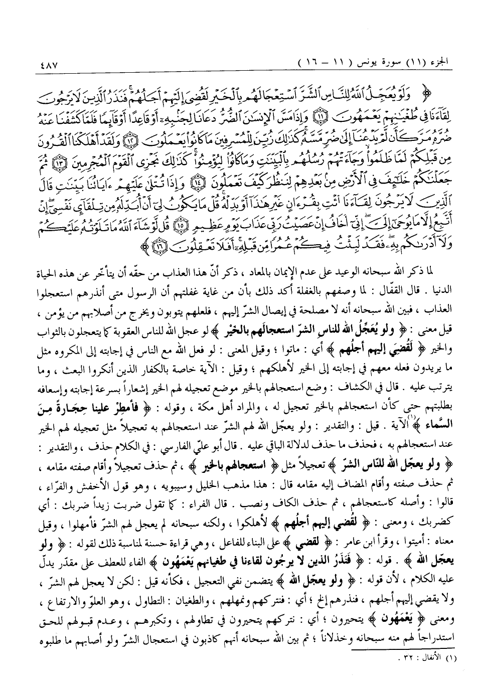 وَلَوْ يُعَجِّلُ اللَّهُ لِلنَّاسِ الشَّرَّ تَعْجِيلًا مِثْلَ اسْتِعْجالَهُمْ بِالْخَيْرِ، ثُمَّ حَذَفَ تَعْجِيلًا وَأَقَامَ صِفَتَهُ مَقَامَهُ، ثُمَّ حَذَفَ صِفَتَهُ وَأَقَامَ الْمُضَافَ إِلَيْهِ مَقَامَهُ قَالَ: هَذَا مَذْهَبُ الْخَلِيلِ وَسِيبَوَيْهِ، وَهُوَ قَوْلُ الْأَخْفَشِ وَالْفَرَّاءِ، قَالُوا: وَأَصْلُهُ كَاسْتِعْجَالِهِمْ، ثُمَّ حُذِفَ الْكَافُ وَنُصِبَ. قَالَ الْفَرَّاءُ: كَمَا تَقُولُ ضَرَبْتُ زَيْدًا ضَرْبَكَ: أَيْ كَضَرْبِكَ، وَمَعْنَى: لَقُضِيَ إِلَيْهِمْ أَجَلُهُمْ لَأُهْلِكُوا، وَلَكِنَّهُ سُبْحَانَهُ لَمْ يُعَجِّلْ لَهُمُ الشَّرَّ فَأُمْهِلُوا، وَقِيلَ مَعْنَاهُ: أُمِيتُوا، وَقَرَأَ ابْنُ عَامِرٍ: لَقَضَى عَلَى الْبِنَاءِ لِلْفَاعِلِ، وَهِيَ قِرَاءَةٌ حَسَنَةٌ لِمُنَاسَبَةِ ذَلِكَ لِقَوْلِهِ: وَلَوْ يُعَجِّلُ اللَّهُ. قَوْلُهُ: فَنَذَرُ الَّذِينَ لَا يَرْجُونَ لِقاءَنا فِي طُغْيانِهِمْ يَعْمَهُونَ الْفَاءُ لِلْعَطْفِ عَلَى مُقَدَّرٍ يَدُلُّ عَلَيْهِ الْكَلَامُ، لِأَنَّ قَوْلَهُ: وَلَوْ يُعَجِّلُ اللَّهُ يَتَضَمَّنُ نَفْيَ التَّعْجِيلِ، فَكَأَنَّهُ قِيلَ: لَكِنْ لَا يُعَجِّلُ لَهُمُ الشَّرَّ، وَلَا يَقْضِي إِلَيْهِمْ أَجْلَهُمْ، فَنَذَرُهُمْ إِلَخْ أَيْ: فَنَتْرُكُهُمْ وَنُمْهِلُهُمْ، وَالطُّغْيَانُ: التَّطَاوُلُ، وَهُوَ الْعُلُوُّ وَالِارْتِفَاعُ، وَمَعْنَى يَعْمَهُونَ يَتَحَيَّرُونَ أَيْ: نَتْرُكُهُمْ يَتَحَيَّرُونَ فِي تَطَاوُلِهِمْ، وَتَكَبُّرِهِمْ، وَعَدَمِ قَبُولِهِمْ لِلْحَقِّ اسْتِدْرَاجًا لَهُمْ مِنْهُ سُبْحَانَهُ وَخُذْلَانًا ثُمَّ بَيَّنَ اللَّهُ سُبْحَانَهُ أَنَّهُمْ كَاذِبُونَ فِي اسْتِعْجَالِ الشَّرِّ ولو أصابهم ما طلبوه