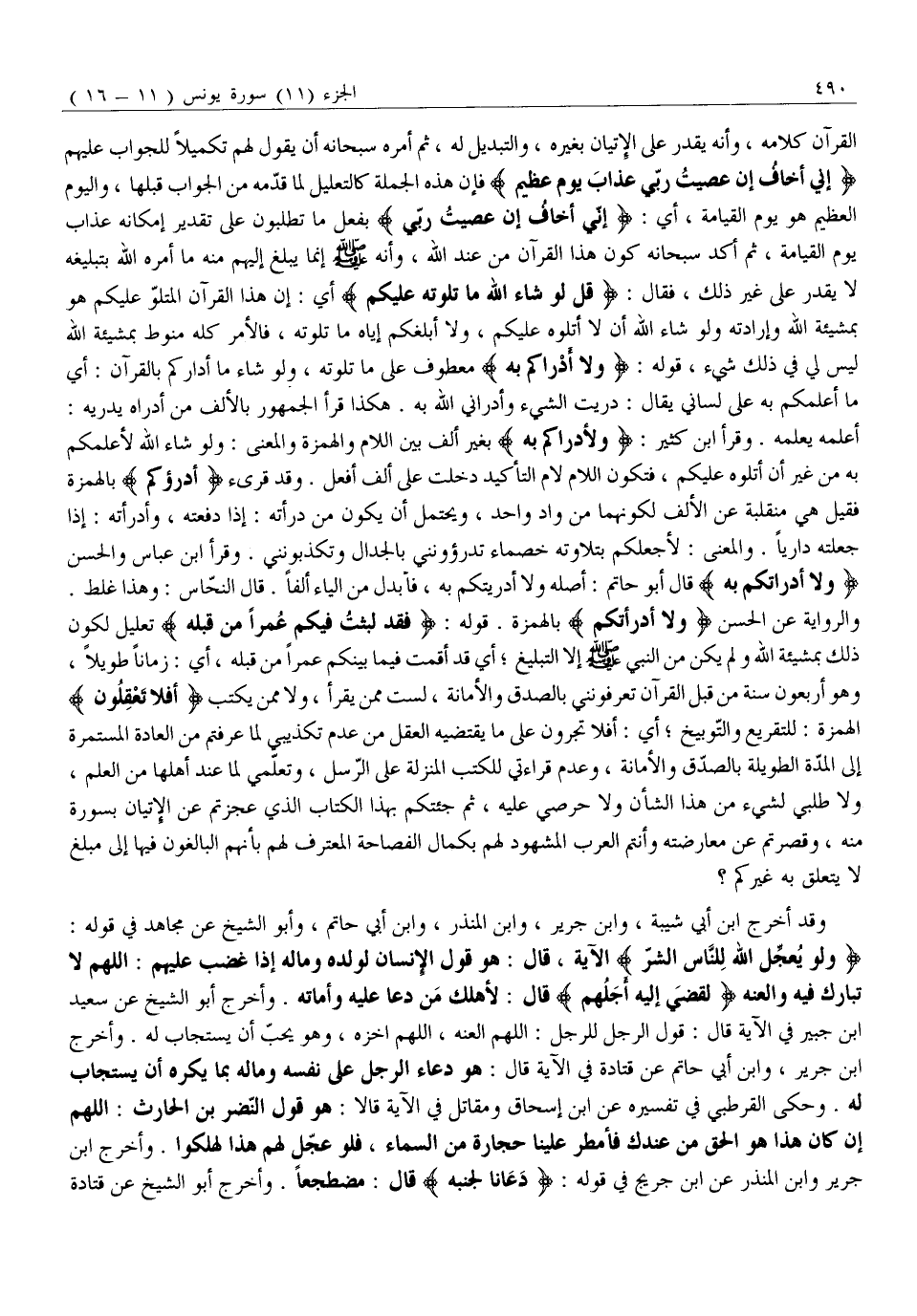 الْقُرْآنَ كَلَامُهُ، وَأَنَّهُ يَقْدِرُ عَلَى الْإِتْيَانِ بِغَيْرِهِ، والتبديل له، ثم أمره سُبْحَانَهُ أَنْ يَقُولَ لَهُمْ تَكْمِيلًا لِلْجَوَابِ عَلَيْهِمْ إِنِّي أَخافُ إِنْ عَصَيْتُ رَبِّي عَذابَ يَوْمٍ عَظِيمٍ فَإِنَّ هَذِهِ الْجُمْلَةَ كَالتَّعْلِيلِ لِمَا قَدَّمَهُ مِنَ الْجَوَابِ قَبْلَهَا، وَالْيَوْمُ الْعَظِيمُ هُوَ يَوْمُ الْقِيَامَةِ، أَيْ: إِنِّي أَخافُ إِنْ عَصَيْتُ رَبِّي بِفِعْلِ مَا تَطْلُبُونَ عَلَى تَقْدِيرِ إِمْكَانِهِ عَذَابَ يَوْمِ الْقِيَامَةِ، ثُمَّ أَكَّدَ سُبْحَانَهُ كَوْنَ هَذَا الْقُرْآنِ مِنْ عِنْدِ اللَّهِ، وَأَنَّهُ صَلَّى اللَّهُ عليه وَسَلَّمَ إِنَّمَا يُبَلِّغُ إِلَيْهِمْ مِنْهُ مَا أَمَرَهُ اللَّهُ بِتَبْلِيغِهِ لَا يَقْدِرُ عَلَى غَيْرِ ذَلِكَ، فَقَالَ: قُلْ لَوْ شاءَ اللَّهُ مَا تَلَوْتُهُ عَلَيْكُمْ أَيْ: أَنَّ هَذَا الْقُرْآنَ الْمَتْلُوَّ عَلَيْكُمْ هُوَ بِمَشِيئَةِ اللَّهِ وَإِرَادَتِهِ وَلَوْ شَاءَ اللَّهُ أَنْ لَا أَتْلُوَهُ عَلَيْكُمْ، وَلَا أُبَلِّغَكُمْ إِيَّاهُ مَا تَلَوْتُهُ، فَالْأَمْرُ كُلُّهُ مَنُوطٌ بِمَشِيئَةِ اللَّهِ لَيْسَ لِي فِي ذَلِكَ شَيْءٌ، قَوْلُهُ: وَلا أَدْراكُمْ بِهِ مَعْطُوفٌ عَلَى مَا تَلَوْتُهُ، وَلَوْ شاء مَا أَدْرَاكُمْ بِالْقُرْآنِ: أَيْ مَا أَعْلَمَكُمْ بِهِ عَلَى لِسَانِي يُقَالُ: دَرَيْتُ الشَّيْءَ وَأَدْرَانِي اللَّهُ بِهِ. هَكَذَا قَرَأَ الْجُمْهُورُ بِالْأَلِفِ مِنْ أَدْرَاهُ يُدْرِيهِ: