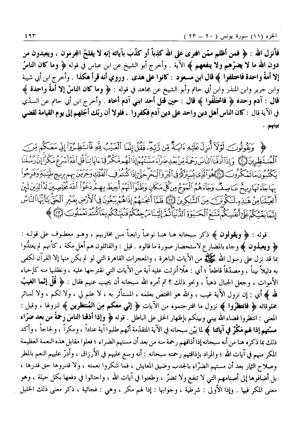 فَأَنْزَلَ اللَّهُ: فَمَنْ أَظْلَمُ مِمَّنِ افْتَرى عَلَى اللَّهِ كَذِباً أَوْ كَذَّبَ بِآياتِهِ إِنَّهُ لَا يُفْلِحُ الْمُجْرِمُونَ، وَيَعْبُدُونَ مِنْ دُونِ اللَّهِ مَا لَا يَضُرُّهُمْ وَلا يَنْفَعُهُمْ الْآيَةُ. وَأَخْرَجَ أَبُو الشَّيْخِ عَنِ ابْنِ عَبَّاسٍ فِي قَوْلِهِ وَما كانَ النَّاسُ إِلَّا أُمَّةً واحِدَةً فَاخْتَلَفُوا قَالَ ابْنُ مَسْعُودٍ: كَانُوا عَلَى هُدًى. وَرُوِيَ أَنَّهُ قَرَأَ هَكَذَا. وَأَخْرَجَ ابْنُ أَبِي شَيْبَةَ وَابْنُ جَرِيرٍ وَابْنُ الْمُنْذِرِ وَابْنُ أَبِي حَاتِمٍ وَأَبُو الشَّيْخِ عَنْ مُجَاهِدٍ فِي قَوْلِهِ: وَما كانَ النَّاسُ إِلَّا أُمَّةً واحِدَةً قَالَ: آدَمَ وَحْدَهُ فَاخْتَلَفُوا قَالَ: حِينَ قَتْلَ أَحَدُ ابْنَيْ آدَمَ أَخَاهُ. وَأَخْرَجَ ابْنُ أَبِي حَاتِمٍ عَنِ السُّدِّيِّ فِي الْآيَةِ قَالَ: كَانَ النَّاسُ أَهْلَ دِينٍ وَاحِدٍ عَلَى دِينِ آدَمَ فَكَفَرُوا، فَلَوْلَا أَنَّ رَبَّكَ أَجَّلَهُمْ إِلَى يَوْمِ الْقِيَامَةِ لَقُضِيَ بَيْنَهُمْ.