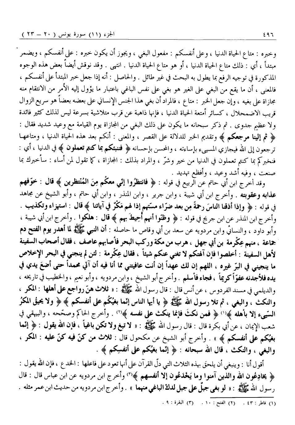 وَخَبَرُهُ: مَتَاعَ الْحَيَاةِ الدُّنْيَا، وَعَلَى أَنْفُسِكُمْ: مَفْعُولُ الْبَغْيِ، وَيَجُوزُ أَنْ يَكُونَ خَبَرُهُ: عَلَى أَنْفُسِكُمْ، وَيُضْمَرُ مُبْتَدَأٌ، أَيْ: ذَلِكَ مَتَاعُ الْحَيَاةِ الدُّنْيَا، أَوْ هُوَ مَتَاعُ الْحَيَاةِ الدُّنْيَا. انْتَهَى. وَقَدْ نُوقِشَ أَيْضًا بَعْضُ هَذِهِ الْوُجُوهِ الْمَذْكُورَةِ فِي تَوْجِيهِ الرَّفْعِ بِمَا يَطُولُ بِهِ الْبَحْثُ فِي غَيْرِ طَائِلٍ. وَالْحَاصِلُ: أَنَّهُ إِذَا جُعِلَ خَبَرُ الْمُبْتَدَأِ عَلَى أَنْفُسِكُمْ، فَالْمَعْنَى، أَنَّ مَا يَقَعُ مِنَ الْبَغْيِ عَلَى الْغَيْرِ هُوَ بَغْيٌ عَلَى نفس الباغي باعتبار ما يؤول إِلَيْهِ الْأَمْرُ مِنَ الِانْتِقَامِ مِنْهُ مُجَازَاةً عَلَى بَغْيِهِ، وَإِنْ جُعِلَ الْخَبَرُ: مَتَاعُ، فَالْمُرَادُ أَنَّ بَغْيَ هَذَا الْجِنْسِ الْإِنْسَانِيِّ عَلَى بَعْضِهِ بَعْضًا هُوَ سَرِيعُ الزَّوَالِ قَرِيبُ الِاضْمِحْلَالِ، كَسَائِرِ أَمْتِعَةِ الْحَيَاةِ الدُّنْيَا، فَإِنَّهَا ذَاهِبَةٌ عَنْ قُرْبٍ مُتَلَاشِيَةٌ بِسُرْعَةٍ لَيْسَ لِذَلِكَ كَثِيرُ فَائِدَةٍ وَلَا عَظِيمُ جَدْوَى. ثُمَّ ذَكَرَ سُبْحَانَهُ مَا يَكُونُ عَلَى ذَلِكَ الْبَغْيِ مِنَ الْمُجَازَاةِ يَوْمَ الْقِيَامَةِ مَعَ وَعِيدٍ شَدِيدٍ فَقَالَ: