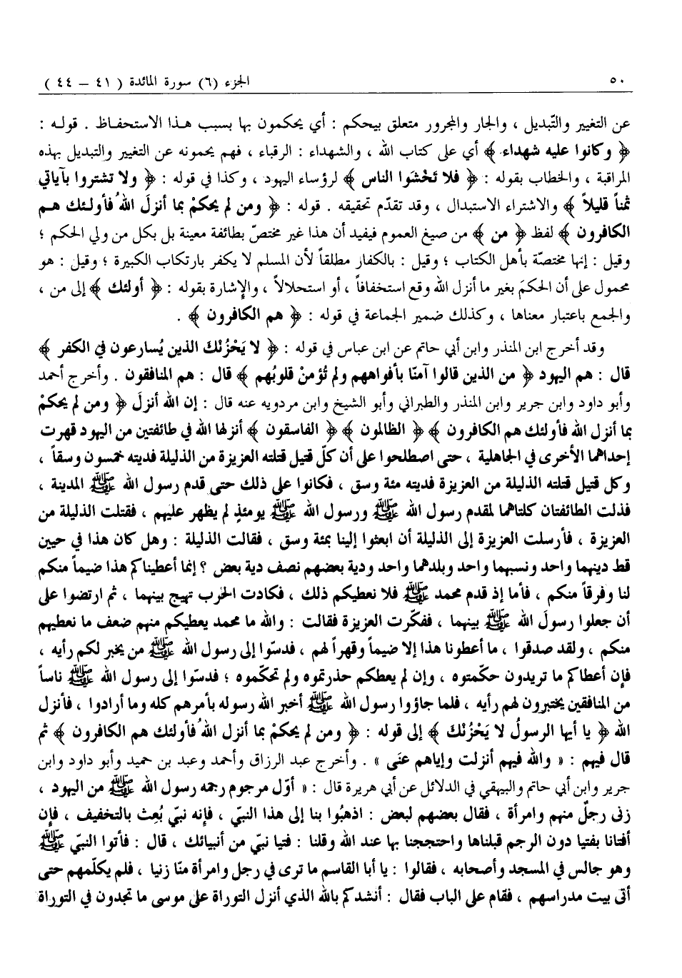 وَقَدْ أَخْرَجَ ابْنُ الْمُنْذِرِ وَابْنُ أَبِي حَاتِمٍ عَنِ ابْنِ عَبَّاسٍ فِي قَوْلِهِ: لَا يَحْزُنْكَ الَّذِينَ يُسارِعُونَ فِي الْكُفْرِ قَالَ: هُمُ الْيَهُودُ مِنَ الَّذِينَ قالُوا آمَنَّا بِأَفْواهِهِمْ وَلَمْ تُؤْمِنْ قُلُوبُهُمْ قَالَ: هُمُ الْمُنَافِقُونَ. وَأَخْرَجَ أَحْمَدُ وَأَبُو دَاوُدَ وَابْنُ جَرِيرٍ وَابْنُ الْمُنْذِرِ وَالطَّبَرَانِيُّ وَأَبُو الشَّيْخِ وَابْنُ مَرْدَوَيْهِ عَنْهُ قَالَ: إِنَّ اللَّهَ أَنْزَلَ وَمَنْ لَمْ يَحْكُمْ بِما أَنْزَلَ اللَّهُ فَأُولئِكَ هُمُ الْكافِرُونَ الظَّالِمُونَ الْفاسِقُونَ أَنْزَلَهَا اللَّهُ فِي طَائِفَتَيْنِ مِنَ الْيَهُودِ قَهَرَتْ إِحْدَاهُمَا الْأُخْرَى فِي الْجَاهِلِيَّةِ، حَتَّى اصْطَلَحُوا عَلَى أَنَّ كُلَّ قَتِيلٍ قَتَلَتْهُ الْعَزِيزَةُ مِنَ الذَّلِيلَةِ فَدِيَتُهُ خَمْسُونَ وَسْقًا، وَكُلُّ قَتِيلٍ قَتَلَتْهُ الذَّلِيلَةُ مِنَ الْعَزِيزَةِ فَدِيَتُهُ مِائَةُ وَسْقٍ، فَكَانُوا عَلَى ذَلِكَ حَتَّى قَدِمَ رَسُولُ اللَّهِ صَلَّى اللَّهُ عَلَيْهِ وَسَلَّمَ الْمَدِينَةَ، فَذَلَّتِ الطَّائِفَتَانِ كِلْتَاهُمَا لِمَقْدَمِ رَسُولِ الله صلّى الله عليه وسلّم وَرَسُولُ اللَّهِ صَلَّى اللَّهُ عَلَيْهِ وَسَلَّمَ يَوْمَئِذٍ لَمْ يَظْهَرْ عَلَيْهِمْ، فَقَتَلَتِ الذَّلِيلَةُ مِنَ الْعَزِيزَةِ، فَأَرْسَلَتِ الْعَزِيزَةُ إِلَى الذَّلِيلَةِ أَنِ ابْعَثُوا إِلَيْنَا بِمِائَةِ وَسْقٍ، فَقَالَتِ الذَّلِيلَةُ: وَهَلْ كَانَ هَذَا فِي حَيَّيْنِ قَطُّ دِينَهُمَا وَاحِدٌ وَنَسَبُهُمَا وَاحِدٌ وَبَلَدُهُمَا وَاحِدٌ وَدِيَةُ بَعْضِهِمْ نِصْفُ دِيَةِ بَعْضٍ؟ إِنَّمَا أَعْطَيْنَاكُمْ هَذَا ضَيْمًا مِنْكُمْ لَنَا وَفَرَقًا مِنْكُمْ، فَأَمَّا إِذْ قَدِمَ مُحَمَّدٌ صَلَّى الله عليه وسلّم فلا نعطيكم ذلك، فكادت الْحَرْبُ تَهِيجُ بَيْنَهُمَا، ثُمَّ ارْتَضَوْا عَلَى أَنْ جعلوا رسول الله صلّى الله عليه وَسَلَّمَ بَيْنَهُمَا، فَفَكَّرَتِ الْعَزِيزَةُ فَقَالَتْ: وَاللَّهِ مَا مُحَمَّدٌ يُعْطِيكُمْ مِنْهُمْ ضِعْفَ مَا نُعْطِيهِمْ مِنْكُمْ، وَلَقَدْ صَدَقُوا، مَا أَعْطَوْنَا هَذَا إِلَّا ضَيْمًا وَقَهْرًا لَهُمْ، فَدُسُّوا إِلَى رَسُولِ اللَّهِ صَلَّى اللَّهُ عَلَيْهِ وَسَلَّمَ مَنْ يُخْبِرُ لَكُمْ رَأْيَهُ، فَإِنْ أَعْطَاكُمْ مَا تُرِيدُونَ حَكَّمْتُوهُ، وَإِنْ لَمْ يُعْطِكُمْ حَذِرْتُمُوهُ وَلَمْ تُحَكِّمُوهُ فَدَسُّوا إِلَى رَسُولِ اللَّهِ صَلَّى اللَّهُ عَلَيْهِ وَسَلَّمَ نَاسًا مِنَ الْمُنَافِقِينَ يَخْتَبِرُونَ لَهُمْ رَأْيَهُ، فَلَمَّا جَاءُوا رَسُولَ اللَّهِ صَلَّى اللَّهُ عَلَيْهِ وَسَلَّمَ أَخْبَرَ اللَّهُ رَسُولَهُ بِأَمْرِهِمْ كُلَّهُ وَمَا أرادوا، فأنزل الله يا أَيُّهَا الرَّسُولُ لَا يَحْزُنْكَ إِلَى قَوْلِهِ: وَمَنْ لَمْ يَحْكُمْ بِما أَنْزَلَ اللَّهُ فَأُولئِكَ هُمُ الْكافِرُونَ ثم قال فيهم: «والله فيهم أُنْزِلَتْ وَإِيَّاهُمْ عَنَى» . وَأَخْرَجَ عَبْدُ الرَّزَّاقِ وَأَحْمَدُ وَعَبْدُ بْنُ حُمَيْدٍ وَأَبُو دَاوُدَ وَابْنُ جَرِيرٍ وَابْنُ أَبِي حَاتِمٍ وَالْبَيْهَقِيُّ فِي الدَّلَائِلِ عَنْ أَبِي هُرَيْرَةَ قَالَ: «أَوَّلُ مَرْجُومٍ رَجَمَهُ رَسُولُ اللَّهِ صَلَّى اللَّهُ عَلَيْهِ وَسَلَّمَ مِنَ الْيَهُودِ، زَنَى رَجُلٌ مِنْهُمْ وَامْرَأَةٌ، فَقَالَ بَعْضُهُمْ لِبَعْضٍ: اذْهَبُوا بِنَا إِلَى هَذَا النَّبِيِّ، فَإِنَّهُ نَبِيٌّ بُعِثَ بِالتَّخْفِيفِ، فَإِنْ أَفْتَانَا بِفُتْيَا دُونَ الرَّجْمِ قَبِلْنَاهَا وَاحْتَجَجْنَا بِهَا عِنْدَ اللَّهِ وَقُلْنَا: فُتْيَا نَبِيٍّ مِنْ أَنْبِيَائِكَ، قَالَ: فأتوا النبيّ صلّى الله عليه وَسَلَّمَ وَهُوَ جَالِسٌ فِي الْمَسْجِدِ وَأَصْحَابُهُ، فَقَالُوا: يَا أَبَا الْق