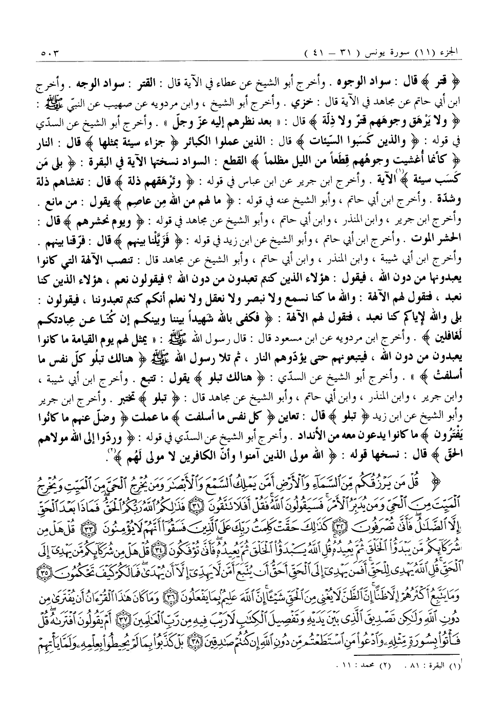 وَلا يَرْهَقُ وُجُوهَهُمْ قَتَرٌ وَلا ذِلَّةٌ قَالَ: «بَعْدَ نَظَرِهِمْ إِلَيْهِ عَزَّ وَجَلَّ» . وَأَخْرَجَ أَبُو الشَّيْخِ عَنِ السُّدِّيِّ فِي قَوْلِهِ: وَالَّذِينَ كَسَبُوا السَّيِّئاتِ قَالَ: الَّذِينَ عَمِلُوا الْكَبَائِرَ جَزاءُ سَيِّئَةٍ بِمِثْلِها