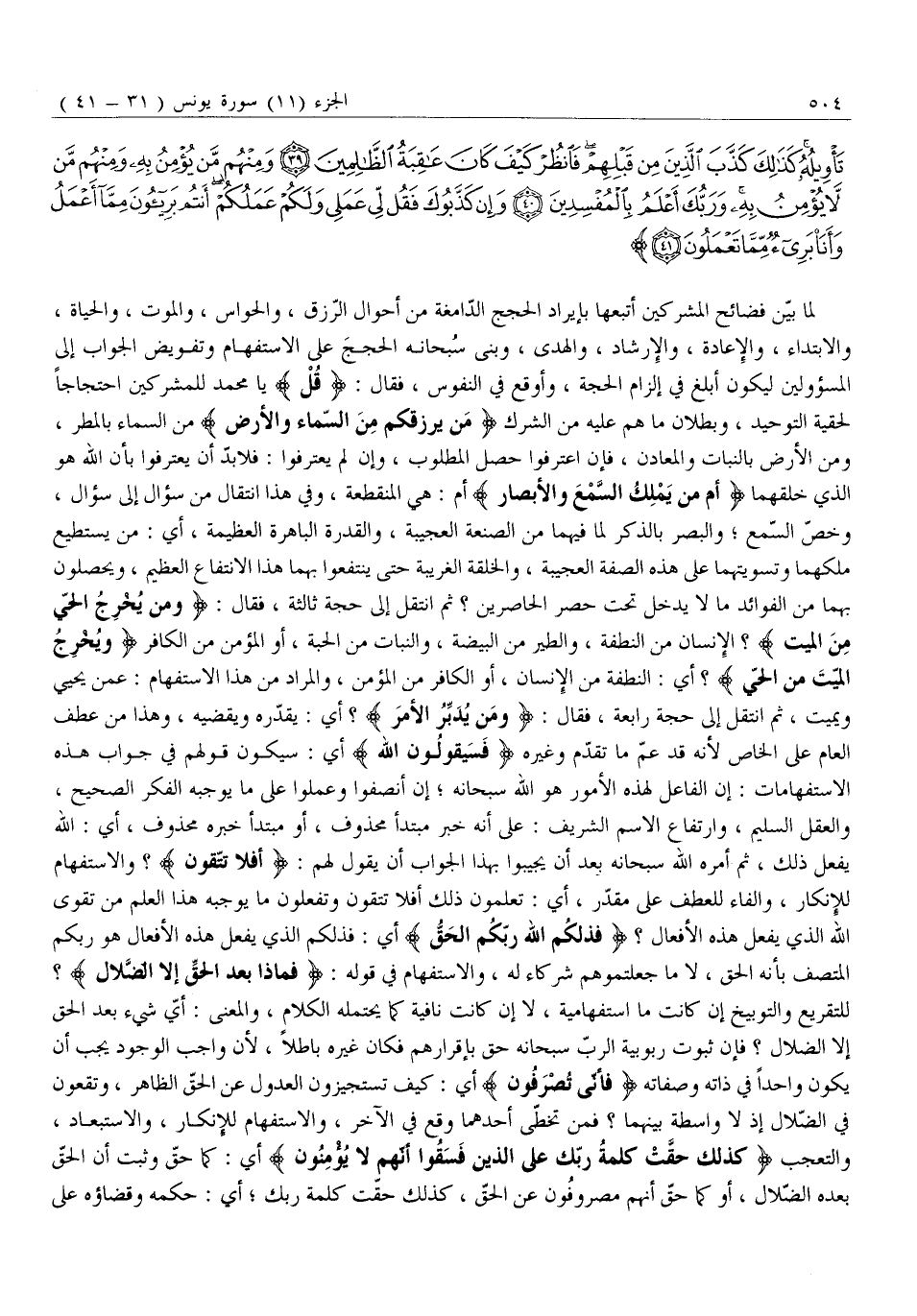 لَمَّا بَيَّنَ فَضَائِحَ الْمُشْرِكِينَ أَتْبَعَهَا بِإِيرَادِ الْحُجَجِ الدَّامِغَةِ مِنْ أَحْوَالِ الرِّزْقِ، وَالْحَوَاسِّ، وَالْمَوْتِ، وَالْحَيَاةِ، وَالِابْتِدَاءِ، وَالْإِعَادَةِ، وَالْإِرْشَادِ، وَالْهُدَى، وَبَنَى سُبْحَانَهُ الْحُجَجَ على الاستفهام وتفويض الجواب إلى المسؤولين لِيَكُونَ أَبْلَغَ فِي إِلْزَامِ الْحُجَّةِ، وَأَوْقَعَ فِي النُّفُوسِ، فَقَالَ: قُلْ يَا مُحَمَّدُ لِلْمُشْرِكِينَ احْتِجَاجًا لِحَقِّيَّةِ التَّوْحِيدِ، وَبُطْلَانِ مَا هُمْ عَلَيْهِ مِنَ الشِّرْكِ مَنْ يَرْزُقُكُمْ مِنَ السَّماءِ وَالْأَرْضِ مِنَ السَّمَاءِ بِالْمَطَرِ، وَمِنَ الْأَرْضِ بِالنَّبَاتِ وَالْمَعَادِنِ، فَإِنِ اعْتَرَفُوا حَصَلَ الْمَطْلُوبُ، وَإِنْ لَمْ يَعْتَرِفُوا: فَلَا بُدَّ أَنْ يَعْتَرِفُوا بِأَنَّ اللَّهَ هُوَ الَّذِي خَلَقَهُمَا أَمَّنْ يَمْلِكُ السَّمْعَ وَالْأَبْصارَ أَمْ: هِيَ الْمُنْقَطِعَةُ، وَفِي هَذَا انْتِقَالٌ مِنْ سُؤَالٍ إِلَى سُؤَالٍ، وَخُصِّ السَّمْعُ وَالْبَصَرُ بِالذِّكْرِ لِمَا فِيهِمَا مِنَ الصَّنْعَةِ الْعَجِيبَةِ، وَالْقُدْرَةِ الْبَاهِرَةِ الْعَظِيمَةِ، أَيْ: مَنْ يَسْتَطِيعُ مَلْكَهُمَا وَتَسْوِيَتَهُمَا عَلَى هَذِهِ الصِّفَةِ الْعَجِيبَةِ، وَالْخِلْقَةِ الْغَرِيبَةِ حَتَّى يَنْتَفِعُوا بِهِمَا هَذَا الِانْتِفَاعَ الْعَظِيمَ، وَيْحَصِّلُونَ بِهِمَا مِنَ الْفَوَائِدِ مَا لَا يَدْخُلُ تَحْتَ حَصْرِ الْحَاصِرِينَ؟ ثُمَّ انْتَقَلَ إِلَى حُجَّةٍ ثَالِثَةٍ، فَقَالَ: وَمَنْ يُخْرِجُ الْحَيَّ مِنَ الْمَيِّتِ؟ الْإِنْسَانَ مِنَ النُّطْفَةِ، وَالطَّيْرَ مِنَ الْبَيْضَةِ، وَالنَّبَاتَ مِنَ الْحَبَّةِ، أَوِ الْمُؤْمِنَ مِنَ الْكَافِرِ وَيُخْرِجُ الْمَيِّتَ مِنَ الْحَيِّ؟ أَيِ: النُّطْفَةَ مِنَ الْإِنْسَانِ، أَوِ الْكَافِرَ مِنَ الْمُؤْمِنِ، وَالْمُرَادُ مِنْ هَذَا الِاسْتِفْهَامِ: عَمَّنْ يُحْيِي وَيُمِيتُ، ثُمَّ انْتَقَلَ إِلَى حُجَّةٍ رَابِعَةٍ، فَقَالَ: وَمَنْ يُدَبِّرُ الْأَمْرَ؟ أَيْ: يُقَدِّرُهُ وَيَقْضِيهِ، وَهَذَا مِنْ عَطْفِ الْعَامِّ عَلَى الْخَاصِّ لِأَنَّهُ قَدْ عَمَّ مَا تَقَدَّمَ وَغَيْرَهُ فَسَيَقُولُونَ اللَّهُ أَيْ: سَيَكُونُ قَوْلُهُمْ فِي جَوَابِ هَذِهِ الِاسْتِفْهَامَاتِ: أَنَّ الْفَاعِلَ لِهَذِهِ الْأُمُورِ هُوَ اللَّهُ سُبْحَانَهُ إِنْ أَنْصَفُوا وَعَمِلُوا عَلَى مَا يُوجِبُهُ الْفِكْرُ الصَّحِيحُ، وَالْعَقْلُ السَّلِيمُ، وَارْتِفَاعُ الِاسْمِ الشَّرِيفِ: عَلَى أَنَّهُ خَبَرُ مُبْتَدَأٍ مَحْذُوفٍ، أَوْ مُبْتَدَأٌ خَبَرُهُ مَحْذُوفٌ، أَيِ: اللَّهُ يَفْعَلُ ذَلِكَ، ثُمَّ أَمَرَهُ اللَّهُ سُبْحَانَهُ بَعْدَ أَنْ يُجِيبُوا بِهَذَا الْجَوَابِ أَنْ يَقُولَ لَهُمْ: أَفَلا تَتَّقُونَ؟ وَالِاسْتِفْهَامُ لِلْإِنْكَارِ، وَالْفَاءُ لِلْعَطْفِ عَلَى مُقَدَّرٍ، أَيْ: تَعْلَمُونَ ذَلِكَ أَفَلَا تَتَّقُونَ وَتَفْعَلُونَ مَا يُوجِبُهُ هَذَا الْعِلْمُ مِنْ تَقْوَى اللَّهِ الَّذِي يَفْعَلُ هَذِهِ الْأَفْعَالَ؟ فَذلِكُمُ اللَّهُ رَبُّكُمُ الْحَقُّ أَيْ: فَذَلِكُمُ الَّذِي يَفْعَلُ هَذِهِ الْأَفْعَالَ هُوَ رَبُّكُمُ الْمُتَّصِفُ بِأَنَّهُ الْحَقُّ، لَا مَا جَعَلْتُمُوهُمْ شُرَكَاءَ لَهُ، وَالِاسْتِفْهَامُ فِي قَوْلِهِ: فَماذا بَعْدَ الْحَقِّ إِلَّا الضَّلالُ؟