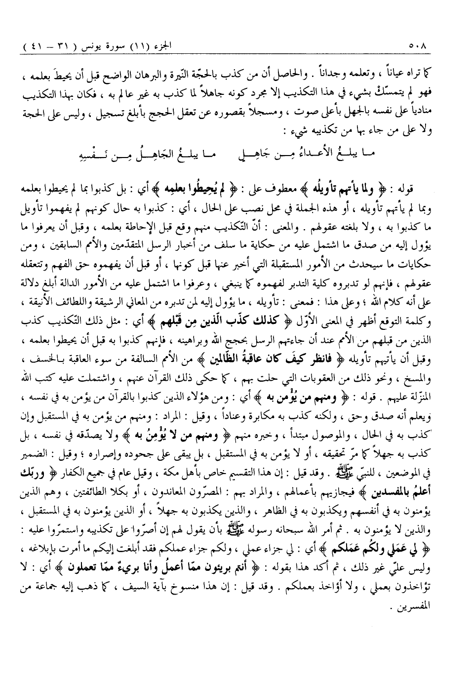قَوْلُهُ: وَلَمَّا يَأْتِهِمْ تَأْوِيلُهُ مَعْطُوفٌ عَلَى: لَمْ يُحِيطُوا بِعِلْمِهِ أَيْ: بَلْ كَذَّبُوا بِمَا لَمْ يُحِيطُوا بِعِلْمِهِ وَبِمَا لَمْ يَأْتِهِمْ تَأْوِيلُهُ، أَوْ هَذِهِ الْجُمْلَةُ فِي مَحَلِّ نَصْبٍ عَلَى الْحَالِ، أَيْ: كَذَّبُوا بِهِ حَالَ كَوْنِهِمْ لَمْ يَفْهَمُوا تَأْوِيلَ مَا كَذَّبُوا بِهِ، وَلَا بَلَغَتْهُ عُقُولُهُمْ. وَالْمَعْنَى: أَنَّ التَّكْذِيبَ مِنْهُمْ وَقَعَ قَبْلَ الإحاطة بعلمه، وقبل أن يعرفوا ما يؤول إِلَيْهِ مِنْ صِدْقِ مَا اشْتَمَلَ عَلَيْهِ مِنْ حِكَايَةِ مَا سَلَفَ مِنْ أَخْبَارِ الرُّسُلِ الْمُتَقَدِّمِينَ وَالْأُمَمِ السَّابِقِينَ، وَمِنْ حِكَايَاتِ مَا سَيَحْدُثُ مِنَ الْأُمُورِ الْمُسْتَقْبَلَةِ الَّتِي أَخْبَرَ عَنْهَا قَبْلَ كَوْنِهَا، أَوْ قَبْلَ أَنْ يَفْهَمُوهُ حَقَّ الْفَهْمِ وَتَتَعَقَّلَهُ عُقُولُهُمْ، فَإِنَّهُمْ لَوْ تَدَبَّرُوهُ كُلِّيَّةَ التَّدَبُّرِ لَفَهِمُوهُ كَمَا يَنْبَغِي، وَعَرَفُوا مَا اشْتَمَلَ عَلَيْهِ مِنَ الْأُمُورِ الدَّالَّةِ أَبْلَغَ دَلَالَةً عَلَى أَنَّهُ كَلَامُ الله وعلى هذا: فمعنى: تأويله، ما يؤول إِلَيْهِ لِمَنْ تَدَبَّرَهُ مِنَ الْمَعَانِي الرَّشِيقَةِ وَاللَّطَائِفِ الْأَنِيقَةِ، وَكَلِمَةُ التَّوَقُّعِ أَظْهَرُ فِي الْمَعْنَى الْأَوَّلِ كَذلِكَ كَذَّبَ الَّذِينَ مِنْ قَبْلِهِمْ أَيْ: مِثْلَ ذَلِكَ التَّكْذِيبِ كَذَّبَ الَّذِينَ مِنْ قَبْلِهِمْ مِنَ الْأُمَمِ عِنْدَ أَنْ جَاءَتْهُمُ الرُّسُلُ بِحُجَجِ اللَّهِ وَبَرَاهِينِهِ، فَإِنَّهُمْ كَذَّبُوا بِهِ قَبْلَ أَنْ يُحِيطُوا بِعِلْمِهِ، وَقَبْلَ أَنْ يَأْتِيَهُمْ تَأْوِيلُهُ فَانْظُرْ كَيْفَ كانَ عاقِبَةُ الظَّالِمِينَ مِنَ الْأُمَمِ السَّالِفَةِ مِنْ سُوءِ الْعَاقِبَةِ بِالْخَسْفِ، وَالْمَسْخِ، وَنَحْوِ ذَلِكَ مِنَ الْعُقُوبَاتِ الَّتِي حَلَّتْ بِهِمْ، كَمَا حَكَى ذَلِكَ الْقُرْآنُ عَنْهُمْ، وَاشْتَمَلَتْ عَلَيْهِ كُتُبُ اللَّهِ الْمُنَزَّلَةُ عَلَيْهِمْ. قَوْلُهُ: وَمِنْهُمْ مَنْ يُؤْمِنُ بِهِ أَيْ: وَمِنْ هَؤُلَاءِ الَّذِينَ كَذَّبُوا بِالْقُرْآنِ مَنْ يُؤْمِنُ بِهِ فِي نَفْسِهِ، وَيَعْلَمُ أَنَّهُ صِدْقٌ وَحَقٌّ، وَلَكِنَّهُ كَذَّبَ بِهِ مُكَابَرَةً وَعِنَادًا، وَقِيلَ: الْمُرَادُ: وَمِنْهُمْ مَنْ يُؤْمِنُ بِهِ فِي الْمُسْتَقْبَلِ وَإِنْ كَذَّبَ بِهِ فِي الْحَالِ، وَالْمَوْصُولُ مُبْتَدَأٌ، وَخَبَرُهُ مِنْهُمْ وَمِنْهُمْ مَنْ لَا يُؤْمِنُ بِهِ وَلَا يُصَدِّقُهُ فِي نَفْسِهِ، بَلْ كَذَّبَ بِهِ جَهْلًا كَمَا مَرَّ تَحْقِيقُهُ، أَوْ لَا يُؤْمِنُ بِهِ فِي الْمُسْتَقْبَلِ، بَلْ يَبْقَى عَلَى جُحُودِهِ وَإِصْرَارِهِ وَقِيلَ: الضَّمِيرُ فِي الْمَوْضِعَيْنِ، لِلنَّبِيِّ صَلَّى اللَّهُ عليه وَسَلَّمَ. وَقَدْ قِيلَ: إِنَّ هَذَا التَّقْسِيمَ خَاصٌّ بِأَهْلِ مَكَّةَ، وَقِيلَ عَامٌّ فِي جَمِيعِ الْكُفَّارِ وَرَبُّكَ أَعْلَمُ بِالْمُفْسِدِينَ فَيُجَازِيهِمْ بِأَعْمَالِهِمْ، وَالْمُرَادُ بِهِمْ: الْمُصِرُّونَ الْمُعَانِدُونَ، أَوْ بِكِلَا الطَّائِفَتَيْنِ، وَهُمُ الَّذِينَ يُؤْمِنُونَ بِهِ فِي أَنْفُسِهِمْ وَيُكَذِّبُونَ بِهِ فِي الظَّاهِرِ، وَالَّذِينَ يُكَذِّبُونَ بِهِ جَهْلًا، أَوِ الَّذِينَ يُؤْمِنُونَ بِهِ فِي الْمُسْتَقْبَلِ، وَالَّذِينَ لَا يُؤْمِنُونَ بِهِ. ثُمَّ أَمَرَ اللَّهُ سُبْحَانَهُ رَسُولَهُ صَلَّى اللَّهُ عَلَيْهِ وَسَلَّمَ بِأَنْ يَقُولَ لَهُمْ إِنْ أَصَرُّوا عَلَى تَكْذِيبِهِ وَاسْتَمَرُّوا عَلَيْهِ: