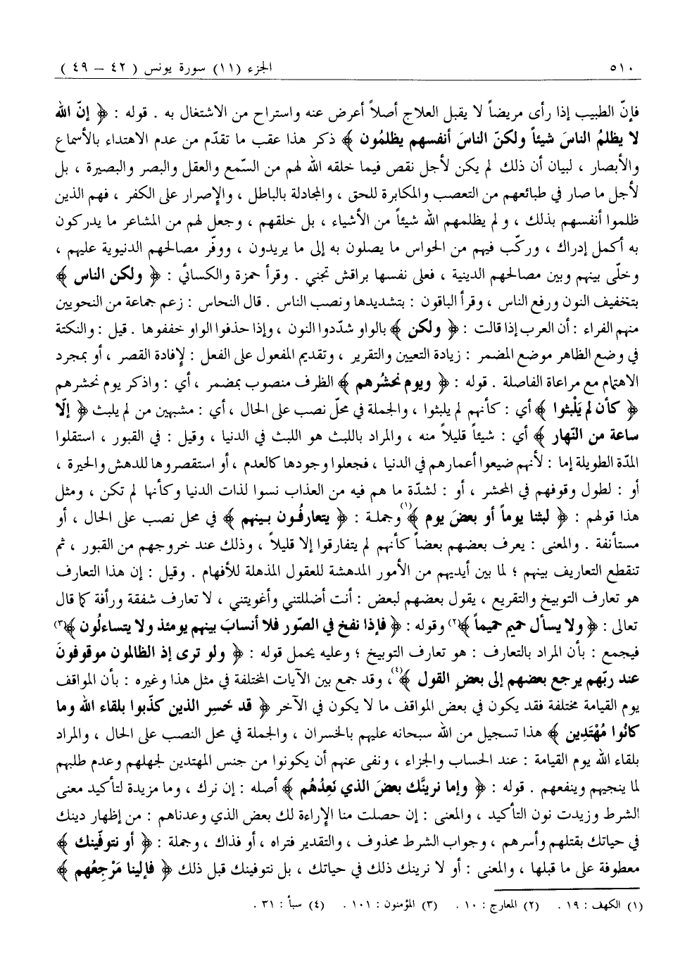فَإِنَّ الطَّبِيبَ إِذَا رَأَى مَرِيضًا لَا يَقْبَلُ الْعِلَاجَ أَصْلًا أَعْرَضَ عَنْهُ وَاسْتَرَاحَ مِنَ الِاشْتِغَالِ بِهِ. قَوْلُهُ: إِنَّ اللَّهَ لَا يَظْلِمُ النَّاسَ شَيْئاً وَلكِنَّ النَّاسَ أَنْفُسَهُمْ يَظْلِمُونَ ذِكْرُ هَذَا عَقِبَ مَا تَقَدَّمَ مِنْ عَدَمِ الِاهْتِدَاءِ بِالْأَسْمَاعِ وَالْأَبْصَارِ، لِبَيَانِ أَنَّ ذَلِكَ لَمْ يَكُنْ لِأَجْلِ نَقْصٍ فِيمَا خَلَقَهُ اللَّهُ لَهُمْ مِنَ السَّمْعِ وَالْعَقْلِ وَالْبَصَرِ وَالْبَصِيرَةِ، بَلْ لِأَجْلِ مَا صَارَ فِي طَبَائِعِهِمْ مِنَ التَّعَصُّبِ وَالْمُكَابَرَةِ لِلْحَقِّ، وَالْمُجَادَلَةِ بِالْبَاطِلِ، وَالْإِصْرَارِ عَلَى الْكُفْرِ، فَهُمُ الَّذِينَ ظَلَمُوا أَنْفُسَهُمْ بِذَلِكَ، وَلَمْ يَظْلِمْهُمُ اللَّهُ شَيْئًا مِنَ الْأَشْيَاءِ، بَلْ خَلَقَهُمْ، وَجَعَلَ لَهُمْ مِنَ الْمَشَاعِرِ مَا يُدْرِكُونَ بِهِ أَكْمَلَ إِدْرَاكٍ، وَرَكَّبَ فِيهِمْ مِنَ الْحَوَاسِّ مَا يَصِلُونَ بِهِ إِلَى مَا يُرِيدُونَ، وَوَفَّرَ مَصَالِحَهُمُ الدُّنْيَوِيَّةَ عَلَيْهِمْ، وَخَلَّى بَيْنَهُمْ وَبَيْنَ مَصَالِحِهِمُ الدِّينِيَّةِ، فَعَلَى نَفْسِهَا بِرَاقِشُ تَجْنِي. وَقَرَأَ حَمْزَةُ وَالْكِسَائِيُّ: وَلكِنَّ النَّاسَ بِتَخْفِيفِ النُّونِ وَرَفْعِ النَّاسِ، وَقَرَأَ الْبَاقُونَ: بِتَشْدِيدِهَا وَنَصْبِ النَّاسِ. قَالَ النَّحَّاسُ: زَعَمَ جَمَاعَةٌ مِنَ النَّحْوِيِّينَ مِنْهُمُ الْفَرَّاءُ: أَنَّ الْعَرَبَ إِذَا قَالَتْ: وَلكِنَّ بِالْوَاوِ شَدَّدُوا النُّونَ، وَإِذَا حَذَفُوا الْوَاوَ خَفَّفُوهَا. قِيلَ: وَالنُّكْتَةُ فِي وَضْعِ الظَّاهِرِ مَوْضِعَ الْمُضْمَرِ: زِيَادَةُ التَّعْيِينِ وَالتَّقْرِيرِ، وَتَقْدِيمُ الْمَفْعُولِ عَلَى الْفِعْلِ: لِإِفَادَةِ القصر، أو بمجرد الاهتمام مع مراعاة الفاصلة. قوله: وَيَوْمَ يَحْشُرُهُمْ الظَّرْفُ مَنْصُوبٌ بِمُضْمَرٍ، أَيْ: وَاذْكُرْ يَوْمَ نَحْشُرُهُمْ كَأَنْ لَمْ يَلْبَثُوا أَيْ: كَأَنَّهُمْ لَمْ يَلْبَثُوا، وَالْجُمْلَةُ فِي مَحَلِّ نَصْبٍ عَلَى الْحَالِ، أَيْ: مُشْبِهِينَ مَنْ لَمْ يَلْبَثْ إِلَّا ساعَةً مِنَ النَّهارِ أَيْ: شَيْئًا قَلِيلًا مِنْهُ، وَالْمُرَادُ بِاللُّبْثِ هُوَ اللُّبْثُ فِي الدُّنْيَا، وَقِيلَ: فِي الْقُبُورِ، اسْتَقَلُّوا الْمُدَّةَ الطَّوِيلَةَ إِمَّا: لِأَنَّهُمْ ضَيَّعُوا أَعْمَارَهُمْ فِي الدُّنْيَا، فَجَعَلُوا وَجُودَهَا كَالْعَدَمِ، أَوِ اسْتَقْصَرُوهَا لِلدَّهَشِ وَالْحَيْرَةِ، أَوْ: لِطُولِ وُقُوفِهِمْ فِي الْمَحْشَرِ، أَوْ: لِشِدَّةَ مَا هُمْ فِيهِ مِنَ الْعَذَابِ نَسُوا لَذَّاتِ الدُّنْيَا وَكَأَنَّهَا لَمْ تَكُنْ، وَمِثْلُ هَذَا قَوْلُهُمْ: لَبِثْنا يَوْماً أَوْ بَعْضَ يَوْمٍ «1» وَجُمْلَةُ: يَتَعارَفُونَ بَيْنَهُمْ فِي مَحَلِّ نَصْبٍ عَلَى الْحَالِ، أَوْ مُسْتَأْنَفَةٌ. وَالْمَعْنَى: يَعْرِفُ بَعْضُهُمْ بَعْضًا كَأَنَّهُمْ لَمْ يَتَفَارَقُوا إِلَّا قَلِيلًا، وَذَلِكَ عِنْدَ خُرُوجِهِمْ مِنَ الْقُبُورِ، ثُمَّ تَنْقَطِعُ التَّعَارِيفُ بَيْنَهُمْ لِمَا بَيْنَ أَيْدِيهِمْ مِنَ الْأُمُورِ الْمُدْهِشَةِ لِلْعُقُولِ الْمُذْهِلَةِ لِلْأَفْهَامِ. وَقِيلَ: إِنَّ هَذَا التَّعَارُفَ هُوَ تَعَارُفُ التَّوْبِيخِ وَالتَّقْرِيعِ، يَقُولُ بَعْضُهُمْ لِبَعْضٍ: أَنْتَ أَضْلَلْتَنِي وَأَغْوَيْتَنِي، لَا تَعَارُفَ شَفَقَةٍ وَرَأْفَةٍ كَمَا قال تعالى: وَلا يَسْئَلُ حَمِيمٌ حَمِيماً «2» وَقَوْلِهِ: فَإِذا نُفِخَ فِي الصُّورِ فَلا أَنْسابَ بَيْنَهُمْ يَوْمَئِذٍ وَلا يَتَساءَلُونَ «3» فَيُجْمَعُ: بِأَنَّ الْمُرَادَ بِالتَّعَارُفِ: هُوَ تَعَارُفُ التَّوْبِيخِ وَعَلَيْهِ يُحْمَلُ قَوْلُهُ: وَلَوْ تَرى إِذِ الظَّالِمُونَ مَوْقُوفُونَ عِنْدَ رَبِّهِمْ 