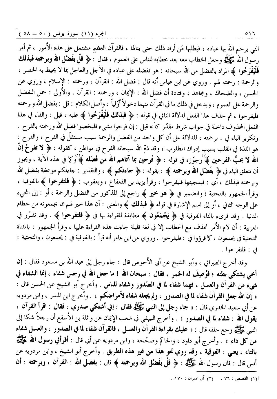 الَّتِي يَرْحَمُ اللَّهُ بِهَا عِبَادَهُ، فَيَطْلُبُهَا مَنْ أَرَادَ ذَلِكَ حَتَّى يَنَالَهَا، فَالْقُرْآنُ الْعَظِيمُ مُشْتَمِلٌ عَلَى هَذِهِ الْأُمُورِ، ثُمَّ أَمَرَ رَسُولَ اللَّهِ صَلَّى اللَّهُ عَلَيْهِ وَسَلَّمَ وَجَعَلَ الْخِطَابَ مَعَهُ بَعْدَ خِطَابِهِ لِلنَّاسِ عَلَى الْعُمُومِ، فَقَالَ: قُلْ بِفَضْلِ اللَّهِ وَبِرَحْمَتِهِ فَبِذلِكَ فَلْيَفْرَحُوا الْمُرَادُ بِالْفَضْلِ مِنَ اللَّهِ سُبْحَانَهُ: هُوَ تَفَضُّلُهُ عَلَى عِبَادِهِ فِي الْآجِلِ وَالْعَاجِلِ بِمَا لَا يُحِيطُ بِهِ الْحَصْرُ، وَالرَّحْمَةُ: رَحْمَتُهُ لَهُمْ. وَرُوِيَ عَنِ ابْنِ عَبَّاسٍ أَنَّهُ قَالَ: فَضْلُ اللَّهِ: الْقُرْآنُ، وَرَحْمَتُهُ: الْإِسْلَامُ، وَرُوِيَ عَنِ الْحَسَنِ، وَالضَّحَّاكِ، وَمُجَاهِدٍ، وَقَتَادَةَ أَنَّ فَضْلَ اللَّهِ: الْإِيمَانُ، وَرَحْمَتَهُ: الْقُرْآنُ. وَالْأَوْلَى: حَمْلُ الْفَضْلِ وَالرَّحْمَةِ عَلَى الْعُمُومِ، وَيَدْخُلُ فِي ذَلِكَ مَا فِي الْقُرْآنِ مِنْهُمَا دُخُولًا أَوَّلِيًّا، وَأَصْلُ الْكَلَامِ: قُلْ: بِفَضْلِ اللَّهِ وَبِرَحْمَتِهِ فَلْيَفْرَحُوا، ثُمَّ حُذِفَ هَذَا الْفِعْلُ لِدَلَالَةِ الثَّانِي فِي قَوْلِهِ: فَبِذلِكَ فَلْيَفْرَحُوا عَلَيْهِ، قِيلَ: وَالْفَاءُ فِي هَذَا الْفِعْلِ الْمَحْذُوفِ دَاخِلَةٌ فِي جَوَابِ شَرْطٍ مُقَدَّرٍ كَأَنَّهُ قِيلَ: إِنْ فَرِحُوا بِشَيْءٍ فَلْيَخُصُّوا فَضْلَ اللَّهِ وَرَحْمَتَهُ بِالْفَرَحِ.