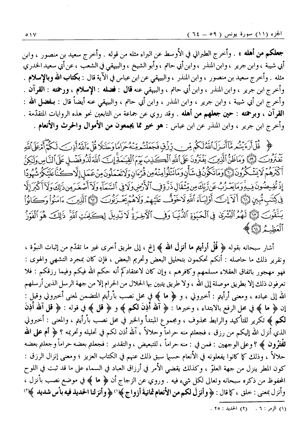 جَعَلَكُمْ مِنْ أَهْلِهِ» . وَأَخْرَجَ الطَّبَرَانِيُّ فِي الْأَوْسَطِ عَنِ الْبَرَاءِ مِثْلَهُ مِنْ قَوْلِهِ. وَأَخْرَجَ سَعِيدُ بْنُ مَنْصُورٍ، وَابْنُ أَبِي شَيْبَةَ، وَابْنُ جَرِيرٍ، وَابْنُ الْمُنْذِرِ، وَابْنُ أَبِي حَاتِمٍ، وَأَبُو الشَّيْخِ، وَالْبَيْهَقِيُّ فِي الشُّعَبِ، عَنْ أَبِي سَعِيدٍ الْخُدْرِيِّ مِثْلَهُ. وَأَخْرَجَ سَعِيدُ بْنُ مَنْصُورٍ، وَابْنُ الْمُنْذِرِ، وَالْبَيْهَقِيُّ عَنِ ابْنِ عَبَّاسٍ فِي الْآيَةِ قَالَ: بِكِتَابِ اللَّهِ وَبِالْإِسْلَامِ.
