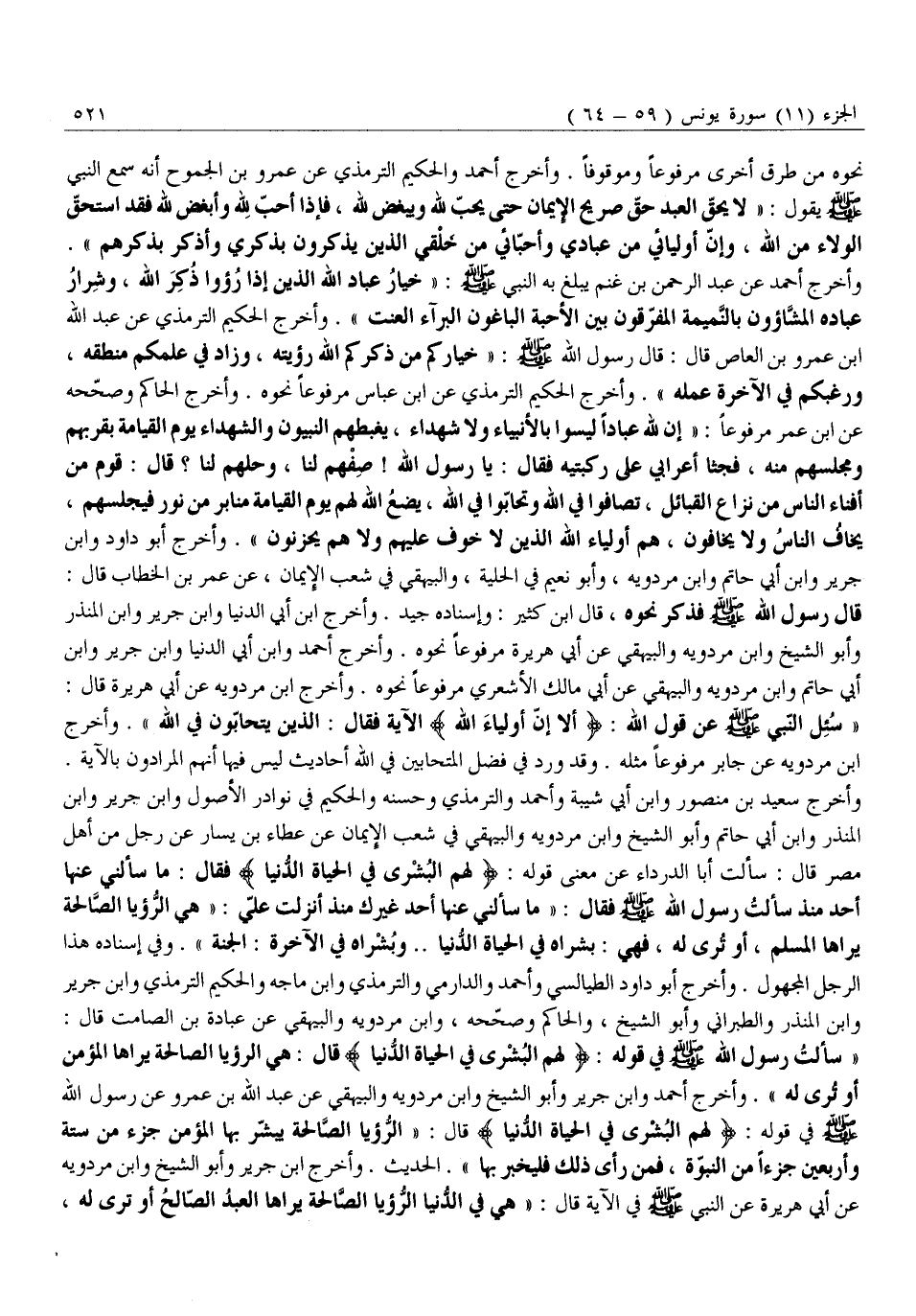 وَأَخْرَجَ أَحْمَدُ عَنْ عَبْدِ الرَّحْمَنِ بْنِ غَنْمٍ يَبْلُغُ بِهِ النَّبِيَّ صَلَّى اللَّهُ عَلَيْهِ وَسَلَّمَ: «خيار عباد الله الذين إذا رأوا ذُكِرَ اللَّهُ، وَشَرَارُ عِبَادِهِ الْمَشَّاءُونَ بِالنَّمِيمَةِ الْمُفَرِّقُونَ بَيْنَ الْأَحِبَّةِ الْبَاغُونَ الْبُرَآءَ الْعَنَتَ» . وَأَخْرَجَ الْحَكِيمُ الترمذي عن عبد الله ابن عَمْرِو بْنِ الْعَاصِ قَالَ: قَالَ رَسُولُ اللَّهِ صَلَّى اللَّهُ عَلَيْهِ وَسَلَّمَ: «خِيَارُكُمْ مَنْ ذَكَّرَكُمُ اللَّهَ رُؤْيَتُهُ، وَزَادَ فِي عِلْمِكُمْ مَنْطِقُهُ، وَرَغَّبَكُمْ فِي الْآخِرَةِ عَمَلُهُ» . وَأَخْرَجَ الْحَكِيمُ التِّرْمِذِيُّ عَنِ ابْنِ عَبَّاسٍ مَرْفُوعًا نَحْوَهُ. وَأَخْرَجَ الْحَاكِمُ وَصَحَّحَهُ عَنِ ابْنِ عُمَرَ مَرْفُوعًا: «إِنَّ لِلَّهِ عِبَادًا لَيْسُوا بِالْأَنْبِيَاءِ وَلَا شُهَدَاءَ، يَغْبِطُهُمُ النَّبِيُّونَ وَالشُّهَدَاءُ يَوْمَ الْقِيَامَةِ بِقُرْبِهِمْ وَمَجْلِسِهِمْ مِنْهُ، فَجَثَا أَعْرَابِيٌّ عَلَى رُكْبَتَيْهِ فَقَالَ: يا رسول الله! صفهم لنا، وحلهم لَنَا؟ قَالَ: قَوْمٌ مِنْ أَفْنَاءِ النَّاسِ مِنْ نُزَّاعِ الْقَبَائِلِ، تَصَافَوْا فِي اللَّهِ وَتَحَابُّوا فِي اللَّهِ، يَضَعُ اللَّهُ لَهُمْ يَوْمَ الْقِيَامَةِ مَنَابِرَ مِنْ نُورٍ فَيُجْلِسُهُمْ، يَخَافُ النَّاسُ وَلَا يَخَافُونَ، هُمْ أَوْلِيَاءُ اللَّهِ الَّذِينَ لَا خَوْفٌ عَلَيْهِمْ وَلَا هُمْ يَحْزَنُونَ» . وَأَخْرَجَ أَبُو دَاوُدَ وَابْنُ جَرِيرٍ وَابْنُ أَبِي حَاتِمٍ وَابْنُ مَرْدَوَيْهِ، وَأَبُو نُعَيْمٍ فِي الْحِلْيَةِ، وَالْبَيْهَقِيُّ فِي شُعَبِ الْإِيمَانِ، عَنْ عُمَرَ بْنِ الْخَطَّابِ قَالَ: