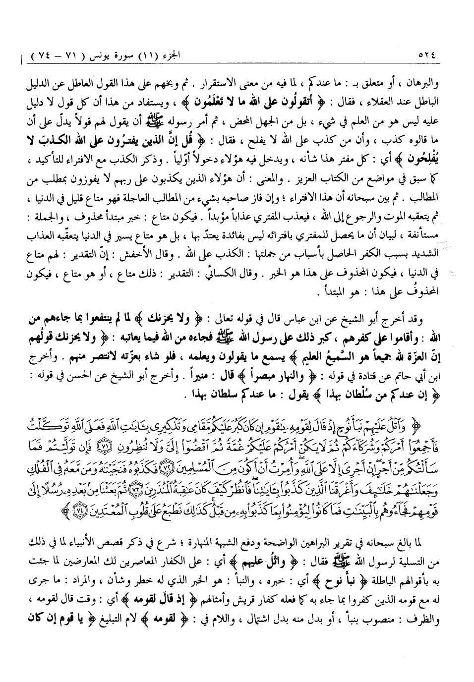 وَاتْلُ عَلَيْهِمْ نَبَأَ نُوحٍ إِذْ قالَ لِقَوْمِهِ يَا قَوْمِ إِنْ كانَ كَبُرَ عَلَيْكُمْ مَقامِي وَتَذْكِيرِي بِآياتِ اللَّهِ فَعَلَى اللَّهِ تَوَكَّلْتُ فَأَجْمِعُوا أَمْرَكُمْ وَشُرَكاءَكُمْ ثُمَّ لَا يَكُنْ أَمْرُكُمْ عَلَيْكُمْ غُمَّةً ثُمَّ اقْضُوا إِلَيَّ وَلا تُنْظِرُونِ (71) فَإِنْ تَوَلَّيْتُمْ فَما سَأَلْتُكُمْ مِنْ أَجْرٍ إِنْ أَجْرِيَ إِلاَّ عَلَى اللَّهِ وَأُمِرْتُ أَنْ أَكُونَ مِنَ الْمُسْلِمِينَ (72) فَكَذَّبُوهُ فَنَجَّيْناهُ وَمَنْ مَعَهُ فِي الْفُلْكِ وَجَعَلْناهُمْ خَلائِفَ وَأَغْرَقْنَا الَّذِينَ كَذَّبُوا بِآياتِنا فَانْظُرْ كَيْفَ كانَ عاقِبَةُ الْمُنْذَرِينَ (73) ثُمَّ بَعَثْنا مِنْ بَعْدِهِ رُسُلاً إِلى قَوْمِهِمْ فَجاؤُهُمْ بِالْبَيِّناتِ فَما كانُوا لِيُؤْمِنُوا بِما كَذَّبُوا بِهِ مِنْ قَبْلُ كَذلِكَ نَطْبَعُ عَلى قُلُوبِ الْمُعْتَدِينَ (74)