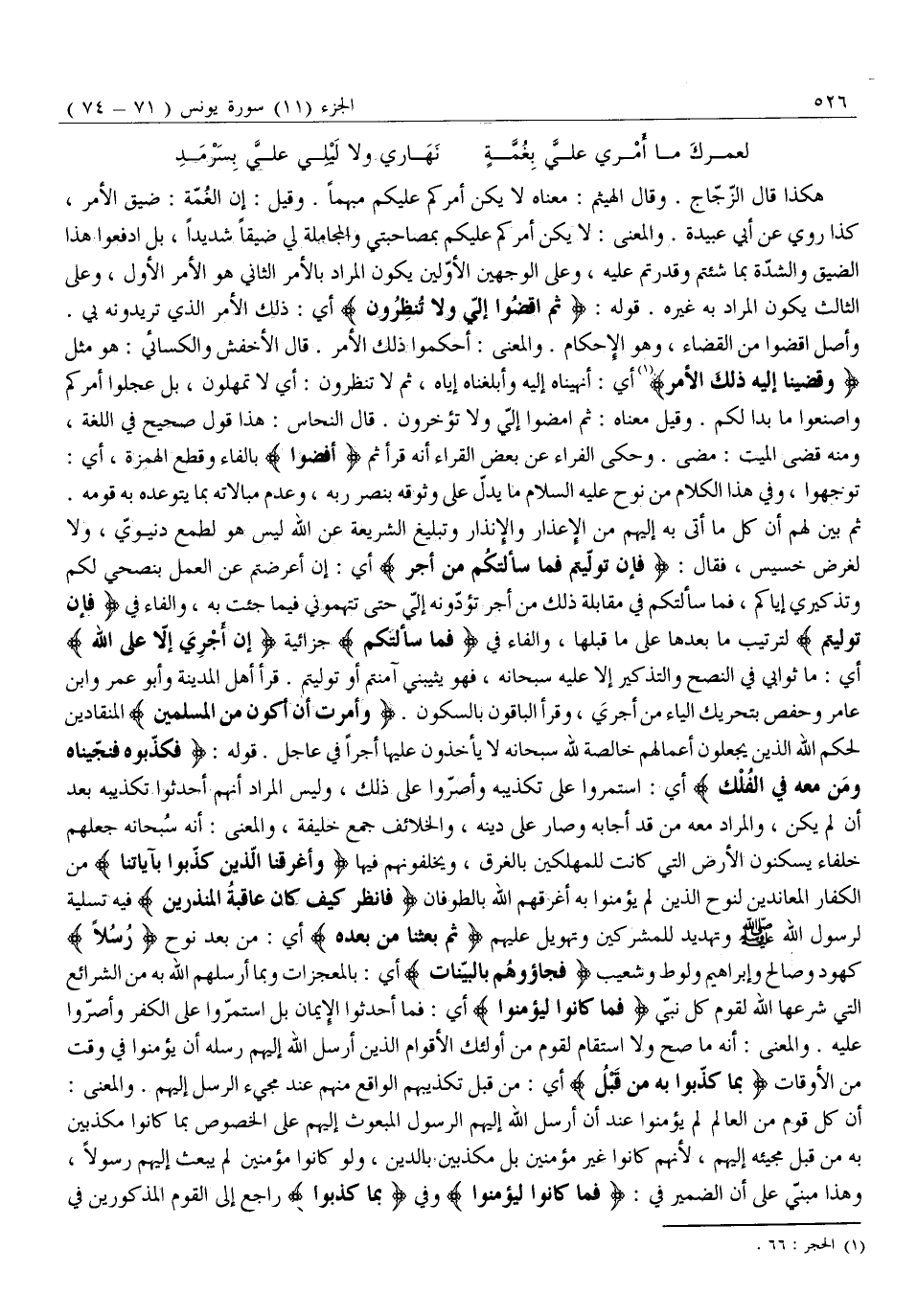 ثُمَّ بَيَّنَ لَهُمْ أَنَّ كُلَّ مَا أَتَى بِهِ إِلَيْهِمْ مِنَ الْإِعْذَارِ وَالْإِنْذَارِ وَتَبْلِيغِ الشَّرِيعَةِ عَنِ اللَّهِ لَيْسَ هُوَ لِطَمَعٍ دُنْيَوِيٍّ، وَلَا لِغَرَضٍ خَسِيسٍ، فَقَالَ: فَإِنْ تَوَلَّيْتُمْ فَما سَأَلْتُكُمْ مِنْ أَجْرٍ أَيْ: إِنْ أَعْرَضْتُمْ عَنِ الْعَمَلِ بِنُصْحِي لَكُمْ وَتَذْكِيرِي إِيَّاكُمْ، فَمَا سَأَلْتُكُمْ فِي مُقَابَلَةِ ذَلِكَ مِنْ أَجْرٍ تُؤَدُّونَهُ إِلَيَّ حَتَّى تَتَّهِمُونِي فِيمَا جِئْتُ بِهِ، وَالْفَاءُ فِي فَإِنْ تَوَلَّيْتُمْ لِتَرْتِيبِ مَا بَعْدَهَا عَلَى مَا قَبْلَهَا، وَالْفَاءُ فِي فَما سَأَلْتُكُمْ جَزَائِيَّةٌ إِنْ أَجْرِيَ إِلَّا عَلَى اللَّهِ أَيْ: مَا ثَوَابِي فِي النُّصْحِ وَالتَّذْكِيرِ إِلَّا عَلَيْهِ سُبْحَانَهُ، فَهُوَ يُثِيبُنِي آمَنْتُمْ أَوْ تَوَلَّيْتُمْ. قَرَأَ أَهْلُ الْمَدِينَةِ وَأَبُو عُمَرَ وَابْنُ عَامِرٍ وَحَفْصٌ بِتَحْرِيكِ الْيَاءِ مِنْ أَجْرِيَ، وَقَرَأَ الْبَاقُونَ بِالسُّكُونِ. وَأُمِرْتُ أَنْ أَكُونَ مِنَ الْمُسْلِمِينَ الْمُنْقَادِينَ لِحُكْمِ اللَّهِ الَّذِينَ يَجْعَلُونَ أَعْمَالَهُمْ خَالِصَةً لِلَّهِ سُبْحَانَهُ لَا يَأْخُذُونَ عَلَيْهَا أَجْرًا فِي عَاجِلٍ. قَوْلُهُ: فَكَذَّبُوهُ فَنَجَّيْناهُ وَمَنْ مَعَهُ فِي الْفُلْكِ أَيِ: اسْتَمَرُّوا عَلَى تَكْذِيبِهِ وَأَصَرُّوا عَلَى ذَلِكَ، وَلَيْسَ الْمُرَادُ أَنَّهُمْ أَحْدَثُوا تَكْذِيبَهُ بعد أن لم يكن، والمراد مَعَهُ مَنْ قَدْ أَجَابَهُ وَصَارَ عَلَى دِينِهِ، وَالْخَلَائِفُ جَمْعُ خَلِيفَةٍ، وَالْمَعْنَى: أَنَّهُ سُبْحَانَهُ جَعَلَهُمْ خُلَفَاءَ يَسْكُنُونَ الْأَرْضَ الَّتِي كَانَتْ لِلْمُهْلَكِينَ بِالْغَرَقِ، وَيَخْلُفُونَهُمْ فِيهَا وَأَغْرَقْنَا الَّذِينَ كَذَّبُوا بِآياتِنا مِنَ الْكُفَّارِ الْمُعَانِدِينَ لِنُوحٍ الَّذِينَ لَمْ يُؤْمِنُوا بِهِ أَغْرَقَهُمُ اللَّهُ بِالطُّوفَانِ فَانْظُرْ كَيْفَ كانَ عاقِبَةُ الْمُنْذَرِينَ فِيهِ تَسْلِيَةٌ لِرَسُولِ اللَّهِ صَلَّى اللَّهُ عَلَيْهِ وَسَلَّمَ وَتَهْدِيدٌ لِلْمُشْرِكِينَ وَتَهْوِيلٌ عَلَيْهِمْ ثُمَّ بَعَثْنا مِنْ بَعْدِهِ أَيْ: مِنْ بَعْدِ نُوحٍ رُسُلًا كهود وصالح وإبراهيم ولوط وشعيب فَجاؤُهُمْ بِالْبَيِّناتِ أَيْ: بِالْمُعْجِزَاتِ وَبِمَا أَرْسَلَهُمُ اللَّهُ بِهِ مِنَ الشَّرَائِعِ الَّتِي شَرَعَهَا اللَّهُ لِقَوْمِ كُلِّ نَبِيٍّ فَما كانُوا لِيُؤْمِنُوا أَيْ: فَمَا أَحْدَثُوا الْإِيمَانَ بَلِ اسْتَمَرُّوا عَلَى الْكُفْرِ وَأَصَرُّوا عَلَيْهِ. وَالْمَعْنَى: أَنَّهُ مَا صَحَّ وَلَا اسْتَقَامَ لِقَوْمٍ مِنْ أُولَئِكَ الْأَقْوَامِ الَّذِينَ أَرْسَلَ اللَّهُ إِلَيْهِمْ رُسُلَهُ أَنْ يُؤْمِنُوا فِي وَقْتٍ مِنَ الْأَوْقَاتِ بِما كَذَّبُوا بِهِ مِنْ قَبْلُ أَيْ: مِنْ قَبْلِ تَكْذِيبِهِمُ الْوَاقِعِ مِنْهُمْ عِنْدَ مَجِيءِ الرُّسُلِ إِلَيْهِمْ. وَالْمَعْنَى: