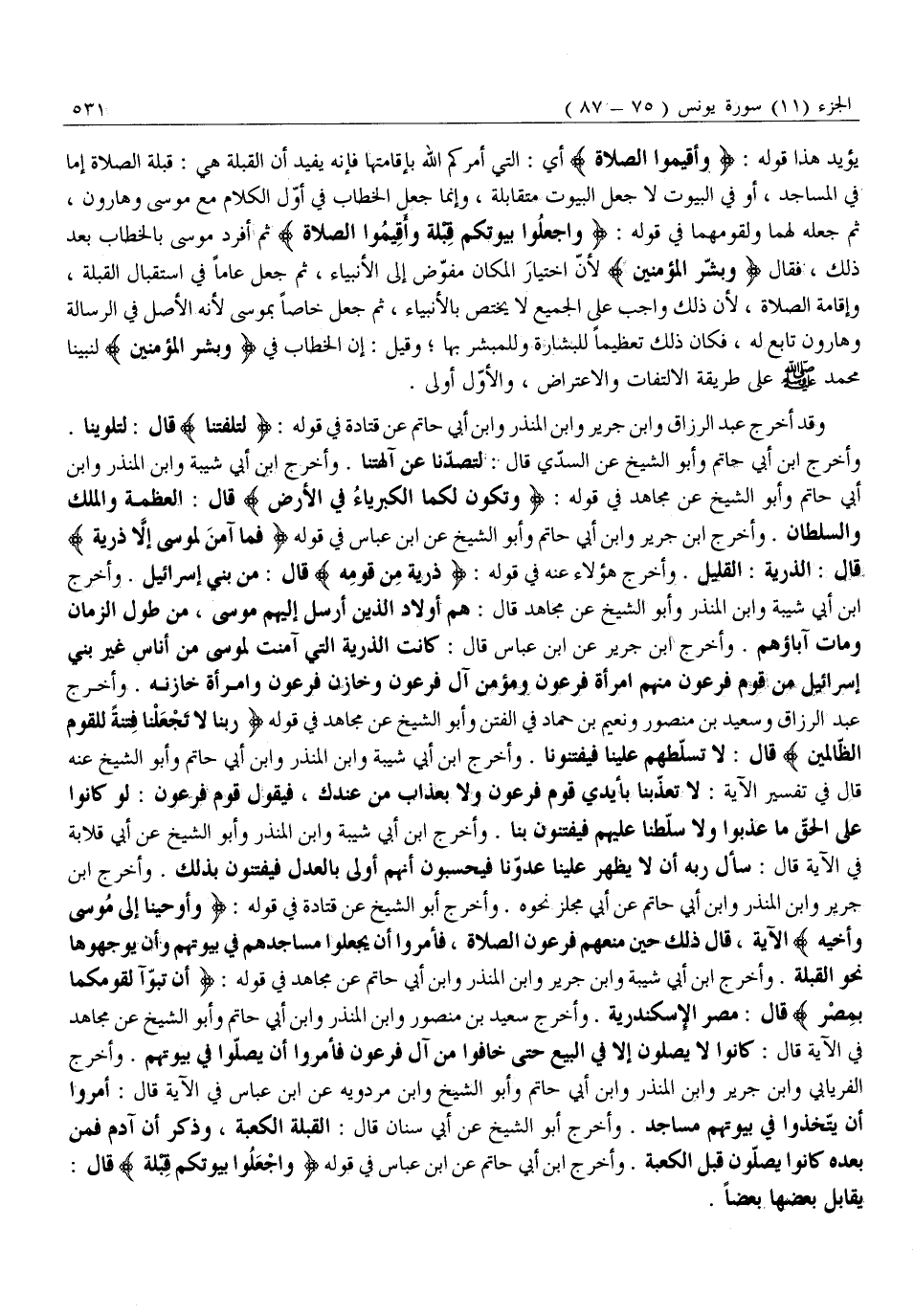 وَأَخْرَجَ ابْنُ أَبِي حَاتِمٍ وَأَبُو الشَّيْخِ عَنْ السُّدِّيِّ قَالَ: لِتَصُدَّنَا عَنْ آلِهَتِنَا. وَأَخْرَجَ ابْنُ أَبِي شَيْبَةَ وَابْنُ الْمُنْذِرِ وَابْنُ أَبِي حَاتِمٍ وَأَبُو الشَّيْخِ عَنْ مُجَاهِدٍ فِي قَوْلِهِ: وَتَكُونَ لَكُمَا الْكِبْرِياءُ فِي الْأَرْضِ قَالَ: الْعَظْمَةُ وَالْمُلْكُ وَالسُّلْطَانُ. وَأَخْرَجَ ابْنُ جَرِيرٍ وَابْنُ أَبِي حَاتِمٍ وَأَبُو الشيخ عن ابْنِ عَبَّاسٍ فِي قَوْلِهِ فَما آمَنَ لِمُوسى إِلَّا ذُرِّيَّةٌ قَالَ: الذَّرِّيَّةُ: الْقَلِيلُ. وَأَخْرَجَ هَؤُلَاءِ عَنْهُ فِي قَوْلِهِ: ذُرِّيَّةٌ مِنْ قَوْمِهِ قَالَ: مِنْ بَنِي إِسْرَائِيلَ. وَأَخْرَجَ ابْنُ أَبِي شَيْبَةَ وَابْنُ الْمُنْذِرِ وَأَبُو الشَّيْخِ عَنْ مُجَاهِدٍ قَالَ: هُمْ أَوْلَادُ الَّذِينَ أُرْسِلَ إِلَيْهِمْ مُوسَى، مِنْ طُولِ الزَّمَانِ وَمَاتَ آبَاؤُهُمْ. وَأَخْرَجَ ابْنُ جَرِيرٍ عَنِ ابْنِ عَبَّاسٍ قَالَ: كَانَتِ الذُّرِّيَّةُ الَّتِي آمَنَتْ لِمُوسَى مِنْ أُنَاسٍ غَيْرِ بَنِي إِسْرَائِيلَ مِنْ قَوْمِ فِرْعَوْنَ مِنْهُمُ امْرَأَةُ فِرْعَوْنَ وَمُؤْمِنُ آلِ فِرْعَوْنَ وَخَازِنُ فِرْعَوْنَ وَامْرَأَةُ خَازِنِهِ. وَأَخْرَجَ عَبْدُ الرَّزَّاقِ وَسَعِيدُ بْنُ مَنْصُورٍ وَنُعَيْمُ بْنُ حَمَّادٍ فِي الْفِتَنِ وَأَبُو الشَّيْخِ عَنْ مُجَاهِدٍ فِي قَوْلِهِ رَبَّنا لَا تَجْعَلْنا فِتْنَةً لِلْقَوْمِ الظَّالِمِينَ قَالَ: لَا تُسَلِّطْهُمْ عَلَيْنَا فَيَفْتِنُونَا. وَأَخْرَجَ ابْنُ أَبِي شَيْبَةَ وَابْنُ الْمُنْذِرِ وَابْنُ أَبِي حَاتِمٍ وَأَبُو الشَّيْخِ عَنْهُ قَالَ فِي تَفْسِيرِ الْآيَةِ: لَا تُعَذِّبْنَا بِأَيْدِي قَوْمِ فِرْعَوْنَ وَلَا بِعَذَابٍ مِنْ عِنْدِكَ، فَيَقُولُ قَوْمُ فِرْعَوْنَ: لَوْ كَانُوا عَلَى الْحَقِّ مَا عُذِّبُوا وَلَا سُلِّطْنَا عَلَيْهِمْ فَيُفْتَنُونَ بِنَا. وَأَخْرَجَ ابْنُ أَبِي شَيْبَةَ وَابْنُ الْمُنْذِرِ وَأَبُو الشَّيْخِ عَنْ أَبِي قِلَابَةَ فِي الْآيَةِ قَالَ: سَأَلَ رَبَّهُ أَنْ لَا يُظْهِرَ عَلَيْنَا عَدُوَّنَا فَيَحْسَبُونَ أَنَّهُمْ أَوْلَى بِالْعَدْلِ فَيُفْتَنُونَ بِذَلِكَ. وَأَخْرَجَ ابْنُ جَرِيرٍ وَابْنُ الْمُنْذِرِ وَابْنُ أَبِي حَاتِمٍ عَنْ أَبِي مِجْلَزٍ نَحْوَهُ. وَأَخْرَجَ أَبُو الشَّيْخِ عَنْ قَتَادَةَ فِي قَوْلِهِ: وَأَوْحَيْنا إِلى مُوسى وَأَخِيهِ الْآيَةَ، قَالَ ذَلِكَ حِينَ مَنَعَهَمْ فِرْعَوْنُ الصَّلَاةَ، فَأُمِرُوا أَنْ يَجْعَلُوا مَسَاجِدَهُمْ فِي بُيُوتِهِمْ وَأَنْ يُوَجَّهُوهَا نَحْوَ الْقِبْلَةِ. وَأَخْرَجَ ابْنُ أَبِي شَيْبَةَ وَابْنُ جَرِيرٍ وَابْنُ الْمُنْذِرِ وَابْنُ أَبِي حَاتِمٍ عَنْ مُجَاهِدٍ فِي قَوْلِهِ: أَنْ تَبَوَّءا لِقَوْمِكُما بِمِصْرَ قَالَ: مِصْرُ الْإِسْكَنْدَرِيَّةُ. وَأَخْرَجَ سَعِيدُ بْنُ مَنْصُورٍ وَابْنُ الْمُنْذِرِ وَابْنُ أَبِي حَاتِمٍ وَأَبُو الشَّيْخِ عَنْ مُجَاهِدٍ فِي الْآيَةِ قَالَ: كَانُوا لَا يُصَلُّونَ إِلَّا فِي الْبِيَعِ حَتَّى خَافُوا مِنْ آلِ فِرْعَوْنَ فَأُمِرُوا أَنْ يُصَلُّوا فِي بُيُوتِهِمْ. وَأَخْرَجَ الْفِرْيَابِيُّ وَابْنُ جَرِيرٍ وَابْنُ الْمُنْذِرِ وَابْنُ أَبِي حَاتِمٍ وَأَبُو الشَّيْخِ وَابْنُ مَرْدَوَيْهِ عَنِ ابْنِ عَبَّاسٍ فِي الْآيَةِ قَالَ: أُمِرُوا أَنْ يَتَّخِذُوا فِي بُيُوتِهِمْ مَسَاجِدَ. وَأَخْرَجَ أَبُو الشَّيْخِ عَنْ أَبِي سِنَانٍ قَالَ: الْقِبْلَةُ الْكَعْبَةُ، وَذُكِرَ أَنَّ آدَمَ فَمَنْ بَعْدَهُ كَانُوا يُصَلُّونَ قِبَلَ الْكَعْبَةِ. وَأَخْرَجَ ابْنُ أَبِي حَاتِمٍ عَنِ ابْنِ عَبَّاسٍ فِي قَوْلِهِ وَاجْعَلُوا بُيُوتَكُمْ قِبْلَةً قال: