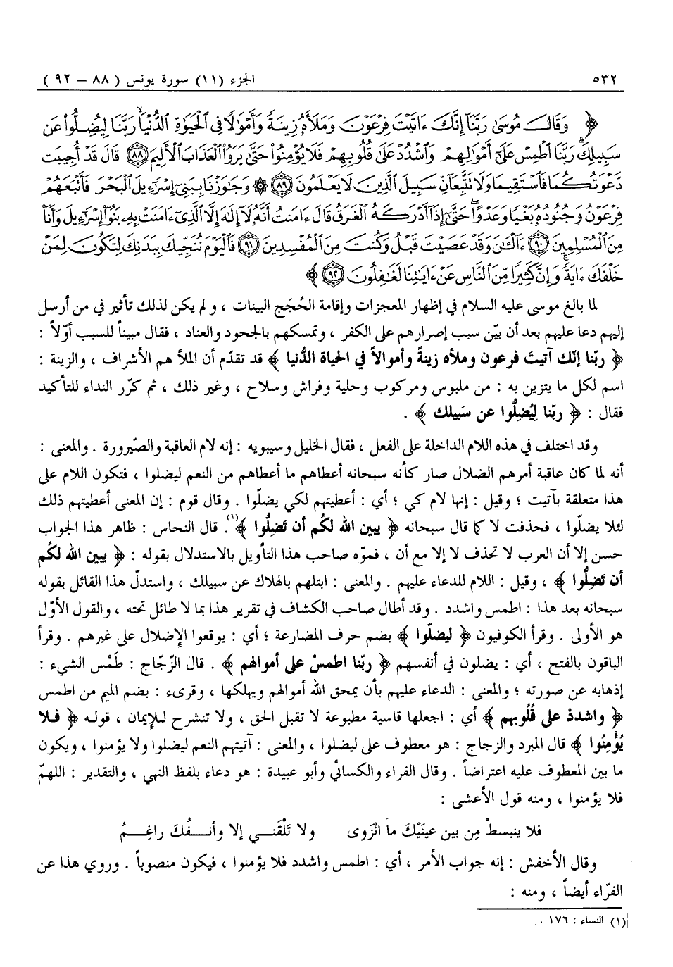 إِذْهَابُهُ عَنْ صُورَتِهِ وَالْمَعْنَى: الدُّعَاءُ عَلَيْهِمْ بِأَنْ يَمْحَقَ اللَّهُ أَمْوَالَهُمْ وَيُهْلِكَهَا، وَقُرِئَ: بِضَمِّ الْمِيمِ مِنِ اطْمُسْ وَاشْدُدْ عَلى قُلُوبِهِمْ أَيِ: اجْعَلْهَا قَاسِيَةً مَطْبُوعَةً لَا تَقْبَلُ الْحَقَّ، وَلَا تَنْشَرِحُ لِلْإِيمَانِ، قَوْلُهُ فَلا يُؤْمِنُوا قَالَ الْمُبَرِّدُ وَالزَّجَّاجُ: هُوَ مَعْطُوفٌ عَلَى لِيُضِلُّوا، وَالْمَعْنَى: آتَيْتَهُمُ النِّعَمَ لِيُضِلُّوا وَلَا يُؤْمِنُوا، وَيَكُونُ ما بين المعطوف عَلَيْهِ اعْتِرَاضًا. وَقَالَ الْفَرَّاءُ وَالْكِسَائِيُّ وَأَبُو عُبَيْدَةَ: هُوَ دُعَاءٌ بِلَفْظِ النَّهْيِ، وَالتَّقْدِيرُ: اللَّهُمَّ فَلَا يُؤْمِنُوا، وَمِنْهُ قَوْلُ الْأَعْشَى: