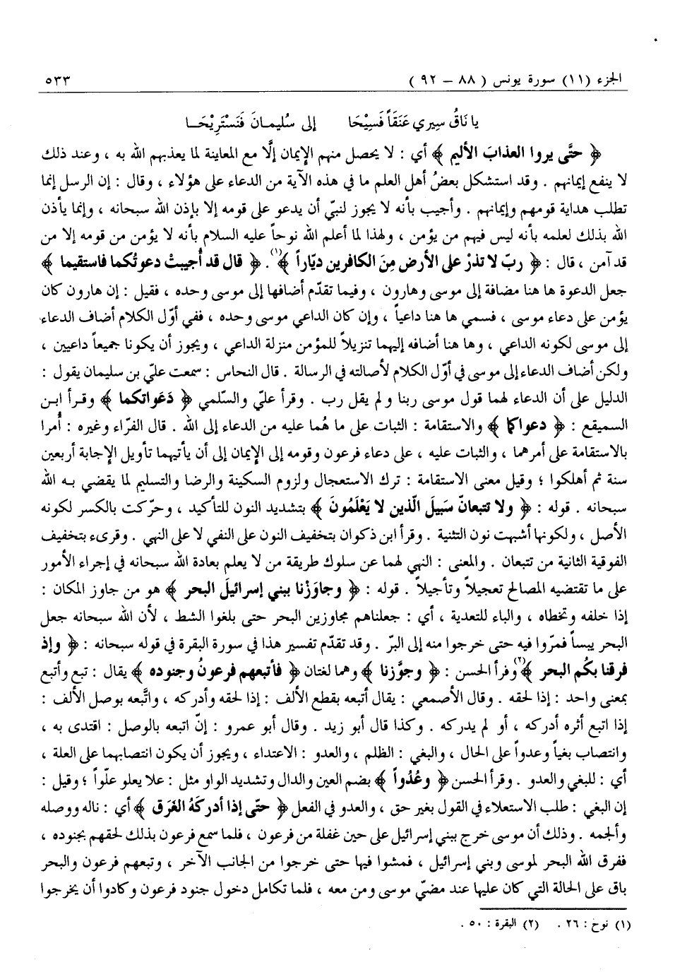الدَّلِيلُ عَلَى أَنَّ الدُّعَاءَ لَهُمَا قَوْلُ مُوسَى رَبَّنَا وَلَمْ يَقُلْ رَبِّ. وقرأ عليّ والسّلمي دعواتكما وقرأ ابن السميقع: دَعْوَاكُمَا وَالِاسْتِقَامَةُ: الثَّبَاتُ عَلَى مَا هُمَا عَلَيْهِ مِنَ الدُّعَاءِ إِلَى اللَّهِ. قَالَ الْفَرَّاءُ وَغَيْرُهُ: أُمِرَا بِالِاسْتِقَامَةِ عَلَى أَمْرِهِمَا، وَالثَّبَاتِ عَلَيْهِ، عَلَى دُعَاءِ فِرْعَوْنَ وَقَوْمِهِ إِلَى الْإِيمَانِ إِلَى أَنْ يَأْتِيَهُمَا تَأْوِيلُ الْإِجَابَةِ أَرْبَعِينَ سَنَةً ثُمَّ أُهْلِكُوا وَقِيلَ مَعْنَى الِاسْتِقَامَةِ: تَرْكُ الِاسْتِعْجَالِ وَلُزُومُ السَّكِينَةِ وَالرِّضَا وَالتَّسْلِيمُ لِمَا يَقْضِي بِهِ اللَّهُ سُبْحَانَهُ. قَوْلُهُ: وَلا تَتَّبِعانِّ سَبِيلَ الَّذِينَ لَا يَعْلَمُونَ بِتَشْدِيدِ النُّونِ لِلتَّأْكِيدِ، وَحُرِّكَتْ بِالْكَسْرِ لِكَوْنِهِ الْأَصْلَ، وَلِكَوْنِهَا أَشْبَهَتْ نُونَ التَّثْنِيَةِ. وَقَرَأَ ابْنُ ذَكْوَانَ بِتَخْفِيفِ النُّونِ عَلَى النَّفْيِ لَا عَلَى النَّهْيِ. وَقُرِئَ بِتَخْفِيفِ الْفَوْقِيَّةِ الثَّانِيَةِ مِنْ تَتَّبِعَانِّ. وَالْمَعْنَى: النَّهْيُ لَهُمَا عَنْ سُلُوكِ طَرِيقَةِ مَنْ لَا يَعْلَمُ بِعَادَةِ اللَّهِ سُبْحَانَهُ فِي إِجْرَاءِ الْأُمُورِ عَلَى مَا تَقْتَضِيهِ الْمَصَالِحُ تَعْجِيلًا وَتَأْجِيلًا. قَوْلُهُ: وَجاوَزْنا بِبَنِي إِسْرائِيلَ الْبَحْرَ هُوَ مِنْ جَاوَزَ الْمَكَانَ: