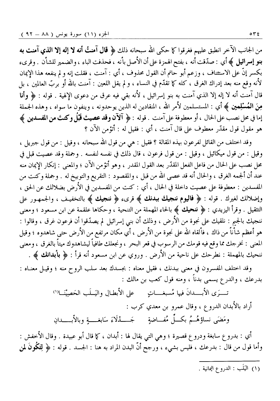 وَقَدِ اخْتُلِفَ مَنِ الْقَائِلُ لِفِرْعَوْنَ بِهَذِهِ الْمَقَالَةِ؟ فَقِيلَ: هِيَ مِنْ قَوْلِ اللَّهِ سُبْحَانَهُ، وَقِيلَ: مِنْ قَوْلِ جِبْرِيلَ، وَقِيلَ: مِنْ قَوْلِ مِيكَائِيلَ، وَقِيلَ: مِنْ قَوْلِ فِرْعَوْنَ، قَالَ ذَلِكَ فِي نَفْسِهِ لِنَفْسِهِ. وَجُمْلَةُ وَقَدْ عَصَيْتَ قَبْلُ فِي مَحَلِّ نَصْبٍ عَلَى الْحَالِ مِنْ فَاعِلِ الْفِعْلِ الْمُقَدَّرِ بَعْدَ الْقَوْلِ الْمُقَدَّرِ، وَهُوَ أَتُؤْمِنُ الْآنَ وَالْمَعْنَى: إِنْكَارُ الْإِيمَانِ مِنْهُ عِنْدَ أَنْ أَلْجَمَهُ الْغَرَقُ، وَالْحَالُ أَنَّهُ قَدْ عَصَى اللَّهَ مِنْ قَبْلُ، وَالْمَقْصُودُ: التَّقْرِيعُ وَالتَّوْبِيخُ لَهُ. وَجُمْلَةُ وَكُنْتَ مِنَ الْمُفْسِدِينَ: مَعْطُوفَةٌ عَلَى عَصَيْتَ دَاخِلَةٌ فِي الْحَالِ، أَيْ: كُنْتَ مِنَ الْمُفْسِدِينَ فِي الْأَرْضِ بِضَلَالِكَ عَنِ الْحَقِّ، وَإِضْلَالِكَ لِغَيْرِكَ. قَوْلُهُ: فَالْيَوْمَ نُنَجِّيكَ بِبَدَنِكَ قُرِئَ نُنَجِّيكَ بِالتَّخْفِيفِ، وَالْجُمْهُورُ عَلَى التَّثْقِيلِ. وَقَرَأَ الْيَزِيدِيُّ: نُنَحِّيكَ بِالْحَاءِ الْمُهْمَلَةِ مِنَ التَّنْحِيَةِ، وَحَكَاهَا عَلْقَمَةُ عَنِ ابْنِ مَسْعُودٍ وَمَعْنَى نُنَجِّيكَ بِالْجِيمِ: نُلْقِيكَ عَلَى نَجْوَةٍ مِنَ الْأَرْضِ، وَذَلِكَ أَنَّ بَنِي إِسْرَائِيلَ لَمْ يُصَدِّقُوا أَنَّ فِرْعَوْنَ غَرِقَ، وَقَالُوا: